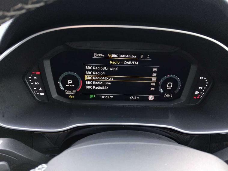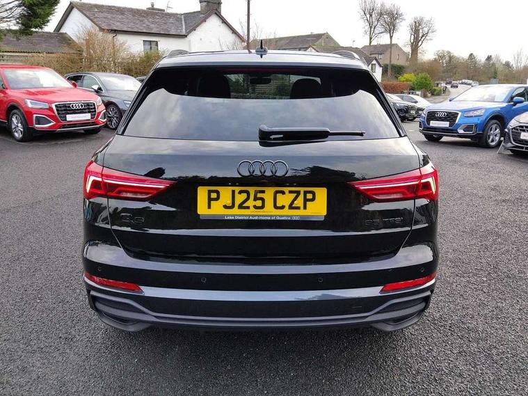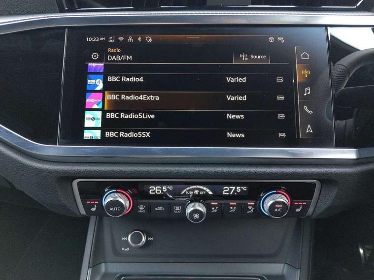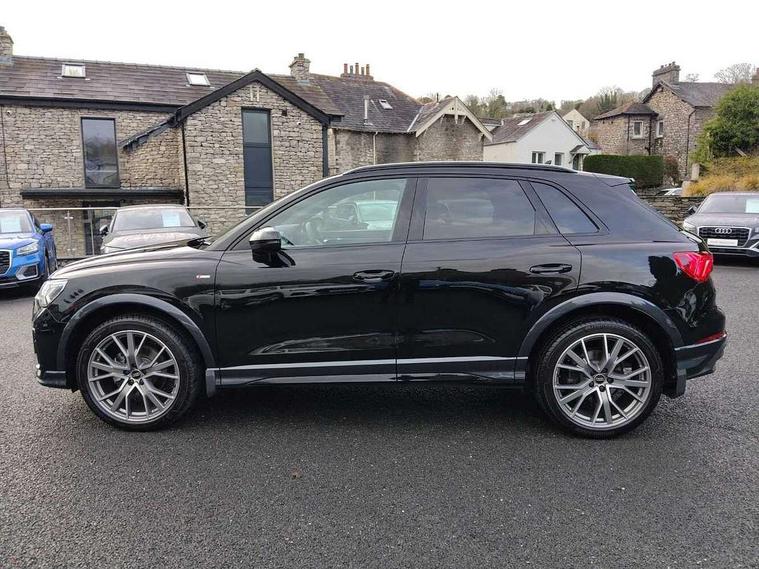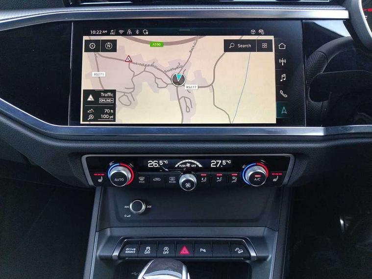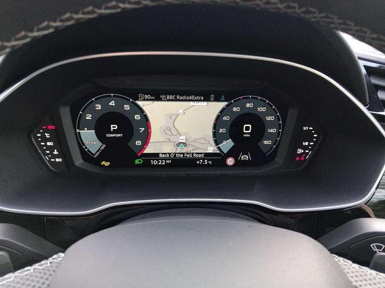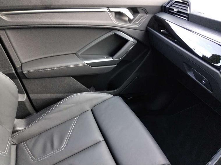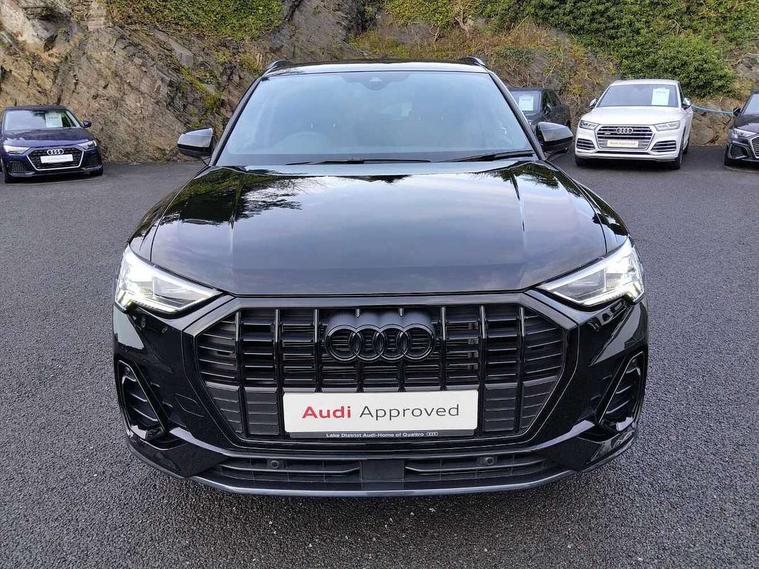 Amazon alexa Integration, Audi connect safety and service, Audi drive select, Audi lane departure warning, Audi Virtual Cockpit - 10.25" display, Bluetooth interface, Camera based traffic sign recognition, Distraction and Fatigue warning, Legal emergency call, MMI Navigation Plus with high resolution 10.1 inch touchscreen colour display, Power operated tailgate, Progressive steering, Service interval indicator, Smartphone interface includes wireless Apple carplay/Android Auto, Start stop system with recuperation, Voice control system with natural language interaction, Sports suspension, 2 USB-C ports with charge and data functions, 6 passive loudspeakers, DAB digital radio module, Acoustic windscreen, Audi Beam uses LEDs to project the Audi logo onto the ground as you exit your Q3, Auto dimming door mirrors, Auto dimming frameless rear view mirror, Black roof rails, Electrically folding, adjustable and heated door mirrors with integrated LED side indicators and kerb view function for passenger side, Front and rear electric windows, Front fog lights, Grille vertical bars in aluminium silver/Matt, High gloss black finish B and C pillars, LED Dynamic rear indicators, LED headlights with LED daytime running lights, LED rear lights, LED third brake light, Privacy glass dark tinted rear and rear-side windows (from B-pillar backwards), Rain and light sensors, Rear diffuser grille in grained matt black, Rear diffuser strip in matt anthracite black, Rear side wing doors, Rear wiper, S line bumpers in contrasting Manhattan grey, Variable front intermittent wipers, 12V socket in rear centre console, 3 seat bench in 2nd row, 40:20:40 folding with manual adjustment for 60:40 forwards/backwards position and backrest angle, Adjustable rear seat bench/backrest with centre armrest and cupholder, Black cloth headlining, Dual zone electronic climate control, Electric lumbar support, Front and rear black floor mats with contrast stitching in rock grey, Front and rear headrests, Front centre armrest, Height and reach adjustable steering wheel, Illuminated door sill trims with S logo, ISOFIX child seat mounting for front passenger with airbag deactivation and outer rear seat including top tether attachment point for outer rear seats, Manual front seats with height adjustment, Perforated leather gearknob, Single front passenger seat, Stainless steel luggage compartment sill finisher, Stainless steel pedals, Twin leather upholstery with front sport seats + S embossing, Black styling pack - Q3, Non smoking pack - Q3, 3x3 point rear seatbelts, 6 airbags - Driver, front passenger, curtain and side windows, Audi pre-sense front with pedestrain and cyclist recognition, Electrically operated child locks on rear doors, Electromechanical parking brake, Electronic stabilisation control including ABS, ASR and EDL, Front seatbelt reminder, Hill descent control, Hill hold assist, Pre sense basic, Seatbelt monitoring, Tyre pressure warning, Warning triangle and first aid kit, Anti theft wheel bolts, Immobiliser, Remote central locking, Thatcham approved category 1 anti theft alarm, Aluminium look interior elements, Detail dashboard around MMI touch colour display in glass look, black with surround in aluminium look, Leatherette door armrest, Piano black inlay,