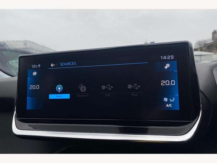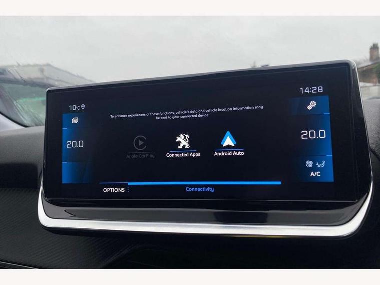 Bluetooth telephone facility, Driver attention warning, Exterior temperature indicator with ice warning, Lane keep assist, Mirror screen with mirror link, apple carplay and android auto, Multi function trip computer, PEUGEOT i-Cockpit with compact steering wheel, PEUGEOT i-Cockpit with configurable 3D headup instrument panel, PEUGEOT SOS and assistance, Push button start, Rear parking sensors, Smart phone docking station, Speed limit recognition and recommendation, Visio Park 1 with 180 degree Colour reversing camera, 2 front USB socket with USB-C, 2x USB sockets in rear, 6 speakers radio with mp3 compatible, DAB Digital radio, Voice recognition for radio, navigation and telephony features, 2 X Rear number plate lights, Automatic hazard light activation upon heavy brake application, Automatic lights, Automatic windscreen wipers, Body coloured exterior door handles, Colour coded door mirror shells, Dark tinted rear side and tailgate windows, Diamond black rear spoiler (roof), Eco LED headlights, Electric front windows + one touch + anti-pinch, Electric rear windows with one touch/anti-pinch, Electrically adjustable, heated and power folding door mirrors, Electrochrome rear view mirror, Follow me home headlights, Front windscreen wiper with magic wash cleaning system, Gloss black finish on B pillar, Gloss black rear cluster connecting strip, Headlights left on audible warning, LED daytime running lights with 3 claw headlight with distinctive tooth design, LED side indicator lights integrated into door mirrors, Model designation badges front and rear, Radiator grille chrome chequered, Rear bumper with gloss black finish, Rear full LED 3D peugeot signature claw effect lights with daylight function, Rear reversing lights, Rear windscreen wiper triggered automatically in reverse gear, Tailgate with heated rear windscreen and wiper blade, 1/3 to 2/3 split folding rear seats, 12V socket, Driver and front passenger comfort seats, Driver and front passenger seat manual adjustment in longitudinal and back rest angle, Driver seat mechanical height adjustment, Dual zone electronic climate control, Electric power steering with reach and rake adjustable steering column, Front centre armrest with storage compartment, Front interior light with 2 reading spotlights, Gear shift indicator, High centre console with 2 cup holders, Leather steering wheel, Map pockets on the backs of the front seats, Piano keys gloss black plated toggle switches to access main functions of the vehicle, Roof lining - light grey, Satin chrome gear lever, Seatbelt unfastened on the move audible and visual alert for front and rear seats, Tri material cloth/leather upholstery, 2x 2nd row ISOFIX child seat mountings, 3 rear 3 point seatbelts, ABS (Anti-lock Braking System) with EBD (Electronic Brakeforce Distribution) and EBA (Emergency Braking Assistance), Child locking functionality on rear doors, Driver and passenger airbags with Passenger airbag deactivation system, Driver/front passenger side airbags, Electric parking brake, ESP with Hill Assist, Front and rear curtain airbags, Front and rear disc brakes, Front optimised safety headrests and 3 x rear retractable headrests with height adjustable, Front three point retractable seatbelts with force limiters, Pedestrians active safety brake, Tyre pressure sensor, Automatic door locking when moving off, Deadlock, Electronic code immobiliser, Thatcham Cat.1 alarm, Carbon effect Dashboard, front and rear door panel finish, 16" Soho diamond cut alloy wheels, Tyre puncture repair kit,