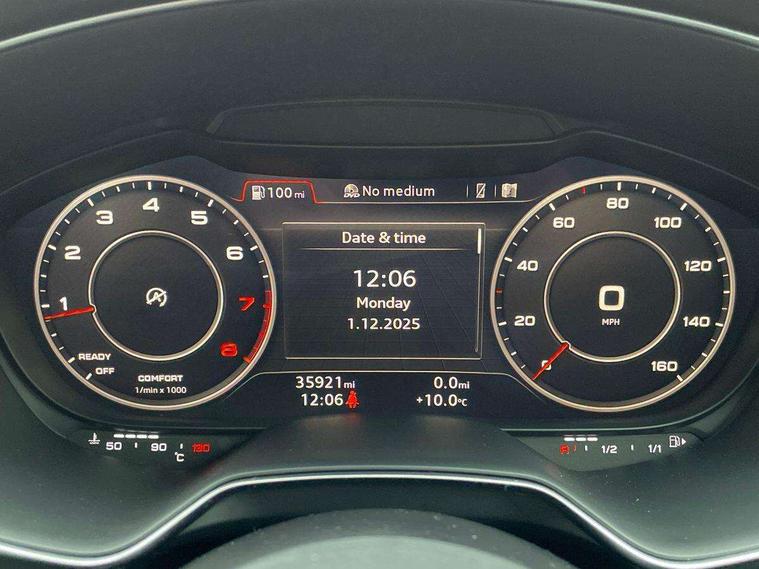 Tyre repair kit, Anti theft alarm, Immobiliser, Keyless Start, Locking wheel bolts, Remote central locking, Audi music interface, Auxiliary input socket, Bluetooth audio streaming, DAB Digital radio, MMI Radio with CD player and SD/XC card slot, 2 rear seatbelts, 3 point front seat belts, ABS, ASR traction control, Curtain airbags, Driver/Front Passenger airbags, EDL traction control, Electromechanical parking brake, ESP, First aid kit, Front passenger airbag deactivation, Front side airbags, Tyre pressure warning, Warning triangle, Auto headlight range control, Body colour bumpers, Body colour door mirrors, Electric front windows, LED daytime running lights, LED rear lights, Retractable rear spoiler, 3 spoke leather multifunction sports steering wheel, Aluminium door sill trims, Front centre armrest, Front head restraints, Front passenger seat isofix location point, Height/reach adjust steering wheel, ISOFIX on outer rear seats, Split folding rear seat, Top tether anchor plate for isofix child seat, Audi drive select, Audi virtual cockpit - 12.3" high-resolution LCD display with fully customisable instrument cluster, Cruise control, MMI touch panel, Mobile phone preparation with bluetooth interface, Progressive power assisted steering, Service interval indicator,
