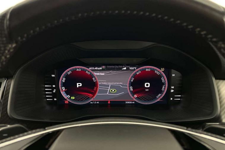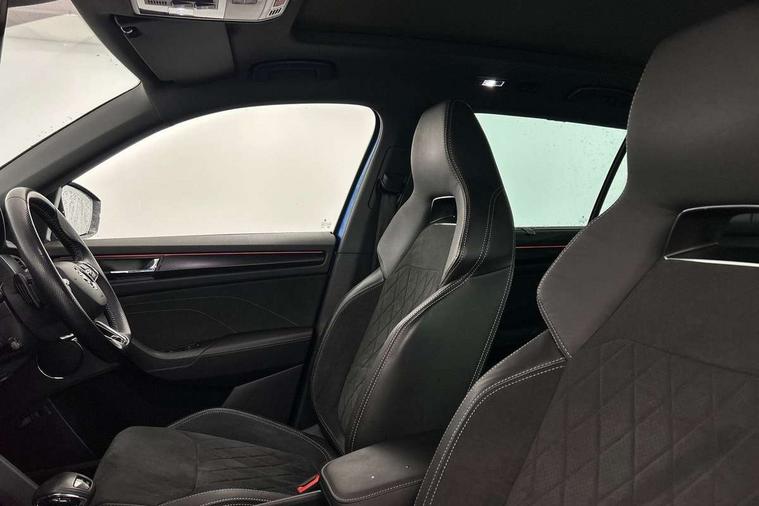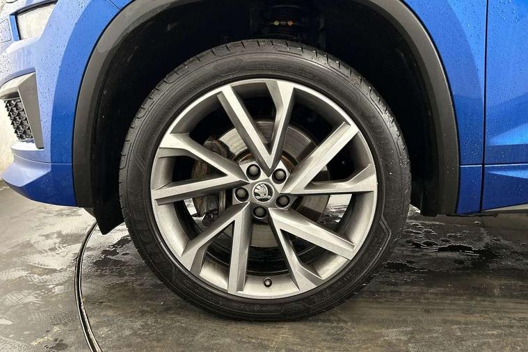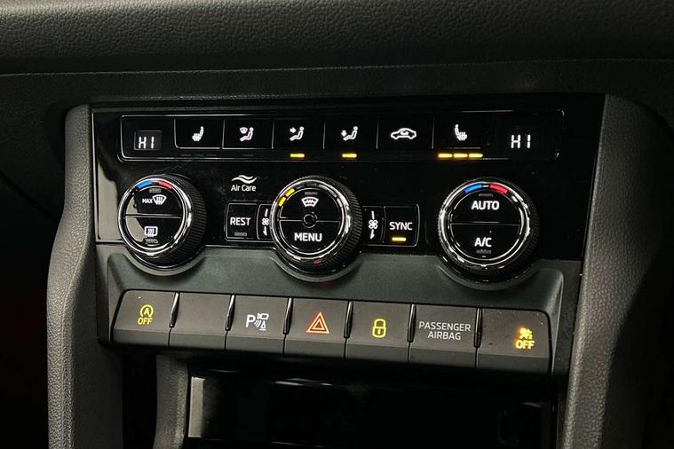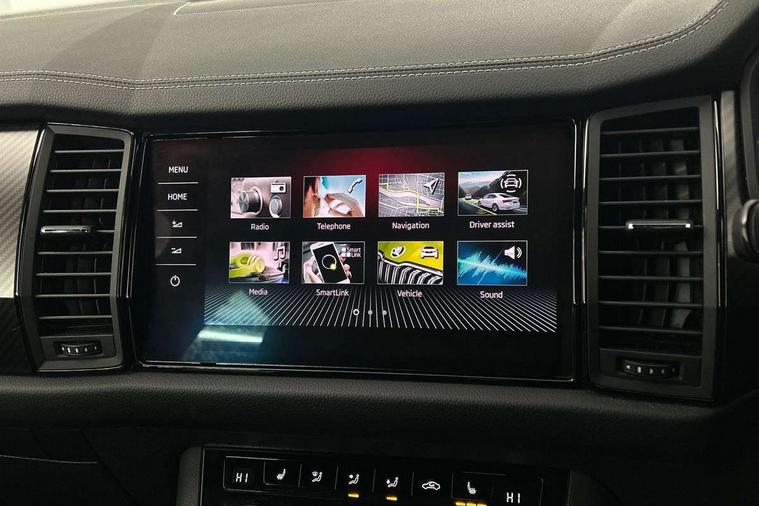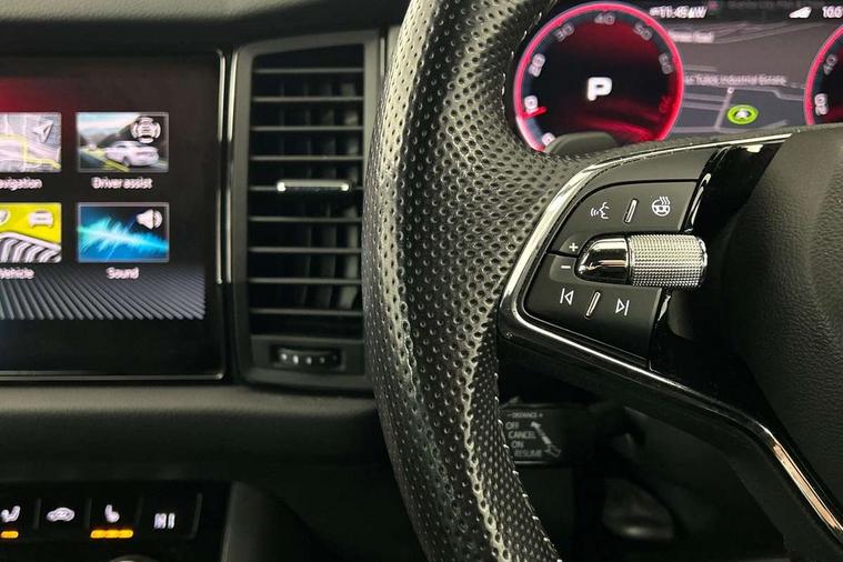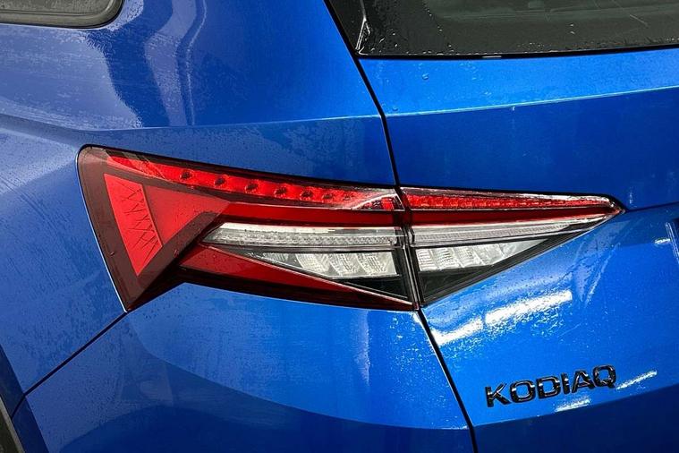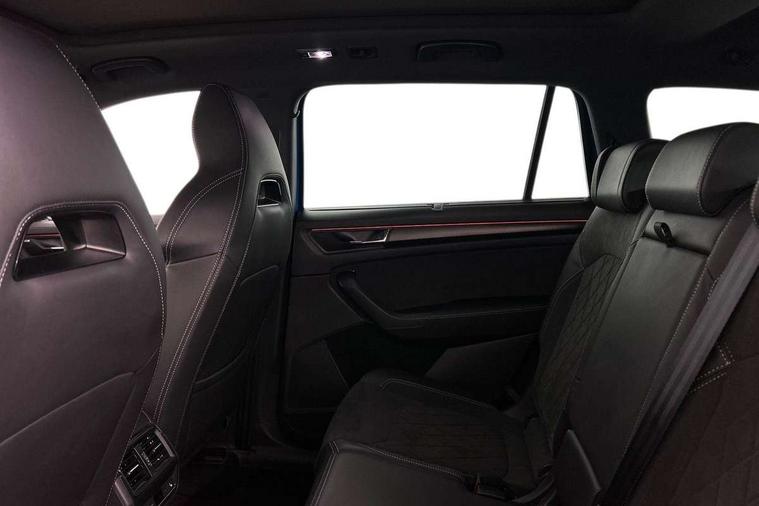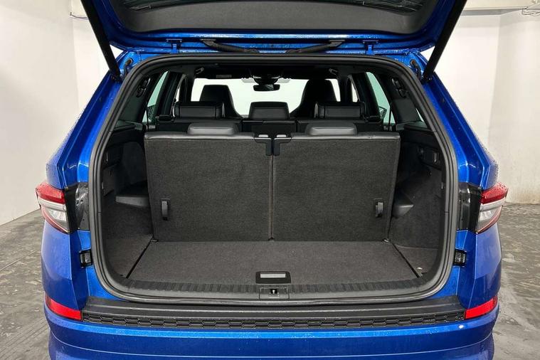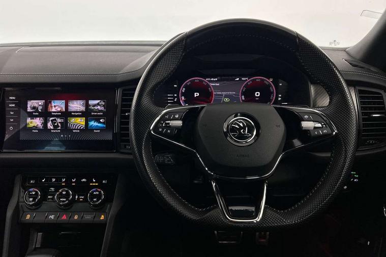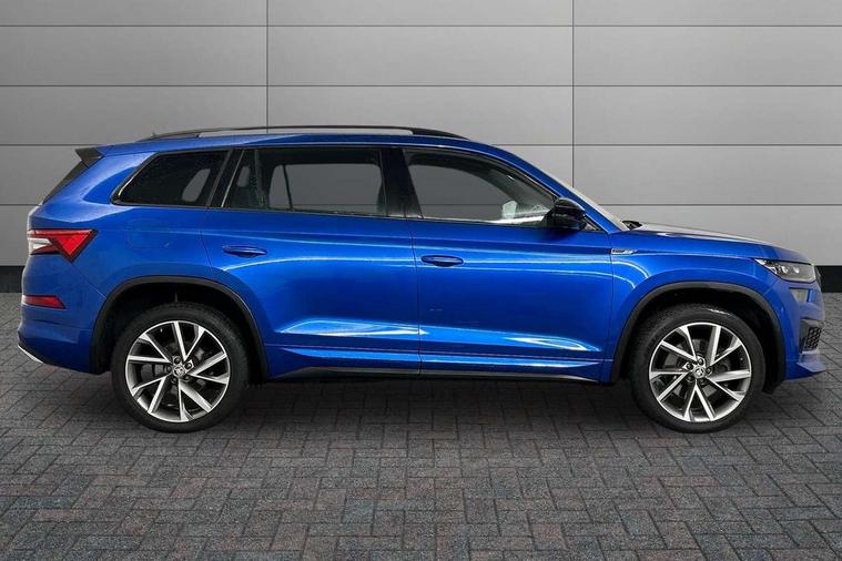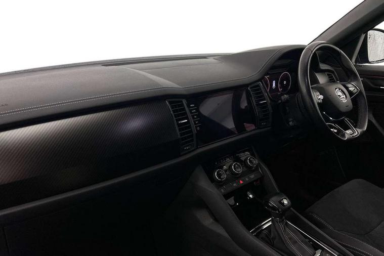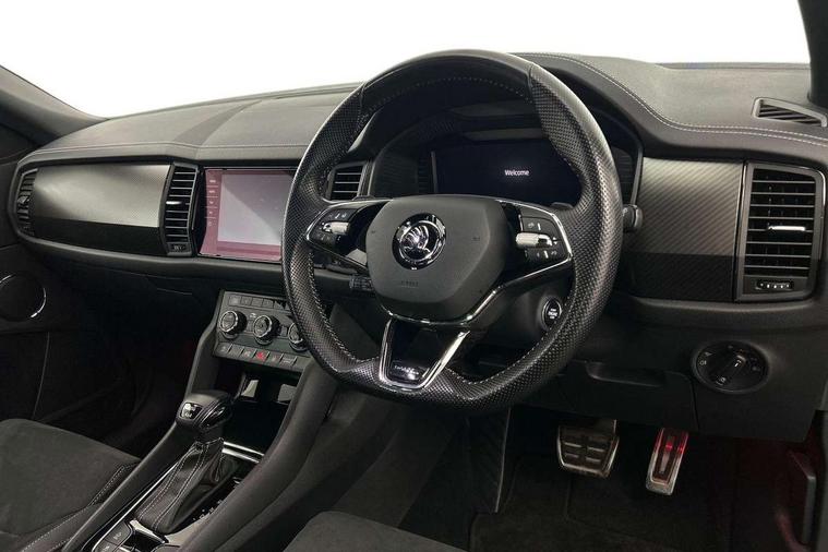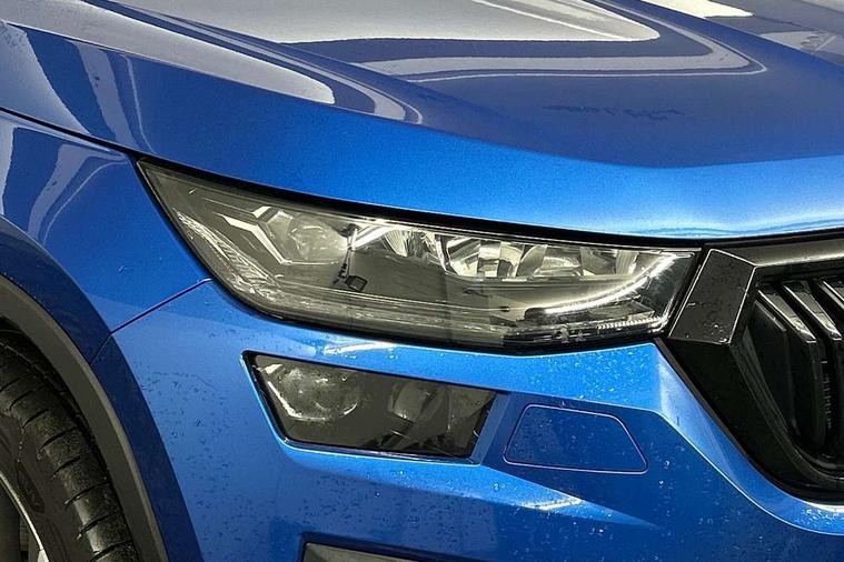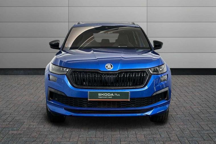 Bluetooth system, Columbus satellite navigation with 9.2" touchscreen, integrated Wi-Fi, web radio, E-call, ECO Stop/start function, Exterior temperature indicator, Progressive steering, Rear view camera, Smartlink wireless for apple carplay and wired for android auto, Speed limiter, Tailgate unlocking from outside, USB C Port x 2 in front centre console, Wireless charging, 8 Speakers, DAB Digital radio, Aero front windscreen wipers with intermittent function, Aero rear window wiper, Auto dimming rear view mirror, Black roof rails, Black sports styling including front grille and window surrounds, Black wheel arch surrounds, Body colour bumpers, Body colour door handles, Electric adjustable/heated/folding door mirrors, driver side auto dimming with boarding sports and memory function, Electric front and rear windows, Extended rear spoiler with finlets in gloss black, Front fog lights, Full LED matrix headlights with AFS (adaptive front light system), cornering function and AWL (all weather lighting system), Gloss black door mirrors, Headlight washers, Heated rear window, Invisible tailpipe, LED daytime running lights, LED rear fog light, LED third brake light in rear spoiler, Light assistant (coming/leaving home/tunnel light), Off-road style lower front bumper element, Privacy glass, Rain and light sensors, Rear diffuser, Rear LED lights (high functionality) with welcome effect and dynamic indicators, Rear side wing doors, Safety reflectors on front and rear doors, Sportline badge on front fender, Sports front and rear bumpers including lower rear chrome strip, Tailgate lettering in Black, Window control switches with black trim, Without engine designation, 12V socket in boot, 2 rails with 2 hooks, 2 seat bench in 3rd row, 3 seat bench in 2nd row, 4 foldable roof handles with rear coat hooks, 60:40 foldable rear seat with sliding adjustment and backrest angle adjustment, Aluminium pedals, Black roof headlining, Bottle holders in door panel in the 1.5 litre front and 1 litre rear, Cargo storage compartments, Chrome headlight control button, Chrome interior door handles, Coat hooks on B pillar, Covered storage compartment on driver side, Decorative door sills in the front and rear, Front centre armrest with storage compartment, cup holder and 12V socket, Front courtesy lights, Gear shift lever with chrome frame and black gloss insert, Grey stitching in front and rear armrests and door armrests + door inserts, Height adjustable front headrests, Illuminated and cooled glovebox, Illuminated luggage compartment, Isofix child seat fittings in outer rear seats with top tether, Manually adjustable steering column, Microsuede door panels, Net programme in boot (1x horizontal Net, 2x vertical Nets), Overhead glasses storage compartment, Pollen filter, Rear centre armrest with cupholders, Single front passenger seat, Sliding trunk cover, Small Bags on the inner sides of the front backrests, Sports seats, Sunvisors with illuminated vanity mirrors, Three rear height adjustable headrests, Ticket holder on A Pillar, Umbrella in door panel, Variable boot floor, LED Interior light pack - Kodiaq, Auto door release and activation of warning lights in the event of an accident, Child locks on rear doors, Driver and front passenger airbag with knee airbag and front passenger airbag deactivation, Electronic parking brake with hill start assist, Emergency rear braking signal, ESC (incl. ABS+MSR+ASR+EDS+HBA+DSR+RBS+MKB), Front assist with autonomous emergency braking, Front side airbags with curtain airbags, Fuel cut off safety device, Height adjustable front 3 point seatbelts + pretensioners, Hill hold control, Rear disc brakes, Safety vest holder in door, Seat belt reminder for all seats, Three point rear seat belts, Two tone horn, Tyre pressure monitor, Alarm with interior monitoring and tilt sensor with safe function, Anti-theft wheel bolts, Immobiliser, Keyless entry and start system (KESSY), Remote central locking with 2 keys, Black air vent surround, Carbon finish dashboard and door inserts, Grey stitching in dashboard, 20" Vega Anthracite alloy wheels, Temporary spare wheel (space saver),