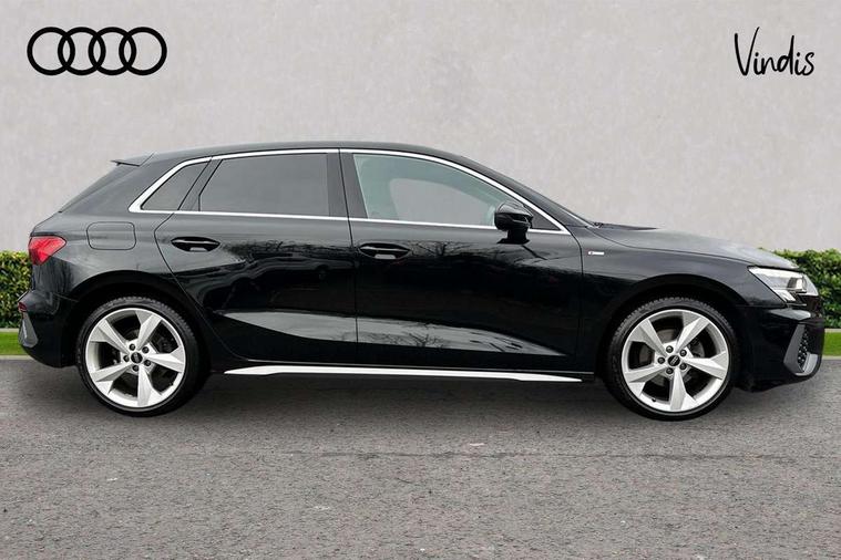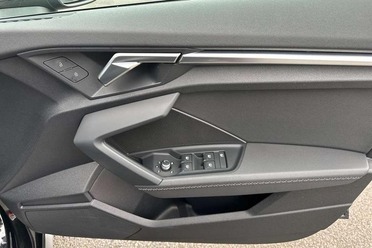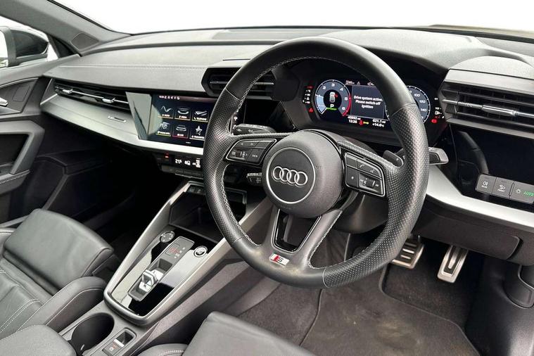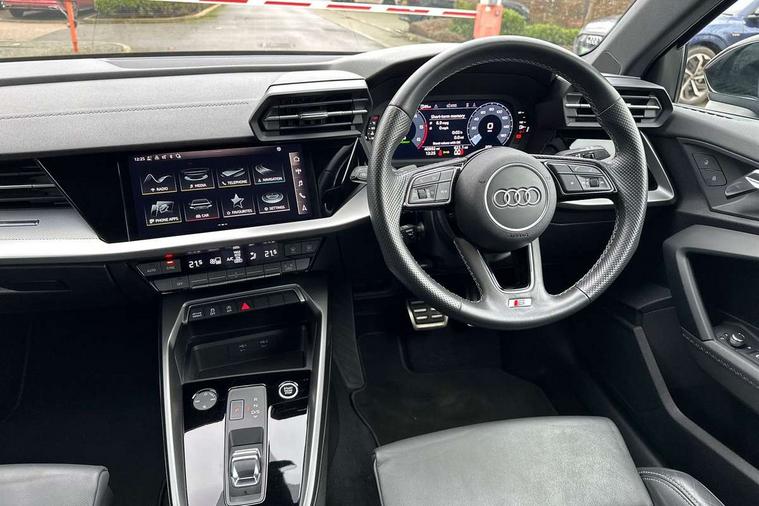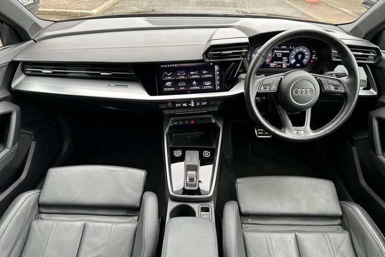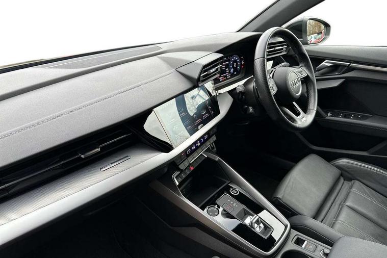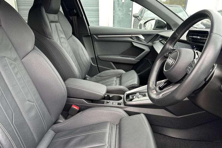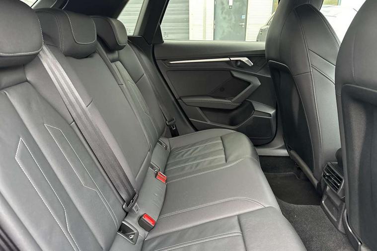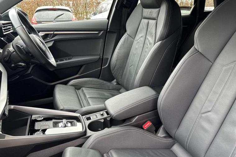 Audi drive select (Auto, Comfort, Dynamic, Efficiency and Individual), Audi smartphone interface, Audi Virtual Cockpit - 10.25" digital and colour instrument cluster, Automatic start/stop system with recuperation, Bluetooth interface, Collision avoidance assistant, e-Call (emergency call), Electromechanical power speed sensitive steering, Lane departure warning system, MMI Navigation Plus with high resolution 10.1" colour touch screen display, Service indicator, Trip computer, Voice control system with natural language interaction, 2xUSB-C connection with data and charging functions, 6 passive loudspeakers, DAB Digital radio, 3rd brake light, Acoustic glass windscreen, Aluminium window trim, Auto dimming frameless rear view mirror, Electrically adjustable/heated/folding/dimming door mirrors with kerb view includes integrated LED indications + kerb view function for passenger side, Front electric windows, Illuminated aluminium inserts front door sills with S logo, LED daytime running lights, LED headlights with LED rear lights and dynamic rear indicators, Light and rain sensors, Privacy glass - dark tinted rear window, rear door and side windows, Rear electric windows, Rear side air outlets in grained matt black, Rear side wing doors, Rear wiper, S line bumpers, S roof spoiler, 12V socket and storage compartment in front centre console, 3 seat bench in 2nd row, 40/20/40 split folding rear seat bench with cupholder, Black cloth headlining, Dual zone electronic climate control, Front and rear centre armrest in leather, Front and rear headrests, Front/rear floor mats, Height and reach adjustable steering wheel, Illuminated vanity mirror, Interior lighting - glove compartment light and right hand side, Luggage compartment floor covering, Manual boot compartment lid, Manually adjustable front seats, Seat side bolsters, Single front passenger seat, Stainless steel pedals and front footrest in black, Twin leather upholstery with front sports seats S embossed logo, Aluminium interior elements pack - A3 Sportback, S line styling pack - A3 Sportback, 3x3 point rear seat belts, Audi pre sense front, Driver and front passenger airbag with passenger airbag deactivation, Electronic Stabilisation Control (ESC) including ABS, ASR and EDL, First aid kit with warning triangle and 2 safety vests, Front side airbags with head airbags and interaction airbag, Pre-sense front with pedestrian and cyclist detection, Seatbelt monitoring, Tyre pressure loss indicator, Anti theft alarm, Anti-theft wheel bolts, Immobiliser, Manual child locks, Remote control central locking, Accent surfaces in the dashboard and centre console in platinum grey silk effect paint finish, Dark spectrum aluminium inlays,