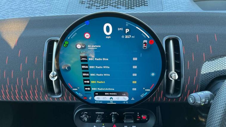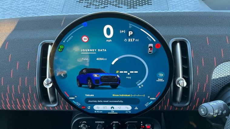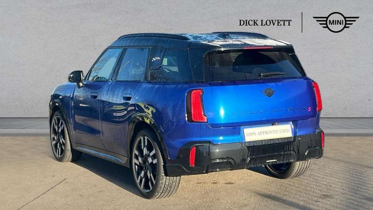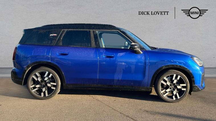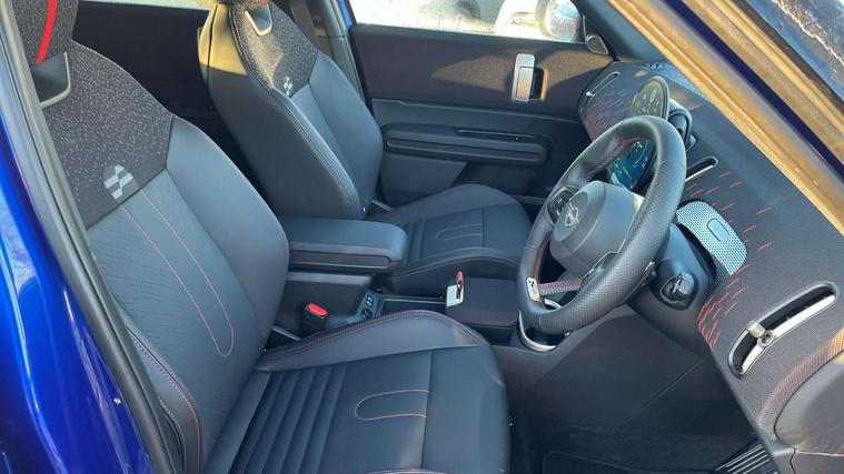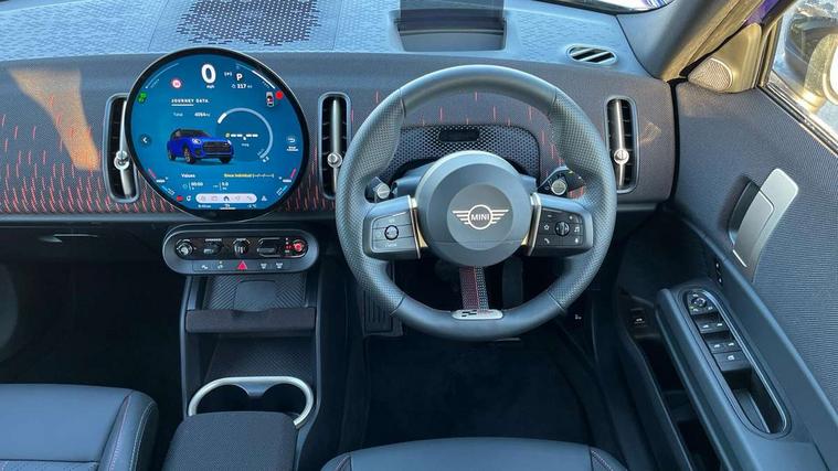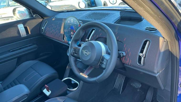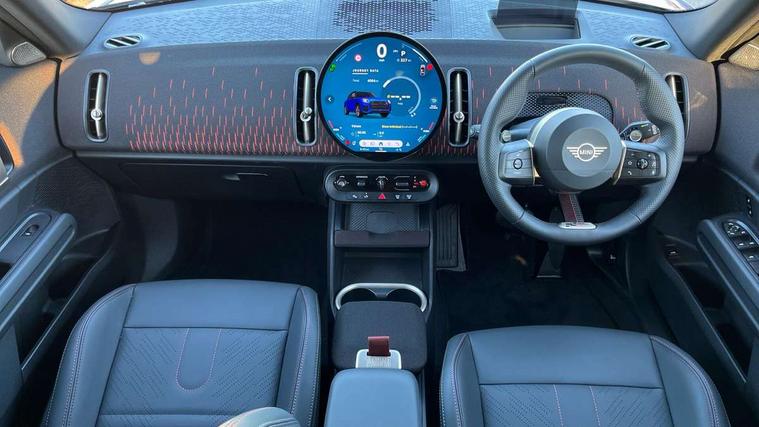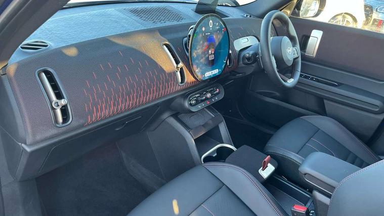 Bluetooth connection, Circular OLED Screen, Compatible mobile phone bluetooth with audio streaming, Cruise Control (DCC), Digital dashboard display, Driving assistant, Driving Assistant Plus Preparation, E-call, Electro-mechanical speed dependant steering assistance, MINI Experience Modes, MINI Head up display, Mini navigation system, MINI TeleServices, Parking assistant in camera and ultrasound based assistance system, rear view camera, parking aid and distance control, Adaptive suspension, Double clutch sports transmission, Larger capacity fuel tank, 6 speakers, DAB Digital radio, Personal eSim, Auto tailgate, Electric adjustable heated door mirrors, Front and rear apron, Front and rear electric windows, Heated rear window, High beam assistant, High gloss hexagonal patterned grille surround, Interior rear-view mirror with automatic anti-dazzle function, LED daytime running lights, LED headlights with extended contents including Adaptable light signatures, LED rear lights, LED third brake light, Rain sensor with auto headlights, Rear roof spoiler with airblades, Rear side wing doors, Rear window wiper, Roof rails, 3 Seat sliding rear bench in 2nd row, Anthracite headliner, Auto air conditioning, Driver and front passenger seat heating, Floor mats, Front armrest, Front headrests, Heated steering wheel, Height and length steering column adjustment, JCW Front sports seats, Lidded storage box in Black/Red knit, Luggage compartment separating net, Perforated Vescin steering wheel, Rear headrests, Seat adjustment for rear seats, Single front passenger seat, Sunvisors with vanity mirrors, Vescin/Cloth upholstery, Wireless charging tray, Interior and exterior mirror package - Mini Countryman, 3x3 point rear seat belts, 6 Airbags - front, side, head and seat belt tensioners, ABS, Brake calipers in Black with JCW badge, DSC - Dynamic Stability Control, Electronic handbrake, Electronic Stability Programme (ESP), Front ISOFIX (iSize), Hill descent control, Hill hold assist, Hill start assist, JCW Sport Brakes, Manual rear child locks, Traction control, Tyre pressure monitoring system, Warning triangle, Alarm system with tilt sensor, monitoring doors, bonnet interior and tailgate, Auto drive away locking, Comfort access system, Deadlocking function, Electronic vehicle immobiliser, Locking wheel bolts, Remote control locking, Start/stop toggle with keyless go, JCW Black/Red dashboard knit, MINI Mobility Kit,