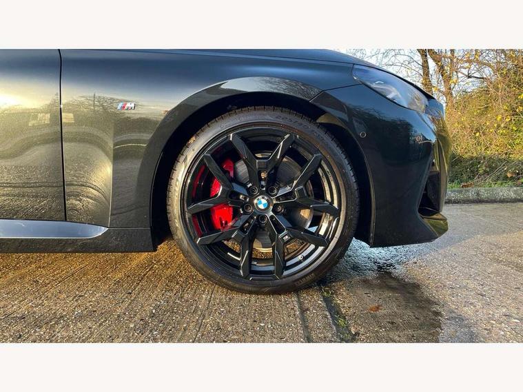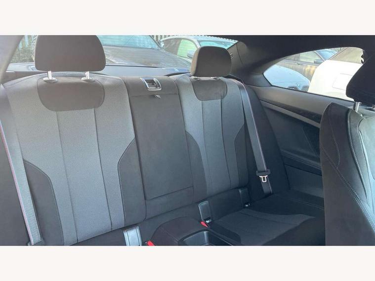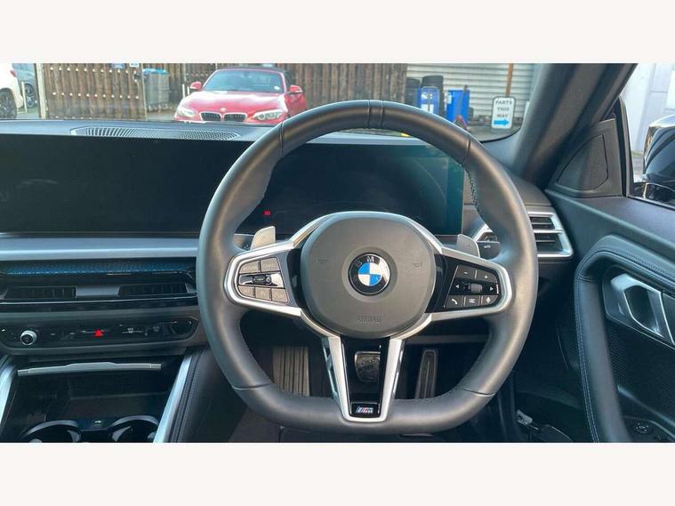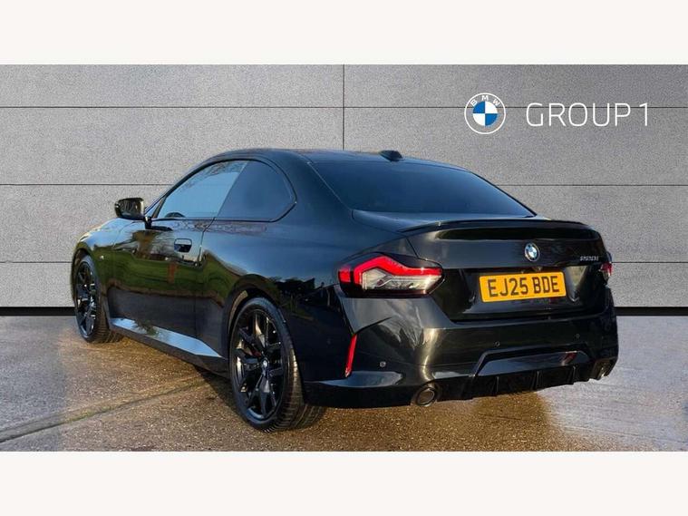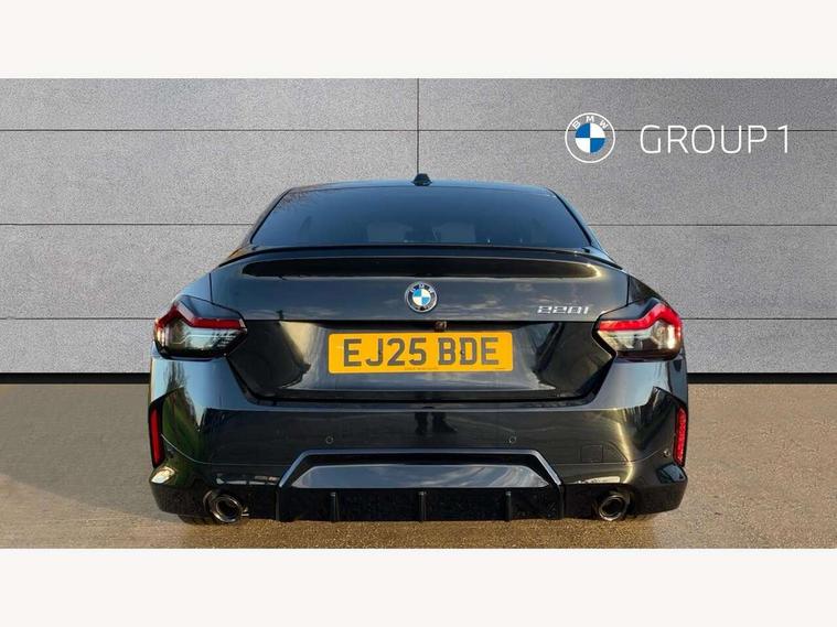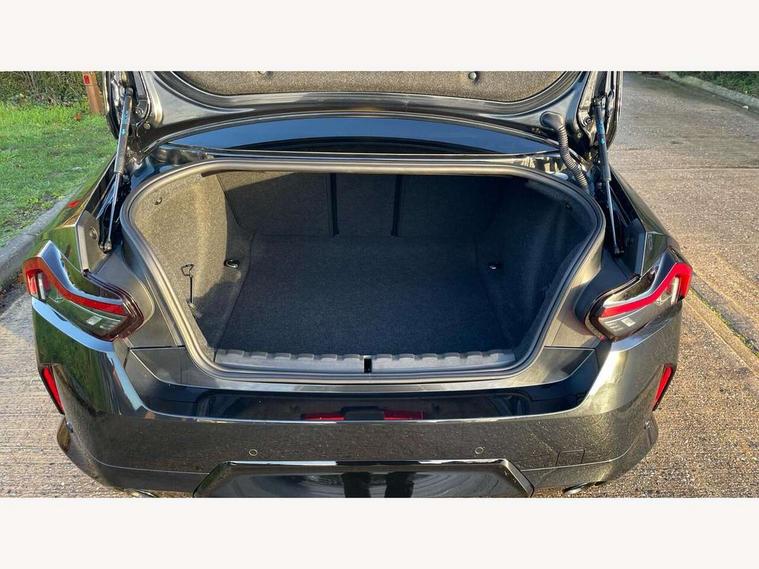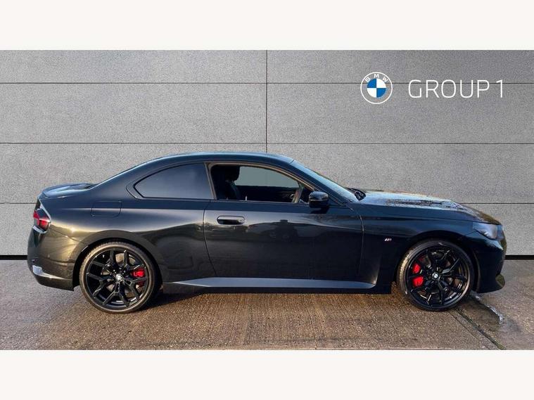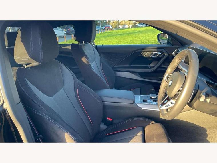 2 USB connections for charging and transferring data, Active guard plus, Attentiveness assist, Bluetooth with USB, BMW ConnectedDrive online services, BMW Intelligent Personal Assistant, BMW Live cockpit plus, BMW operating system 8 with variable, configurable widgets display information in real time, BMW Teleservices, Check Control warning system for monitoring of lights and door/luggage compartment open warning, Control Infotainment, Direct selection buttons, Drive off assistant, Eco pro mode, Electric power steering, eSim with 5G connectivity, Front and rear parking sensors, iDrive controller with turn and press function, Integrated owners handbook, Intelligent functions, Oil sensor for level and grade, Optimum shift indicator, Personal Profile, Smartphone integration, Touch operation on control display, Variable sport steering, Widescreen multi-media display, WiFi interface for wireless connection of mobile terminal devices, Aluminium lightweight construction, Balancer shaft, BMW TwinPower Turbo four-cylinder petrol engine, Double VANOS, Drive performance control with ECO PRO comfort + sport mode, Electronic differential lock, High precision injection, M sport suspension, Petrol Particulate Filter, Steptronic transmission with gearshift paddles, Twin scroll turbocharger with Valvetronic, DAB tuner, Acoustic windscreen wipers for reduced driving noise, Automatic windscreen wipers and automatic headlight, Body colour door handles flush with door surface, Body colour door mirrors, Body colour front and rear bumpers, Daytime running lights, Electric windows - front and rear, with open/close fingertip control and trap release, Exhaust tailpipes x2 - 90mm in left and right, Fading support, Front and rear bumper system with replaceable deformation elements, Front door sill finishers in black plastic with BMW designation, Front windscreen wipers with integrated washer jets, Green tinted heat protection glazing, High beam assistant, High gloss black sill, bumper trim sides and diffuser insert, High level third brake light, Indicators integrated int mirror housing, Interior rear-view mirror with automatic anti-dazzle function, LED registration plate light, LED technology rear tail lights, brake lights and turn indicators, Lightweight engineering, M high gloss shadowline, One piece kidney grille with hight gloss chrome surround, Rear boot, Rear fog lights, Reversing light in rear light cluster, Shark fin antenna, Single part LED rear lights with smoked glass components, Trailer stabilisation logic, Visible VIN plate, 12V power socket in front centre console with blanking plug, 2 cupholders in front centre console, 2 zone automatic air conditioning, Ambient lighting, Compartment in front of cupholder, Conditioned based service, English handbook, Folding rear seat head rests, Front and rear side armrests integrated into door trim, Front armrest, Front door pockets, Front head restraints, Heated front seats, Illuminated glove compartment with separate small compartment, M headliner Anthracite, M sport leather steering wheel, Manually adjustment steering wheel column, Rear seat backrest with manual 40:20:40 split folding, Rear seat centre foldable armrest with integrated cup holder, Single front passenger seat, Storage compartment between rear seats, Storage tray and compartment with cover in centre console, Sun visors with vanity mirrors and insert tab, Through loading system with 40/20/40 split folding 2 rear seat in 2nd row, Velour floor mats, Additional storage compartment pack without USB - 2 Series Coupe, Connected pack professional - 2 Series Coupe, 2 tone horn, Anti lock braking system (ABS) with cornering brake control, Automatic Stability Control (ASC), BMW emergency call, Brake drying, Child seat ISOFIX attachment for the two outer rear seats, Crash sensor activating of airbags, Unlocking doors, hazard warning lights, fuel cut off, interior lighting+activation of safety battery terminal clamp, Deactivation of fuel pump in the event of a crash, Driver and front passenger airbags, Driver and front passenger side airbags, integrated in the door side seat backrest bolsters for all seat variants, Dynamic brake control, Dynamic stability control + (DSC+), Dynamic Traction Control - DTC, Electrically operated hand brake including automatic hold function and automatic release when driving off, Front and rear disc brakes, Front centre airbag between driver and front passenger seats, Front passenger airbag deactivation, Head airbags for all 4 outer seats, PC iBrake (Post crash approach control warning with light braking function), Seat belt security check for driver and front passenger, Seatbelt warning, Side impact protection, Three point seat belts on 4 seats including front belt stopper, pyrotechnic belt tensioners and belt force limiters, Tyre pressure monitoring system, Warning triangle and first aid kit, Alarm system (Thatcham 1) with remote control and electronic engine immobiliser, Central locking switch for all doors, fuel filler cap and luggage compartment, Deadlocking function system to all doors, Drive away locking system on all doors and luggage compartment, Locking wheel bolts, Start/Stop button (illuminated) in centre console with keyless engine start and Auto Start-Stop deactivation button, Two remote control key with integrated key - one button for open and close doors/fuel flap/tailgate and separate button for unlock luggage compartment, Electrically powered 12V compressor, Reduced rolling resistance tyres, Tyre repair kit,