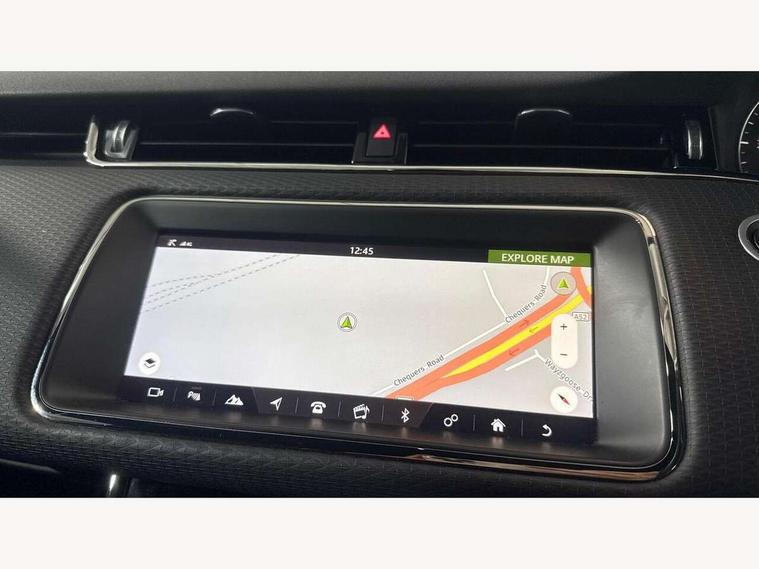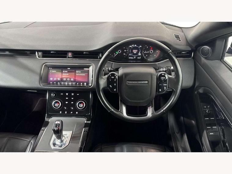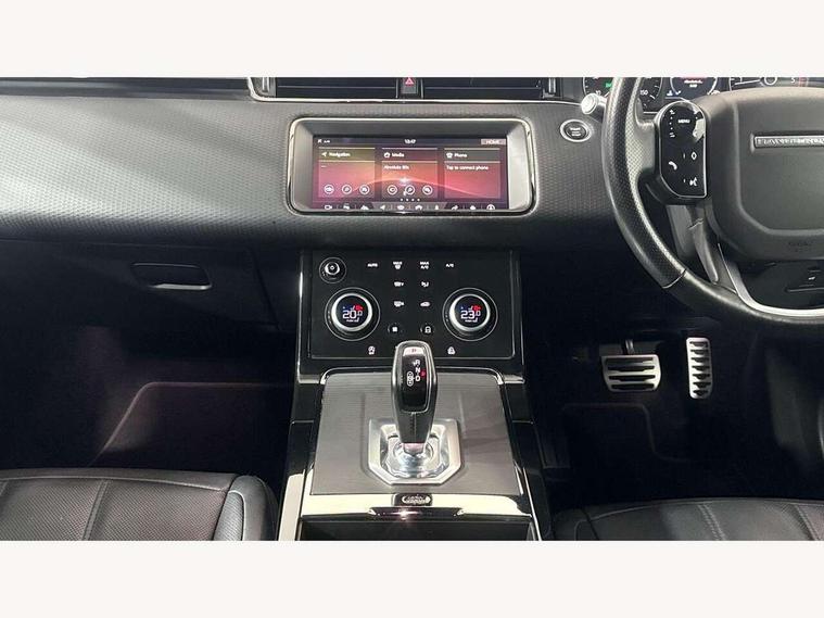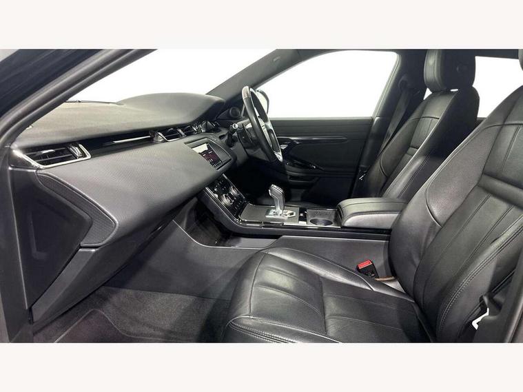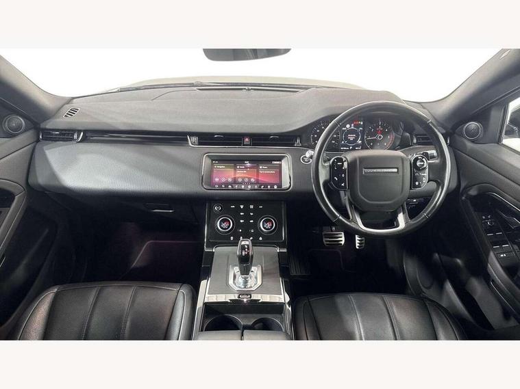 Android Auto, Apple car play, Bluetooth connectivity, Brake pad wear indicator warning light, Driver condition monitor, Electronic power assisted steering (EPAS), InControl remote, Land Rover InControl apps, Lane keep assist, Navigation pro system, Pro services and wifi hotspot, Push button starter, Smart settings, Traffic sign recognition with adaptive speed limiter, Voice control system, All terrain progress control, Efficient Driveline, Passive suspension, Terrain Response 2 Auto, Digital Audio Broadcast radio-DAB, Steering wheel mounted controls, Electric windows with one touch open/close and anti trap, Evoque and R-Dynamic badge, Flush deployable exterior door handles, Heated rear window with timer, Heated washer jets, Heated windscreen, Rain sensing windscreen wipers, Rear fog lights, Shadow atlas bonnet and tailgate script, Tailgate spoiler, 40:20:40 split folding rear seats, Black gearshift paddles, Bright metal pedals, Isofix system on outer rear seats, Overhead lighting console, Overhead stowage for sunglasses, Passive front head restraints, Rear air vents, Rear centre headrest, Sunvisors with illuminated vanity mirrors, Twin front cupholders with cover, Twin sliding front centre armrest, Two zone climate control, Anti-lock braking system (ABS), Customer configurable autolock, DSC - Dynamic Stability Control, Electronic brake force distribution, Electronic parking brake, Electronic traction control, Front and rear seatbelt reminder, Hill descent control, Hill launch assist, Low traction launch, Power operated child locks, Roll stability control, Six airbags - Driver and passenger airbags/driver knee airbag/front side airbag and curtain airbags, Torque vectoring brake, Tyre pressure monitoring system, Alarm, Immobiliser, Intrusion sensor, Locking wheel nuts,