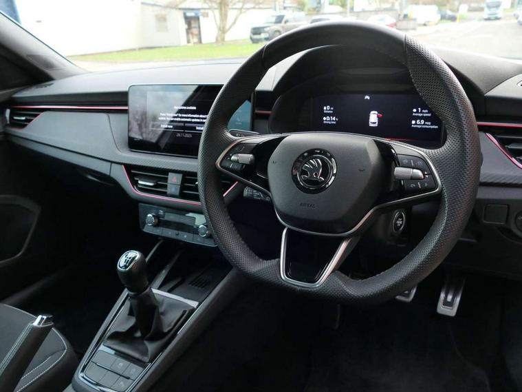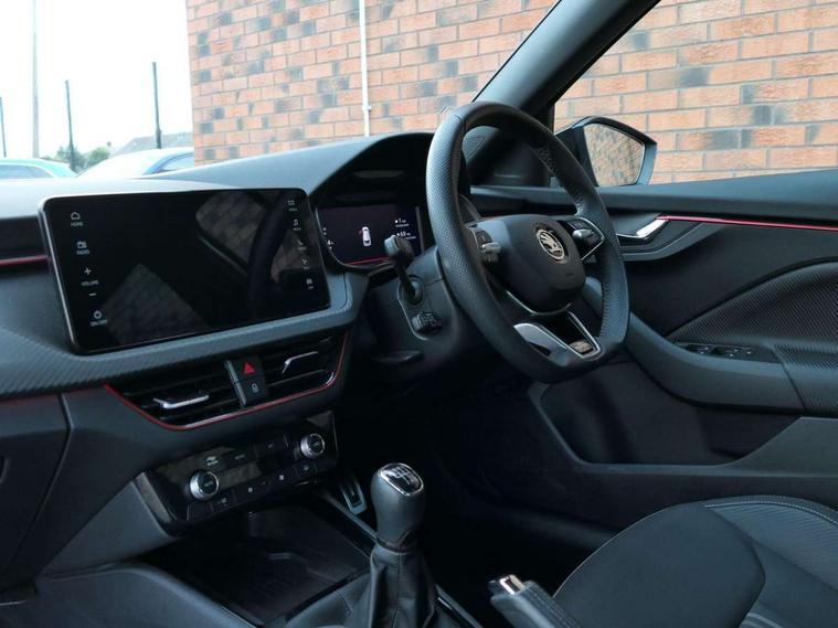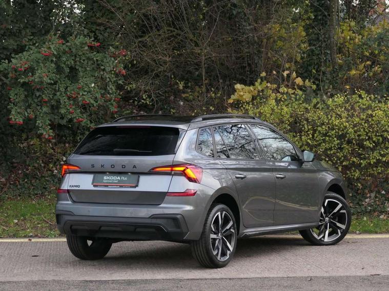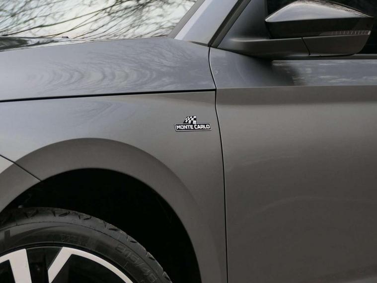 Advanced driver attention and drowsiness monitor, Bluetooth system, E-call, Front assist system, PAS, Rear parking sensors, Service indicator, Speed limiter, Traffic sign recognition, Virtual cockpit with 10.25" display, Voice control system, Wireless smartlink, 4 USB C ports, 8 speakers, 9.2" Skoda navigation display, DAB Digital radio, Auto dimming rear view mirror, Automatic headlight control with coming home and leaving home feature, Automatic headlights, Black door mirrors, Black radiator grille, Black rear diffuser, Black roof spoiler, Body colour bumpers, Body colour door handles, Boot lettering in black, Extended tailgate glass, Front and rear electric windows, Heated rear window, LED daytime running lights, LED high beam, LED low beam, LED third brake light, Monte carlo plaque, Panoramic sunroof with black roof rails, Privacy glass, Rear side wing doors, Rear wiper, Ticket holder inside windscreen, 12V socket in luggage compartment, 3 seat bench in 2nd row, Aluminium pedals, Ambient lighting in white/red, Art leather carbon decor inserts, Art leather carbon door inserts, Black roof lining, Cargo elements, Chrome inner door handles, Driver and passenger sun visors with vanity mirror, Dual zone climate control, Front and rear roof lights, Front centre armrest, Front head restraints, Glove compartment with illumination, Height adjustable driver seat, Height adjustable front passenger seat, Ice scraper, Inner circulation control with pollen filter, ISOFIX on front passenger seat, Isofix preparation for back seats, Leather gearknob and handbrake lever, Manual lumbar support for front seats, Monte Carlo cloth upholstery, Net package and top tether hooks in boot space, Net under rear shelf, Pocket on the back of both front seats include mobile phone pockets, Rake/reach adjustable steering wheel, Reading lights, Rear centre armrests, Red hotstamping, Single front passenger seat, Sports seats, Textile floor mats, Third rear headrest, Top tether for front passenger seat, Umbrella in driver's door, Light and view plus package - Kamiq, 3x3 point rear seatbelts, Airbags - driver and front passenger, Disc brakes, ESP, Extended and predictive pedestrian/cyclist protection, Front passenger airbag deactivation switch, Front side airbags with curtain airbags, Hill hold control, Manual leather parking brake, Manual rear child locks, One tone horn, Seatbelt reminder for driver an co-driver, Traction control, Tyre pressure monitor, Anti-theft alarm system with interior monitoring, backup horn, towing protection and remote central locking with SAFE system, Anti-theft wheel bolts, Electronic engine immobilizer, 18" Ursa black diamond cut alloy wheels,