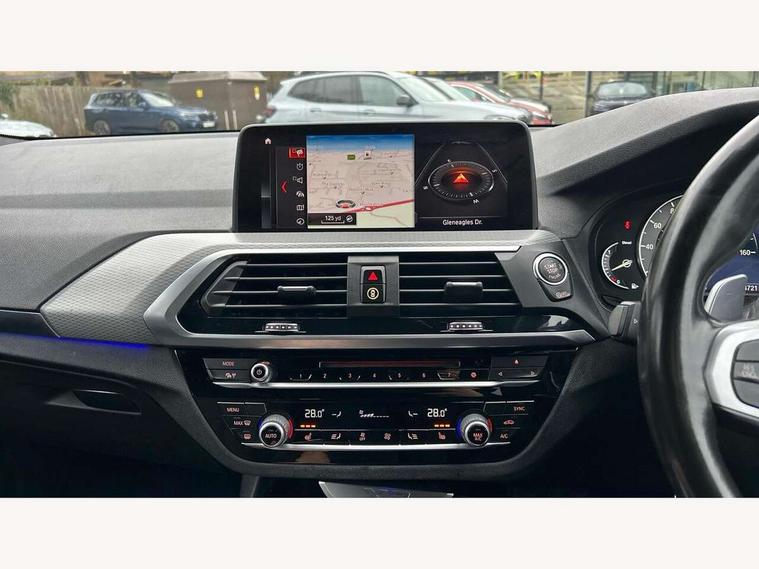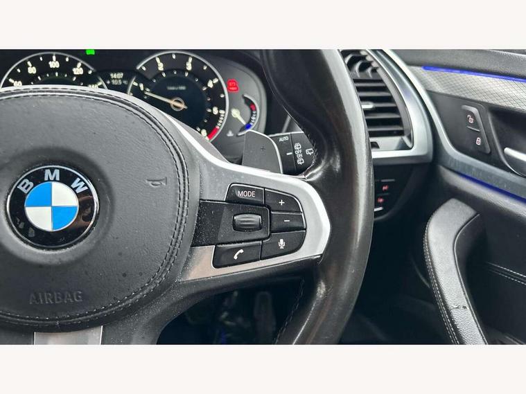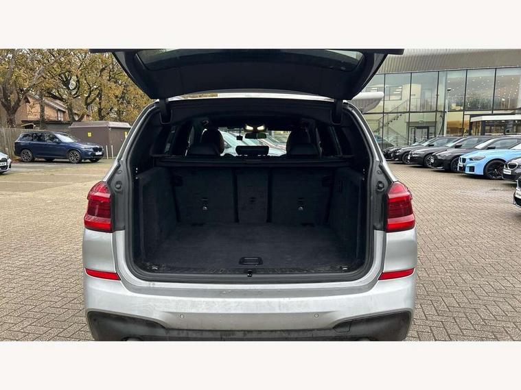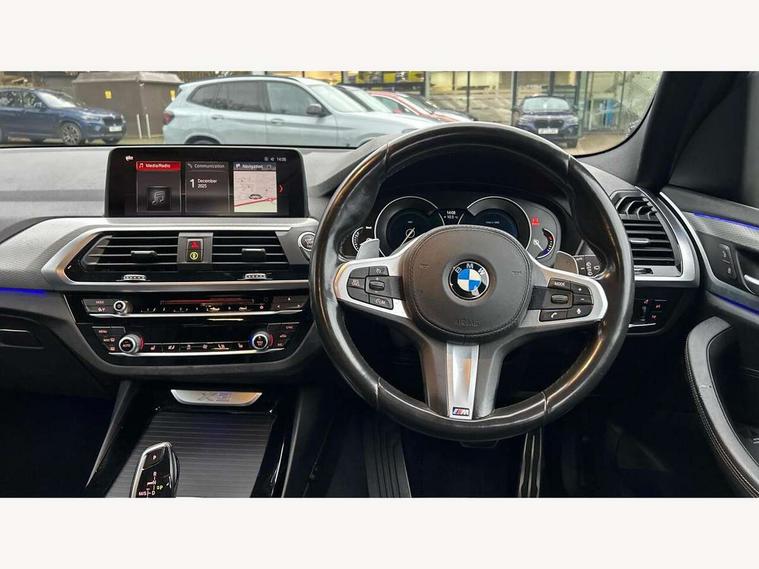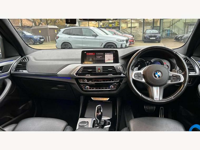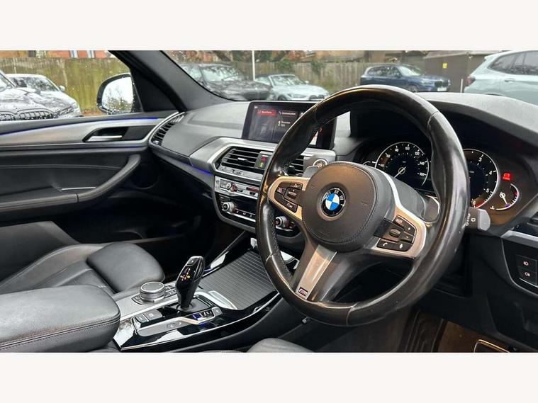 Active Guard incl speed limiting and lane departure functions with auto steering, and front collision warning with brake intervention, Attentiveness assist, Automatic tailgate operation, BMW Live Cockpit Professional sat nav system including 10.25" high resolution display and Intelligent Voice Assistant, BMW Online services, BMW Teleservices, Brake pad wear indicator in front and rear, Check Control warning system for monitoring of lights and door/luggage compartment open warning, Control display - 6.5" colour display screen, Electric Power Steering (EPS) with Servotronic, Front/rear Parking distance control, iDrive Controller with 8 favourite buttons, Lights on warning by audio warning signal when ignition is switched off, Navigation system - BMW Professional multimedia with Hard disc drive (HDD) and 10.25" touch display, Oil sensor for level and grade, warning by check control system, On board computer - average speed+fuel consumption, service interval, clock/date, odometer/trip meter, outside temperature display and ice warning, Optimum shift indicator, Personal Profile - automatic lock when driving away selectable, Real time traffic information, Semi digital instrument cluster, Stop/start system, Automatic transmission with gearshift paddles, Diesel particulate filter, Incorrect fuelling protection, Larger capacity fuel tank, Multi-link rear suspension, Performance Control, Auxiliary socket for external MP3 player, BMW professional radio/CD/MP3, DAB Digital radio, Acoustic glazing, Black finish on B pillars, Body colour door handles, Body colour electric adjust heated aspherical door mirrors, Body colour roof mouldings, Body coloured bumpers, Chrome kidney grille with high gloss black vertical slats, Direction indicator, side repeaters, integrated in exterior mirrors, Dual chrome exhaust, Dynamic brake lights, Exterior mirrors - electrically folding with anti-dazzle, Fingertip control / anti-trap function on electric window, Follow me home headlights, Front and rear bumper system with replaceable deformation elements, Front and rear electric windows, Green tinted heat insulating glass, Heated windscreen washer jets, Height adjustable headlamps, High gloss black door sill finishers, High gloss black shadow line roof rails, High gloss shadowline exterior trim in decorative moulding side frame/recess cover/guide rail/B, C pillars/mirror frame and triangle with mirror base, High level 3rd brake light incorporating LED Technology, Interior rear view electrochromatic mirror with automatic anti dazzle function, LED front fog lights, LED tail lights, Lightweight engineering, M aerodynamic bodystyling, Model designation, Rain sensor including auto headlights activation, Rear wiper, Shark fin antenna, Visible VIN plate, Welcome lighting, Windscreen wipers with adjustable interval, 12V socket in centre console and luggage area, 3 rear headrests, 3 zone automatic air conditioning, 4 lashing points to secure luggage, Ambient lighting, Anthracite headlining, Anthracite Velour floor mats, Driver/passenger sunvisors with ticket holders + illuminated vanity mirrors, Foldable boot floor with storage compartment, Four grab handles integrated in roof lining, Front and rear bottle holders integrated into door trim storage compartments, Front and rear side armrests integrated into door trim, Front centre armrest with storage compartment, Front footwell lights, Front sports seats, Front/rear courtesy lights with soft on/off dimming, Front/rear reading lights, Height adjustable front/rear head restraints, Isofix rear child seat preparation, Leather gear knob, Luggage area underfloor compartment, Luggage compartment lighting, M Sport multifunction leather steering wheel, Parcel shelf removeable and storable under boot floor, Reach and rake adjustable steering column, Rear centre armrest with 2 cupholders, Rear seat centre armrest with two cupholders, Removable / retractable luggage cover, Slope adjustable rear seats, Storage compartment in rear centre console and front/rear door trims, Through loading system with 40/20/40 split folding rear seat, Toolkit located in luggage compartment, Two front cupholders with removable oddments tray/lid, Vernasca leather upholstery, Connected pack professional - X3, ABS/EBD, ADB - Automatic Differential Brake, Automatic Stability Control (ASC), Battery safety cut-off, BMW emergency call, Brake assist, Brake assist function, Brake drying, Brake energy regeneration, Braking pre-tensioning, Child locks on rear doors, Cornering brake control (CBC), Crash Sensor - activation of central locking release, hazard warning light and interior lighting, Deactivation of fuel pump in the event of a crash, Driver and front passenger front and side airbags with passenger deactivation and ITS front and rear head airbags, DSC+, Dynamic brake control, Dynamic Traction Control - DTC, Electromechanical parking brake, Front seat belts warning, Hill descent control, Hill start assist, Seatbelt security check for front seats, Side impact protection, Three point seatbelts to all seats with front and outer rear pyrotechnic belt tensioners and seat belt force limiters, Two tone horn, Tyre pressure monitoring system, Ventilated front and rear disc brakes, Warning triangle and first aid kit, Central locking switch for all doors, fuel filler cap and luggage compartment, Electronic engine immobiliser, Locking wheel nuts, Remote control including two integrated key - one button for open/close all lockable content, windows and separate button for open luggage compartment, Remote control Thatcham category 1 alarm, Start/stop button with Comfort Go keyless engine start and auto Start/stop deactivation button, Low rolling resistance tyres,