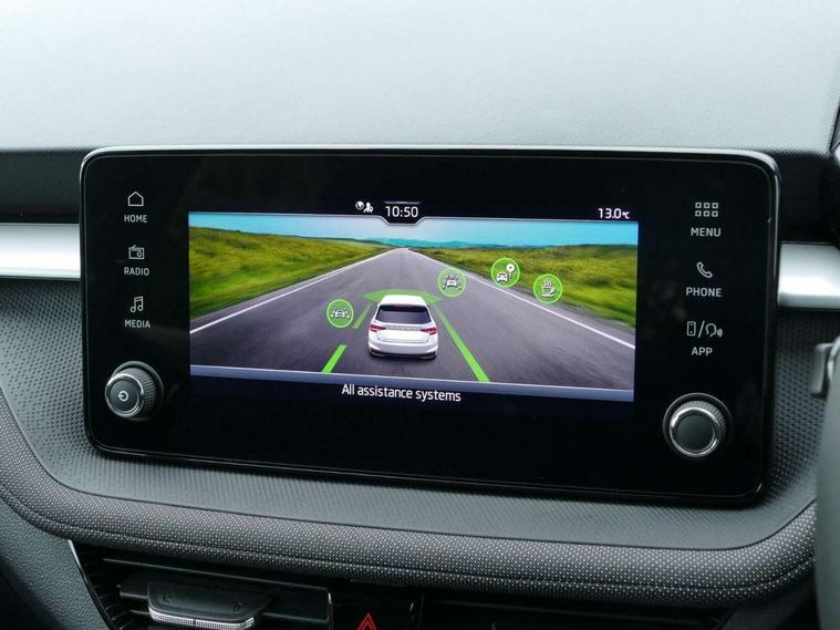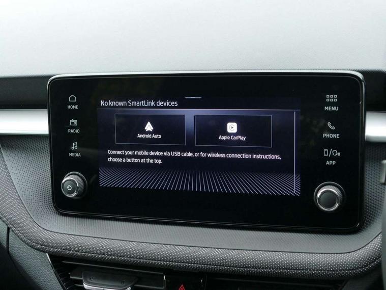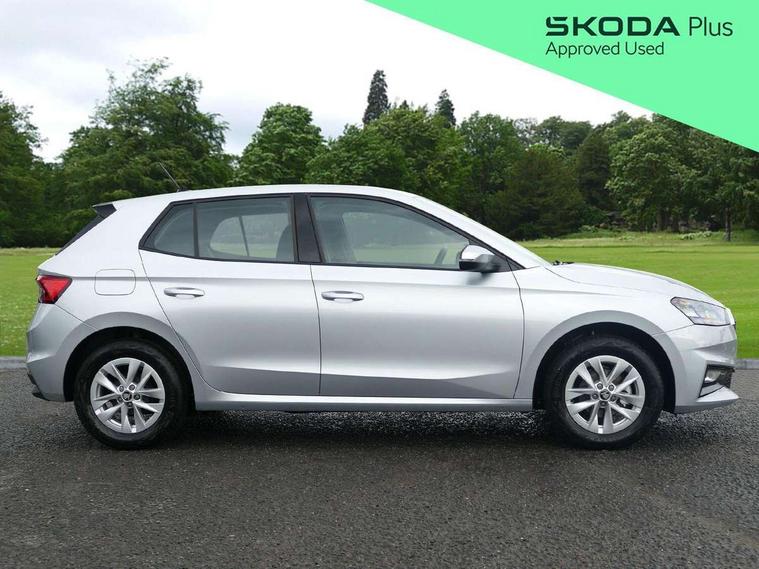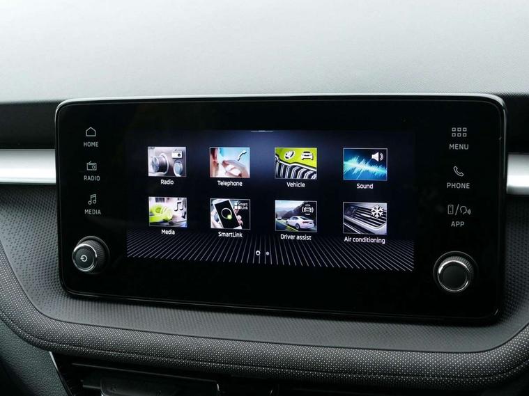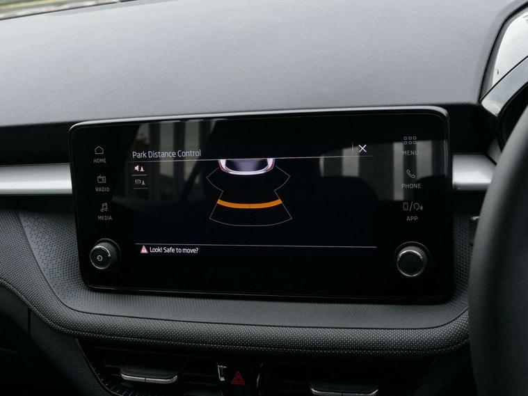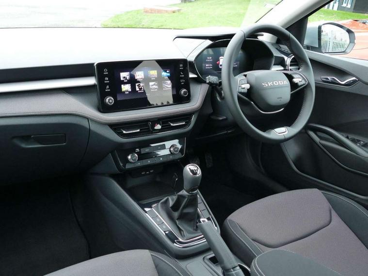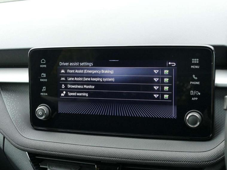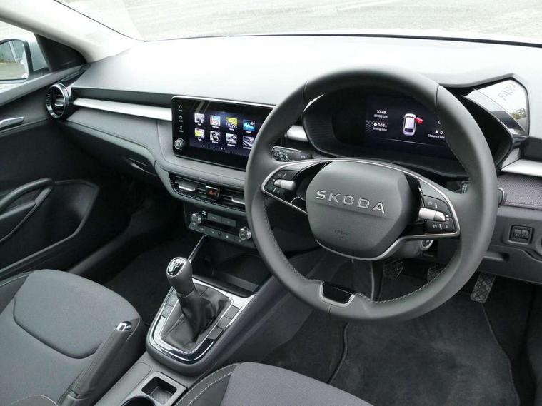 8" Digital instrument display, Advanced driver attention and drowsiness monitor, Bluetooth connection, Cruise control with speed limiter, Driver alert system, Electromechanical power steering, Exterior temperature gauge, Lane assist including road edge detection, Rear parking sensors, Service interval indicator, Traffic sign recognition, Wireless SmartLink for Apple CarPlay and Android Auto, 6 Speakers (4 in front and 2 in rear), 8.25" Skoda infotainment touchscreen display, Auxiliary socket for external MP3 player, DAB digital radio reception, Auto dimming rear view mirror, Body colour door mirrors, Body coloured bumpers, Door mirror integrated indicators, Front and rear electric windows, Front window wiper intermittent control, Headlight range control - Automatic, Ice scraper in fuel cap, LED 3rd brake light, LED daytime running lights with coming and leaving home feature, LED rear lights, Rear LED fog light, Rear side wing doors, Rear window wiper with washing nozzles, Roof mounted spoiler, SKODA tailgate lettering in chrome, Unique dark chrome design logo on alloy wheels, 2 reading lights in front and 2 reading lights in rear, 3 rear headrests, Backrest split and folding, Central console with removable cup holder and storage box, Chrome handbrake release button, Dual zone air conditioning with climatronic electronic control, Fabric upholstery, Front centre armrest, Gearshift knob/handle in leather, Grain satin black interior door handles, Hand brake lever handle in leather, Height adjustable front headrests, Height adjustable front seats, Height adjustable steering wheel, ISOFIX and TopTether anchorage points to the outer rear seats, ISOFIX and TopTether on the front passenger seat, Luggage compartment lighting, Manually adjustable lumbar support in front seats, Pollen filter, Rear seat bench unsplit, Single front passenger seat, Skoda lettering on steering wheel, Storm grey headlining, Sun visors with mirror and airbag label on passenger side, Textile floor mats, Ticket holder, Umbrella in drivers door, Ambient lighting pack - Fabia Hatchback, 3-point height adjustable front seats belts with pretensioner and force limiter, Automatic warning lights in case of crash, Driver and passengers airbag with switch off function, e-Call+, ESC including ABS, MSR, ASR, EDS, HBA and XDS, Front and rear seat belt warning, FRONT ASSIST (AEB City and AEB Inter Urban), Front side airbags, Head airbags, One tone horn, Pedestrian protection, Three rear 3-points safety seat belts with pretensioner and force limiter including stop function for outer rear seat belts, Tyre pressure monitoring system, Anti-theft alarm system including immobiliser, interior monitoring, backup horn, and towing protection, Central locking with radio remote control, interior controls, SAFE function and 2 foldable keys, KESSY - Keyless engine start/stop, Black painted air vents, Grain satin black central console cover, Metallic grey upper decorative trim, Satin black door and side trim panel in front, Textile Kota grey lower decorative inserts, Anti-theft wheel bolts protection, Super-low rolling resistance tyres,