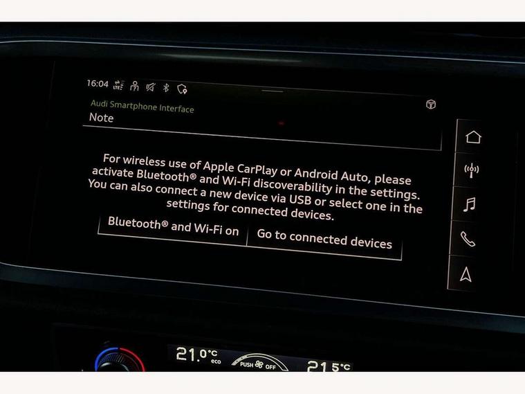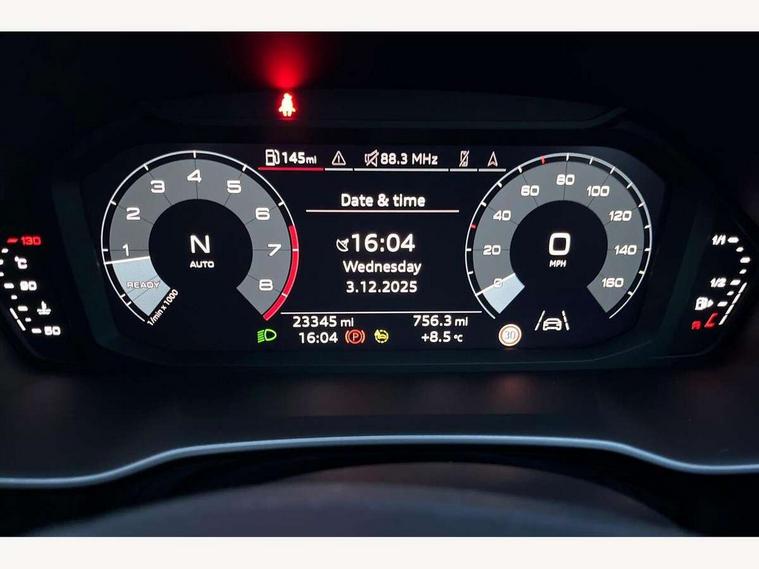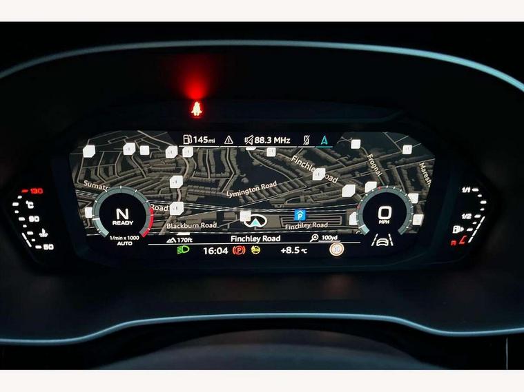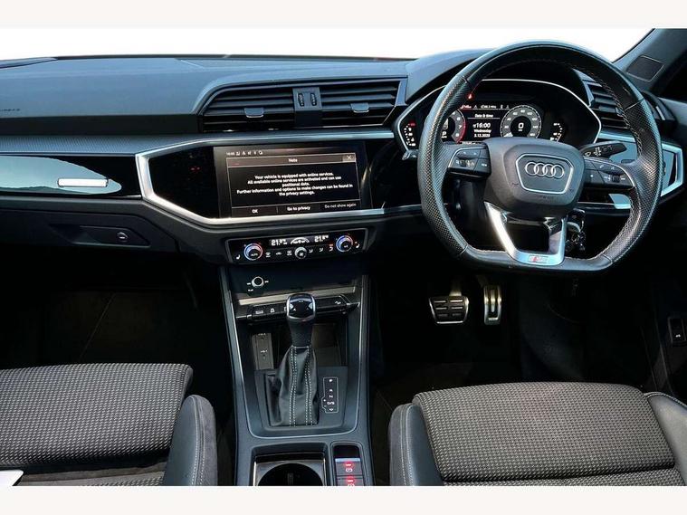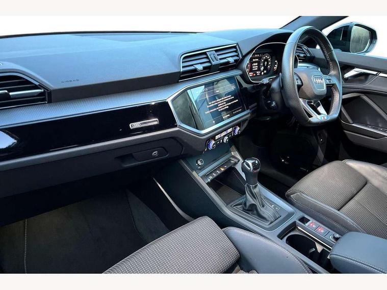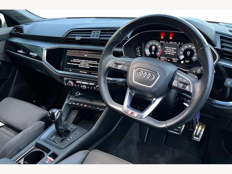 Audi connect safety and service (e-call), Audi drive select, Audi lane departure warning, Audi smartphone interface includes wireless Apple carplay/Android Auto, Audi Virtual Cockpit - 10.25" display, Bluetooth interface, Camera based traffic sign recognition, MMI Navigation Plus with high resolution 10.1 inch touchscreen colour display, Power operated tailgate, Progressive steering, Service interval indicator, Start stop system with recuperation, Voice control system with natural language interaction, 48V Mild hybrid technology, Sports suspension, 2 USB-C ports with charge and data functions, 6 passive loudspeakers, DAB digital radio module, Acoustic windscreen, Auto dimming frameless rear view mirror, Bumpers and underbody protection in contrasting manhattan grey paint finish, Diffuser grille in grained matt black, Diffuser trim in selenite silver, Electrically folding, adjustable and heated door mirrors with integrated LED side indicators and kerb view function for passenger side, Front and rear electric windows, Front fog lights, Front side air inlets in selenite silver, High gloss black finish B and C pillars, LED headlights with LED daytime running lights and dynamic rear indicator, LED rear lights, Privacy glass dark tinted rear and rear-side windows (from B-pillar backwards), Rain and light sensors, Rear underbody protection in matt black, 12V socket in rear centre console, 40:20:40 folding with manual adjustment for 60:40 forwards/backwards position and backrest angle, Adjustable rear seat bench/backrest with centre armrest and cupholder, Black cloth headlining, Dual zone electronic climate control, Front and rear black floor mats with contrast stitching, Front and rear headrests, Front and rear roof module including reading lights, Front centre armrest, Glove compartment lighting, Height and reach adjustable steering wheel, Illuminated door sill trims with S logo, ISOFIX child seat mounting for front passenger with airbag deactivation and outer rear seat including top tether attachment point for outer rear seats, Luggage compartment light, Manual front seats with height adjustment, Perforated leather gearknob, Stainless steel luggage compartment sill finisher, Stainless steel pedals, Tool kit, Black styling pack - Q3, Non smoking pack - Q3, 3x3 point rear seatbelts, 6 airbags - Driver, front passenger, curtain and side windows, Electrically operated child locks on rear doors, Electromechanical parking brake, Electronic stabilisation control including ABS, ASR and EDL, Hill descent control, Hill hold assist, Pre sense basic, Seatbelt monitoring, Tyre pressure warning, Warning triangle and first aid kit, Anti theft alarm, Anti theft wheel bolts, Audi pre-sense front with pedestrain and cyclist recognition, Remote central locking, Black dashboard, Leatherette door armrest, MMI touch colour display in glass look, black with surround in aluminium look, Piano black inlay, Tyre repair kit,
