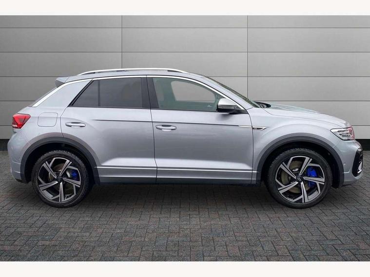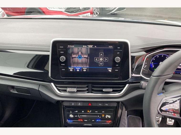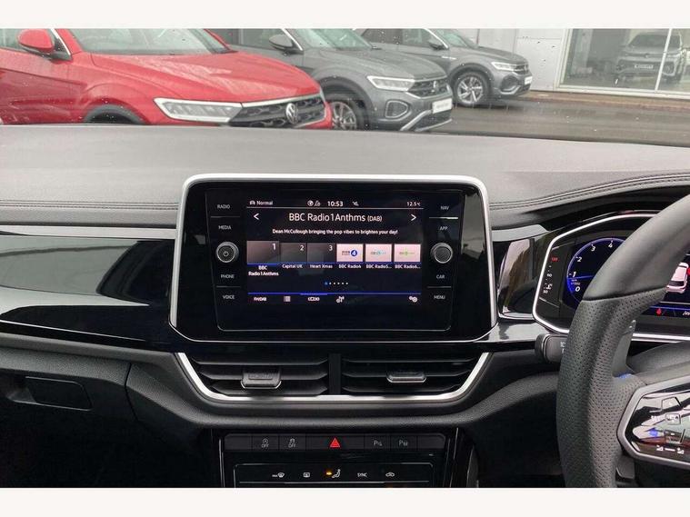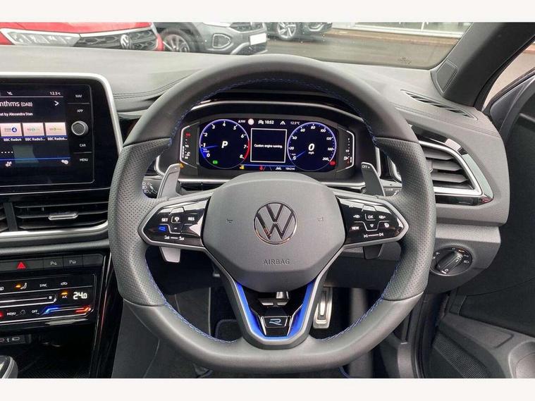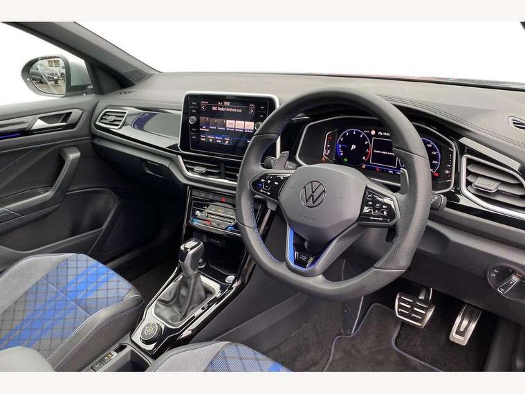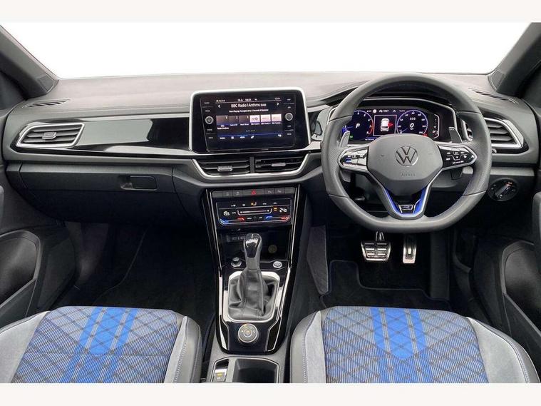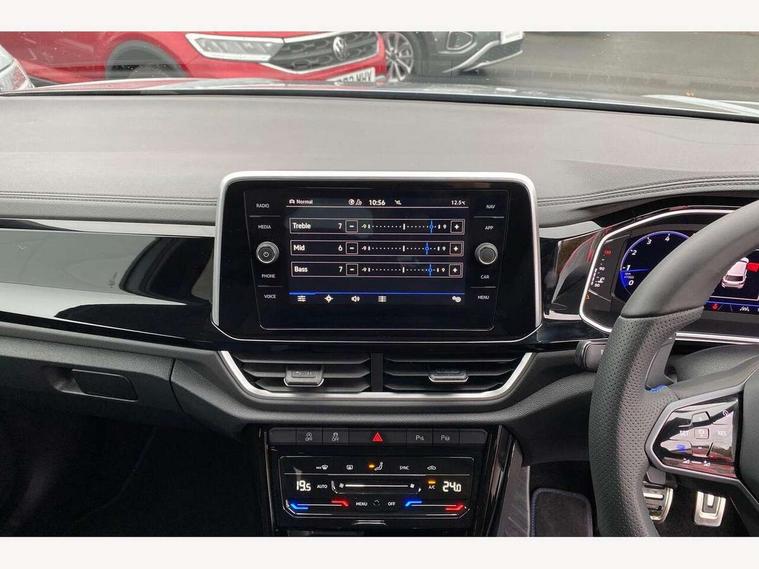 10.25" Digital cockpit pro, Advanced driver attention and drowsiness monitor, Emergency call service, Lane keeping system Lane Assist, Mobile phone interface, Modified key software - reduce switch off time for key status change to Long no motion, Online services, Park assist including front and rear parking sensors, Service interval indicator, Tailgate/trunk lid release from outside, Think blue trainer driver tips and journey analysis, Warning sound and light for front seatbelts unfastened, Wireless app connect, Battery regeneration during braking, Four wheel drive, Start/stop function with battery regeneration, DAB Digital radio, Diversity antenna for FM reception, Music playback - MP3, WMA and AAC files, Premium USB cable in choice of either Apple or Android smartphone compatibility, SD card slot, Simultaneous pairing of 2 compatible mobile devices, Title and cover art display, We Connect and We Connect Plus functionality, Auto dimming interior rear view mirror, Automatic hazard lights activation under emergency braking, Automatic headlight control with LED separate daytime running lights with coming/leaving home function, Body colour door handles, Electrically adjustable and heated door mirrors, Extended roof spoiler, Exterior mirror housings painted, Exterior mirrors aspherical on driver side, convex on front passenger side, External USB type C socket and charging sockets, Front windscreen wiper with intermittent wipe and 4 position delay, Heated rear window, LED 3rd brake light, LED rear combination lamps, LED rear number plate lights, Power windows with comfort operation and circuit breaker, Privacy glass for rear side windows and rear window, R-Line design body coloured bumpers, Rain sensor, Rear fog light on one side and reversing lights on both sides, Rear side wing doors, Rear wash/wipe with intermittent wipe setting, Remote electrically foldable door mirrors, puddle lights and reverse activated passenger's door mirror, 12V power socket in centre console, 3 rear head restraints, 3 seat bench in 2nd row, 4 load lashing points in luggage compartment, Air care climatronic air conditoning system with active combination filter and 2-zone temperature control, Ambient lighting - 10 colour (blue), Black roof lining, Chrome plated decorative trims, Chrome plated radiator grille inserts, air vent surrounds and light switch surrounds, Door and side trim panel with leatherette insert, Drawer under drivers seat, Front + rear carpet mats, Front centre armrest, Front cupholders x 2, Front footwell illumination, Front scuff plates with R logo in door apertures, Front seat back storage pockets, Front sport seats, Glove compartment door with light, Heated leather wrapped multi function sports steering wheel with tiptronic, Instrument lighting, white adjustable panel illumination, Interior light delay, Isofix child seat preparation, Leather gearshift handle, LED interior light with switch off delay/dimmer and 2 front/rear LED reading lights, Load-through provision with cup holder when folded down ('Unsplit rear seat bench, split folding backrest, with centre armrest), Luggage compartment lighting, Non-folding front passenger seat backrest, R-logo stitching in floor mats, Single front passenger seat, Stainless steel pedals, Storage compartment in left and right luggage area, Storage compartment in rear doors, Storage compartments in driver and front passenger doors, Sunvisors with illuminated vanity mirrors, Variable boot floor, height adjustable and removable, Driver assistance pack without proactive passenger protection - T-Roc, R styling pack - T-Roc, 3 point height adj front seatbelts + pretensioners, 3 point seatbelts in outer rear with ECE label, ABS, Child locks on rear doors, City emergency braking and pedestrian monitoring, Driver and front passenger airbag with front passenger airbag deactivation, Driver and front passenger safety-optimised head restraints, Drivers seatbelt reminder, Electronic parking brake, Electronic Stability Control (ESC) inc EDL (Electronic Differential Lock) and ASR (Traction Control), Front and rear passengers curtain airbag system including front side airbags, Hill descent control, Hill start assist, Predictive pedestrian protection, Rear disc brakes, Two tone horn, Tyre pressure loss indicator, Volkswagen roadside assistance, Trims for alloy wheels,