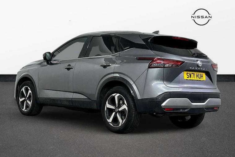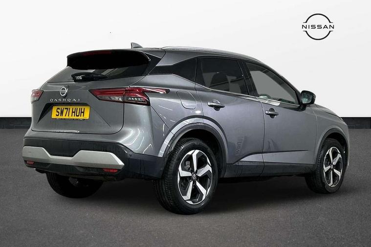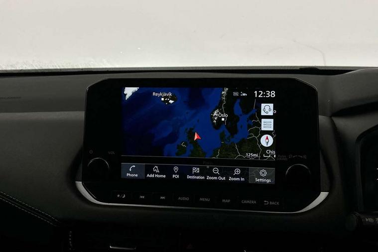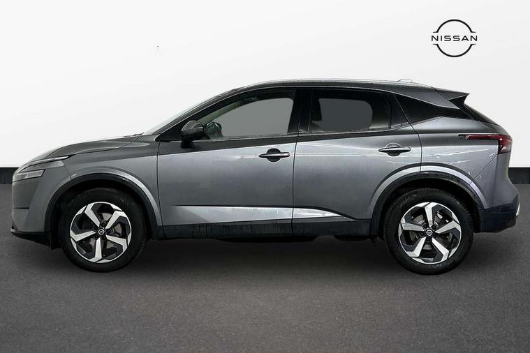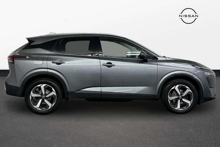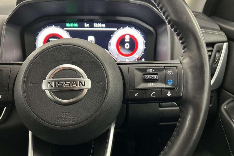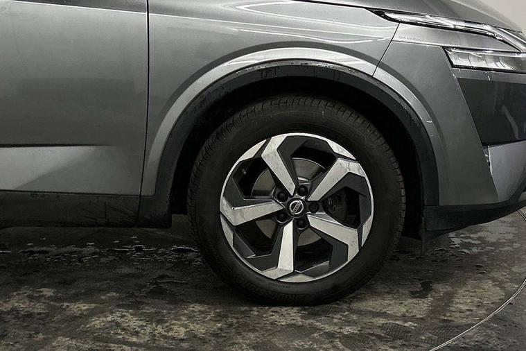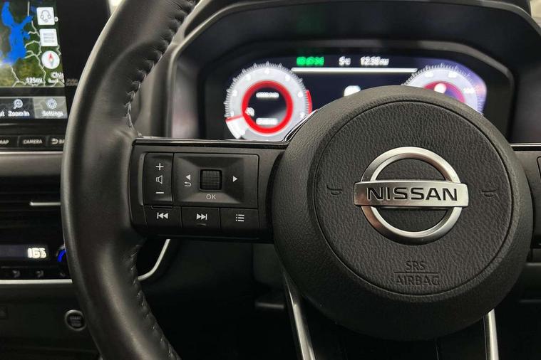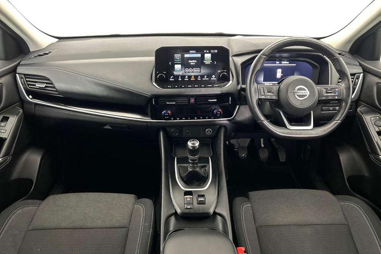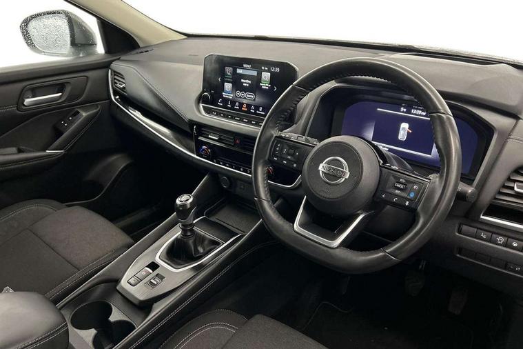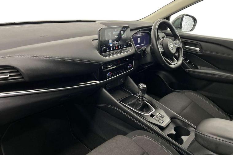 Blind spot warning, Drive modes (sport, normal, eco), Electric speed sensitive power steering, Emergency and breakdown call, Front and rear parking sensors, Full Digital 12.3" TFT Digital Combimeter, Idle stop/start system, Intelligent Cruise control (ICC), Intelligent driver alert system, Intelligent forward collision warning, Intelligent lane intervention, Lane departure prevention, Lane departure warning system, Moving object detection, Push button starter, Rear cross traffic alert, Traffic sign recognition with legal speed adjustment, Trip computer, 6 speakers, AM/FM audio system with DAB, Bluetooth audio streaming, Front USB connections (Type-A and Type-C), Rear USB charging only ports (Type-A and Type-C), 3rd brake light, Auto dimming rear view mirror, Auto rear wiper when reversing, Body colour mirror caps, Body coloured door handles, Bodyside mouldings, Chrome side window finisher, Electric auto folding door mirrors, Electrically adjustable and heated door mirrors with LED turn indicator, Fixed panoramic glass roof with electric sunshade, Follow me home headlights, High beam assist, Intelligent auto headlights, LED daytime running lights, LED rear lights, One touch front and rear electric windows with remote opening and closing, Partially body coloured bumpers, Privacy glass, Rain sensor, Rear roof spoiler, Rear side wing doors, Rear styling plate, Roof rails, Shark fin antenna, Splash free rain sensing wipers, Super UV and infrared cut glass, Three blink turn signal, 12v power socket in dashboard and luggage, 2 way electrical driver lumbar adjustment, 2x Rear coat hooks, 3 bench rear seats in 2nd row, 3 rear headrests, 4 grab handles, 6 Luggage hooks - 4 on floor, 2 on side, 60/40 split folding rear seat bench, Ambient lighting around centre console, Centre console storage tray, Chrome interior door handles, Cloth monoform upholstery, Driver and front passenger sunvisors with illuminated vanity mirrors, Driver seat back pocket, Dual zone automatic climate control with pollen filter, Front centre console and armrest, Front cupholder, Front door with bottle holders, Glovebox with light, Hard trunk cover, Height adjustable driver's seat, Height adjustable front headrests, Leather shift knob, Leather steering wheel, Luggage board system, Luggage space lighting, Manually adjustable passenger (slide recline + lifter), Multifunction steering wheel, Passenger seat back pocket, Rear armrest with 2 cupholders, Rear door bottle holders, Single front passenger seat, Soft PVC kneepad, Steering wheel switches, Tilt/telescopic adjustable steering wheel, Two rear isofix child seat anchorage points with top tether, Welcome light and console tray ambient lighting, Connectivity Pack - Qashqai, Tech Pack (Drive Assist + HUD), 3x3 point rear seatbelt pretensioners + load limiters, ABS, ESP, EBD and brake assist, Active brake limited slip, Auto hold function, Child locks on rear doors, Curtain and front side, far side airbags, Driver and passenger airbags, Driver, passenger and 2nd row rear seat belt reminder, Electronic parking brake, Front seatbelt pretensioners + load limiters, Height adjustable front seatbelts, Hill start assist, Intelligent blind spot intervention, Intelligent front emergency braking with pedestrian, cyclist recognition and junction assist, Intelligent rear automatic braking, Tyre pressure monitoring system, Vehicle dynamic control, Capless fuel filler, Engine immobiliser, Nissan i-key, Remote central door locking with deadlocking, Thatcham Cat.1 alarm, 18" Diamond cut alloy wheels,