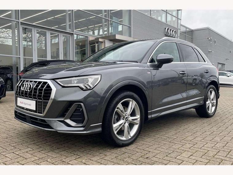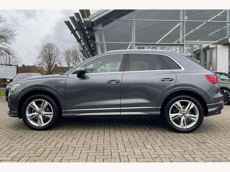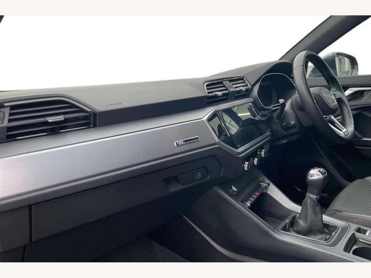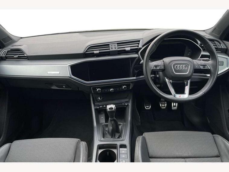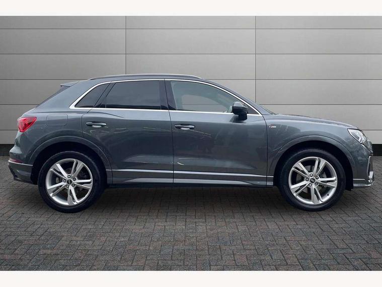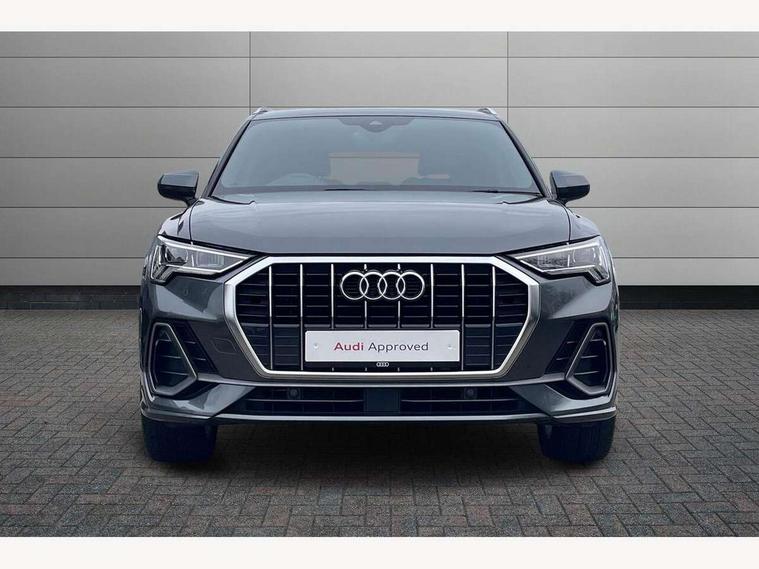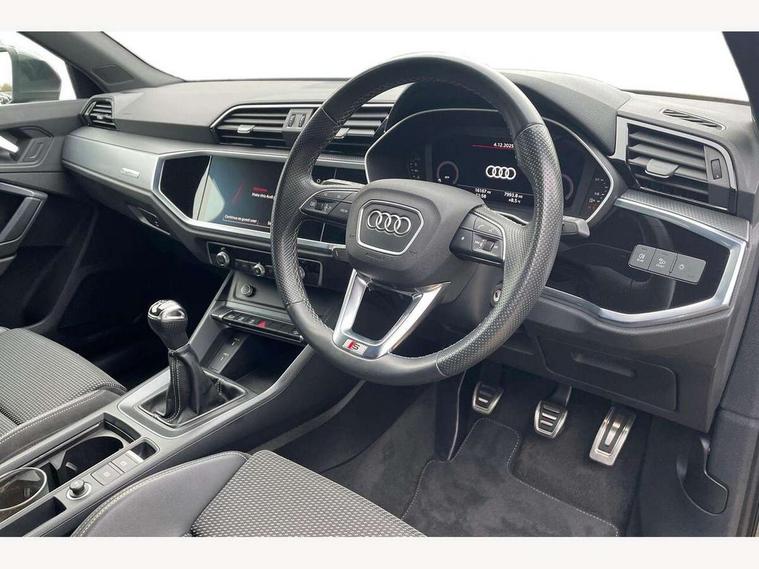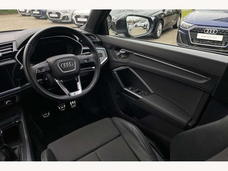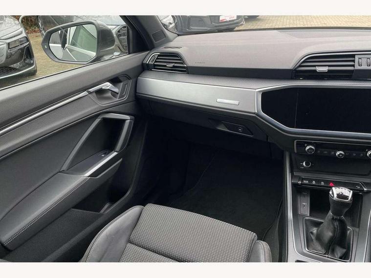 Amazon alexa Integration, Audi connect safety and service (e-call), Audi drive select, Audi lane departure warning, Audi Virtual Cockpit - 10.25" display, Bluetooth interface, Camera based traffic sign recognition, Cruise control + speed limiter, MMI Navigation Plus with high resolution 10.1 inch touchscreen colour display, Power operated tailgate, Progressive steering, Rear parking sensors, Service interval indicator, Smartphone interface includes wireless Apple carplay/Android Auto, Start stop system with recuperation, Voice control system with natural language interaction, Sports suspension, 2 USB-C ports with charge and data functions, 6 passive loudspeakers, DAB digital radio module, Acoustic windscreen, Aluminium roof rails, Aluminium window trim, Auto dimming frameless rear view mirror, Body coloured bumpers, Electrically folding, adjustable and heated door mirrors with integrated LED side indicators and kerb view function for passenger side, Front and rear electric windows, Front fog lights, Front side air inlets in matt platinum grey, Front spoiler blade in matt platinum grey, Grille vertical bars in aluminium silver/Matt, High gloss black finish B and C pillars, LED headlights with LED daytime running lights and dynamic rear indicator, LED rear lights, Privacy glass dark tinted rear and rear-side windows (from B-pillar backwards), Rain and light sensors, Rear diffuser strip in matt titanium black, S line badges on front wings, S Line front and rear bumpers, Side skirt insert in matt Platinium grey, Silver chrome grille surround, Titanium black radiator grille, 12V socket in rear centre console, 40:20:40 folding with manual adjustment for 60:40 forwards/backwards position and backrest angle, Adjustable rear seat bench/backrest with centre armrest and cupholder, Black cloth headlining, Dual zone electronic climate control, Front and rear black floor mats with contrast stitching in rock grey, Front and rear headrests, Front and rear roof module including reading lights, Front centre armrest, Glove compartment lighting, Height and reach adjustable steering wheel, Illuminated door sill trims with S logo, ISOFIX child seat mounting for front passenger with airbag deactivation and outer rear seat including top tether attachment point for outer rear seats, Luggage compartment light, Manual front seats with height adjustment, Perforated leather gearknob, Stainless steel luggage compartment sill finisher, Stainless steel pedals, Non smoking pack - Q3, 3x3 point rear seatbelts, 6 airbags - Driver, front passenger, curtain and side windows, Audi pre-sense front with pedestrain and cyclist recognition, Electrically operated child locks on rear doors, Electromechanical parking brake, Electronic stabilisation control including ABS, ASR and EDL, Hill descent control, Hill hold assist, Pre sense basic, Seatbelt monitoring, Tyre pressure warning, Warning triangle and first aid kit, Anti theft alarm, Anti theft wheel bolts, Remote central locking, Dark matt brushed aluminium inlay, Detail dashboard around MMI touch colour display in glass look, black with surround in aluminium look, Leatherette door armrest,