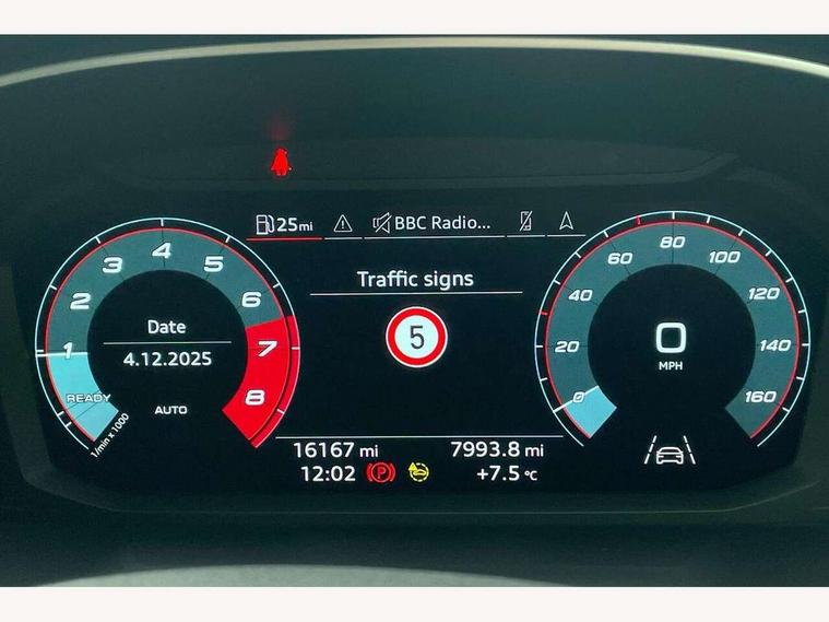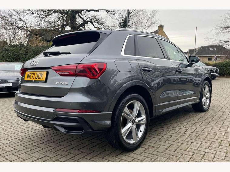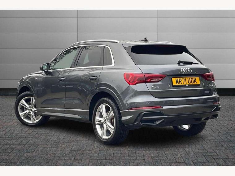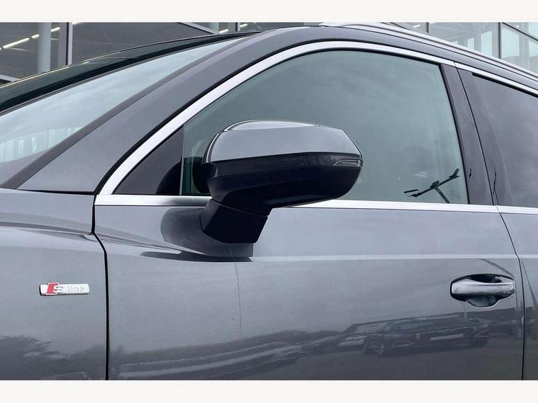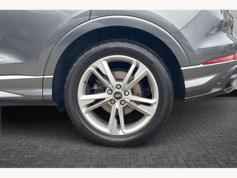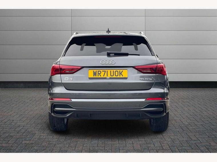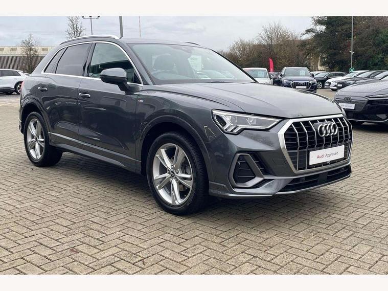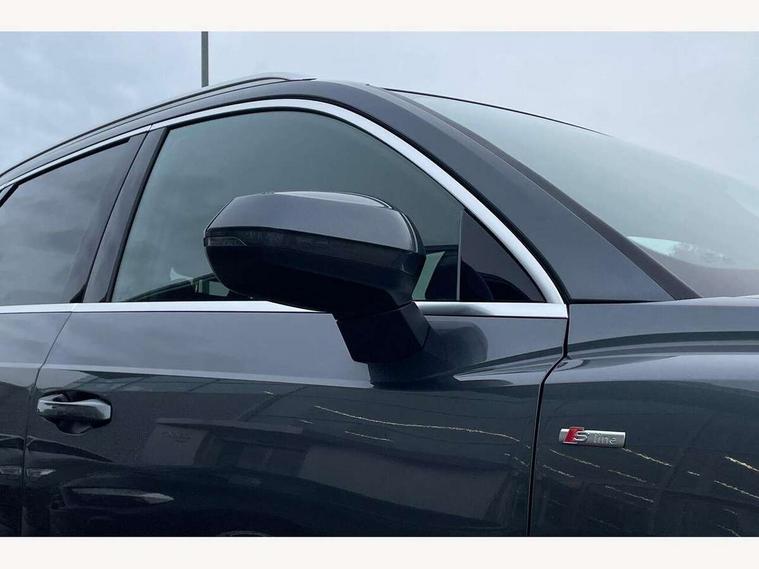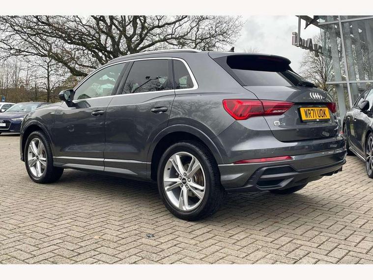 Amazon alexa Integration, Audi connect safety and service (e-call), Audi drive select, Audi lane departure warning, Audi Virtual Cockpit - 10.25" display, Bluetooth interface, Camera based traffic sign recognition, Cruise control + speed limiter, MMI Navigation Plus with high resolution 10.1 inch touchscreen colour display, Power operated tailgate, Progressive steering, Rear parking sensors, Service interval indicator, Smartphone interface includes wireless Apple carplay/Android Auto, Start stop system with recuperation, Voice control system with natural language interaction, Sports suspension, 2 USB-C ports with charge and data functions, 6 passive loudspeakers, DAB digital radio module, Acoustic windscreen, Aluminium roof rails, Aluminium window trim, Auto dimming frameless rear view mirror, Body coloured bumpers, Electrically folding, adjustable and heated door mirrors with integrated LED side indicators and kerb view function for passenger side, Front and rear electric windows, Front fog lights, Front side air inlets in matt platinum grey, Front spoiler blade in matt platinum grey, Grille vertical bars in aluminium silver/Matt, High gloss black finish B and C pillars, LED headlights with LED daytime running lights and dynamic rear indicator, LED rear lights, Privacy glass dark tinted rear and rear-side windows (from B-pillar backwards), Rain and light sensors, Rear diffuser strip in matt titanium black, S line badges on front wings, S Line front and rear bumpers, Side skirt insert in matt Platinium grey, Silver chrome grille surround, Titanium black radiator grille, 12V socket in rear centre console, 40:20:40 folding with manual adjustment for 60:40 forwards/backwards position and backrest angle, Adjustable rear seat bench/backrest with centre armrest and cupholder, Black cloth headlining, Dual zone electronic climate control, Front and rear black floor mats with contrast stitching in rock grey, Front and rear headrests, Front and rear roof module including reading lights, Front centre armrest, Glove compartment lighting, Height and reach adjustable steering wheel, Illuminated door sill trims with S logo, ISOFIX child seat mounting for front passenger with airbag deactivation and outer rear seat including top tether attachment point for outer rear seats, Luggage compartment light, Manual front seats with height adjustment, Perforated leather gearknob, Stainless steel luggage compartment sill finisher, Stainless steel pedals, Non smoking pack - Q3, 3x3 point rear seatbelts, 6 airbags - Driver, front passenger, curtain and side windows, Audi pre-sense front with pedestrain and cyclist recognition, Electrically operated child locks on rear doors, Electromechanical parking brake, Electronic stabilisation control including ABS, ASR and EDL, Hill descent control, Hill hold assist, Pre sense basic, Seatbelt monitoring, Tyre pressure warning, Warning triangle and first aid kit, Anti theft alarm, Anti theft wheel bolts, Remote central locking, Dark matt brushed aluminium inlay, Detail dashboard around MMI touch colour display in glass look, black with surround in aluminium look, Leatherette door armrest,