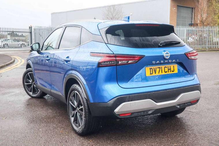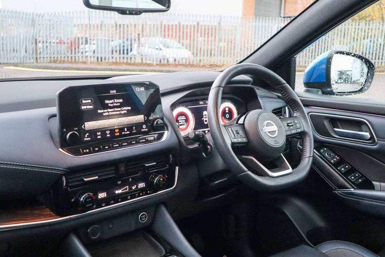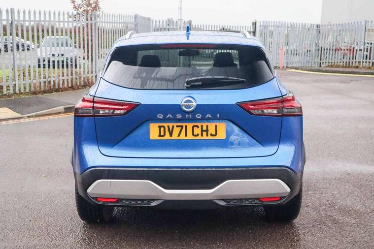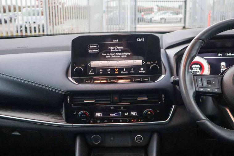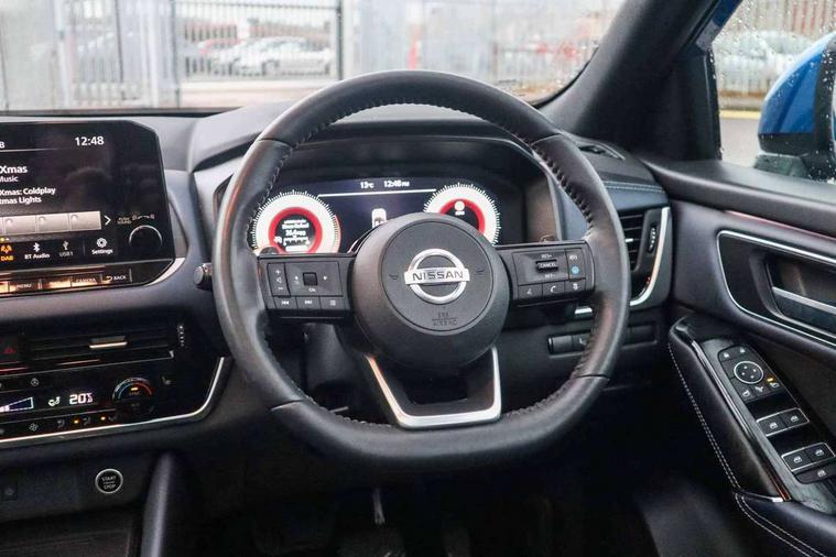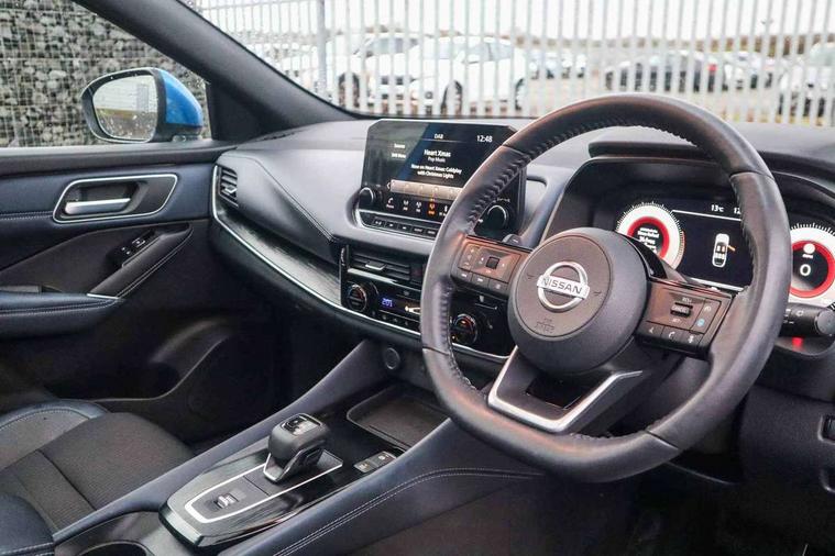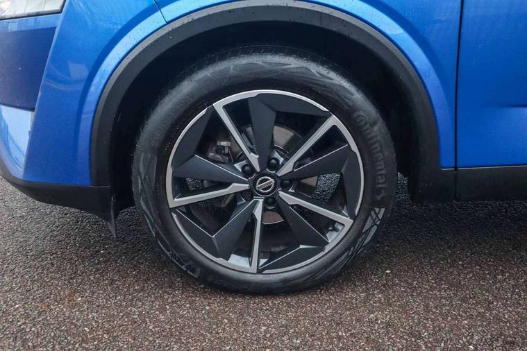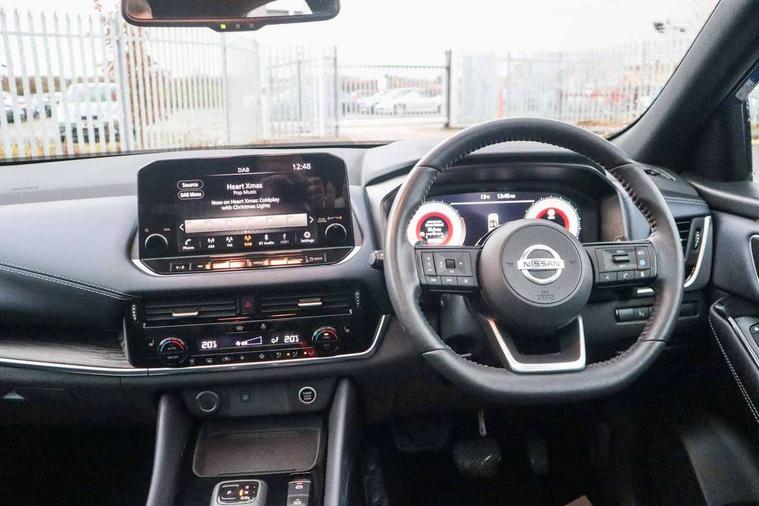 Blind spot warning, Drive modes (sport, normal, eco), Electric speed sensitive power steering, Emergency and breakdown call, Front and rear parking sensors, Full Digital 12.3" TFT Digital Combimeter, Hands free power tailgate, Idle stop/start system, Intelligent Cruise control (ICC), Intelligent driver alert system, Intelligent forward collision warning, Intelligent lane intervention, Lane departure prevention, Lane departure warning system, Moving object detection, Push button starter, Rear cross traffic alert, Traffic sign recognition with legal speed adjustment, Trip computer, 6 speakers, AM/FM audio system with DAB, Bluetooth audio streaming, Front USB connections (Type-A and Type-C), Rear USB charging only ports (Type-A and Type-C), Auto dimming rear view mirror, Auto rear wiper when reversing, Body colour mirror caps, Body coloured door handles, Bodyside mouldings, Chrome side window finisher, Electric auto folding door mirrors, Electrically adjustable and heated door mirrors with LED turn indicator, Fixed panoramic glass roof with electric sunshade, Follow me home headlights, Intelligent auto headlights, LED daytime running lights, LED signature rear lights, One touch front and rear electric windows with remote opening and closing, Partially body coloured bumpers, Privacy glass, Rear roof spoiler, Rear styling plate, Roof rails, Shark fin antenna, Splash free rain sensing wipers, Super UV and infrared cut glass, Three blink turn signal, 12v power socket in dashboard and luggage, 2 way electrical driver lumbar adjustment, 2x Rear coat hooks, 3 rear headrests, 4 grab handles, 6 Luggage hooks - 4 on floor, 2 on side, 60/40 split folding rear seat, 8 way electric adjustable drivers seat, Ambient lighting around centre console, Ambient lighting in front doors, Centre console storage tray, Chrome interior door handles, Cloth/syntech leather monoform upholstery, Dark headlining, Driver and front passenger sunvisors with illuminated vanity mirrors, Driver seat back pocket, Dual zone automatic climate control with pollen filter, Front centre console and armrest, Front cupholder, Front door with bottle holders, Glovebox with light, Hard trunk cover, Height adjustable front headrests, Leather steering wheel, Luggage board system, Luggage space lighting, Manual lumbar support on passenger seat, Manually adjustable passenger (slide recline + lifter), Multifunction steering wheel, Passenger seat back pocket, Rear armrest with 2 cupholders, Rear door bottle holders, Soft PVC kneepad, Steering wheel gearshift paddles, Steering wheel switches, Tilt/telescopic adjustable steering wheel, Two rear isofix child seat anchorage points with top tether, Welcome light and doors with console tray ambient lighting, Heat pack - Qashqai, Tech Pack (ProPILOT + HUD), 3x3 point rear seatbelt pretensioners + load limiters, ABS, ESP, EBD and brake assist, Active brake limited slip, Auto hold function, Child locks on rear doors, Curtain and front side, far side airbags, Driver and passenger airbags, Driver, passenger and 2nd row rear seat belt reminder, Electronic parking brake, Front seatbelt pretensioners + load limiters, Height adjustable front seatbelts, Hill start assist, Intelligent blind spot intervention, Intelligent front emergency braking with pedestrian, cyclist recognition and junction assist, Intelligent rear automatic braking, Tyre pressure monitoring system, Vehicle dynamic control, Capless fuel filler, Engine immobiliser, Nissan i-key, Remote central door locking with deadlocking, Thatcham Cat.1 alarm, 19" Alloy wheels,