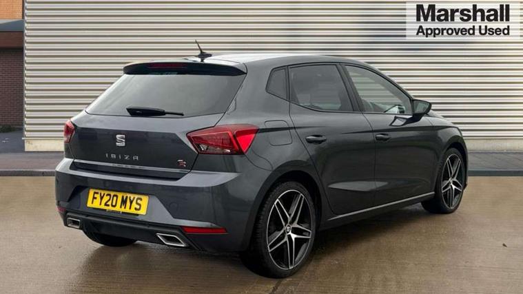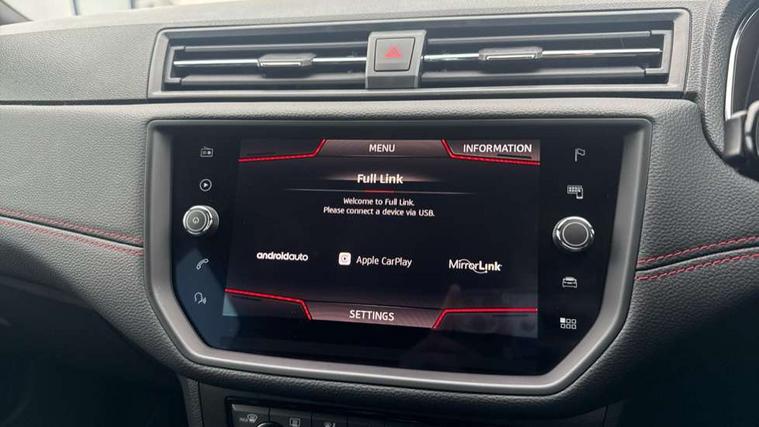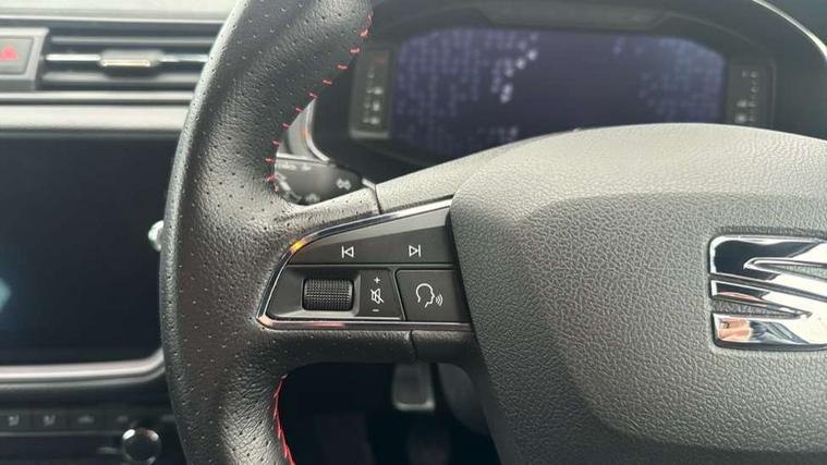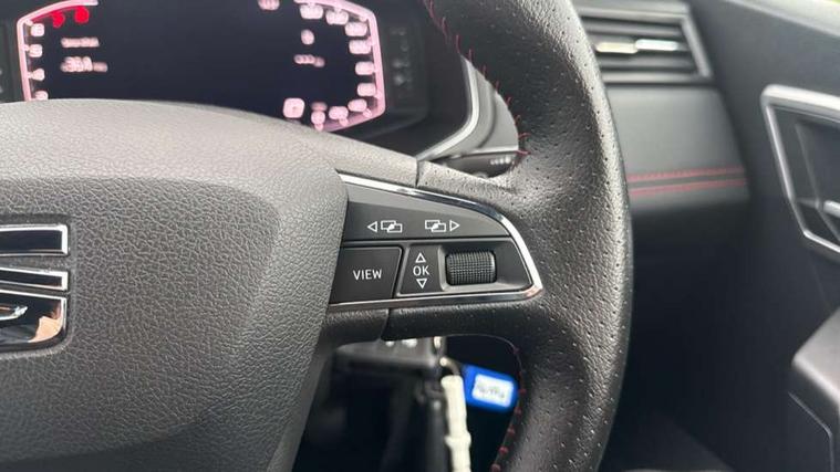 'Lights On' Reminder warning buzzer, Bluetooth Handsfree Phone Connection, Cruise control, Digital clock, Digital cockpit, Full Link Smartphone Integration with Mirror Link, Apple Car Play, Google Android Auto, Low fuel warning light, Outside temperature gauge, Power Steering, Satellite navigation system with 3D mapping, 8" touch screen, voice control and additional USB port, SEAT Drive profile, SEAT logo boot release, Trip computer, Sports suspension, 6 speakers, Auxiliary input socket, CD player, Digital Audio Broadcast (DAB) Tuner, Radio/MP3 player, SD card slot, SEAT USB media cable, Steering wheel mounted controls, USB port, Anti theft roof antenna, Auto dimming rear view mirror, Automatic headlights, Automatic rain sensing wipers, Body colour bumpers, Body colour door handles, Brilliant black door mirrors, Chrome front grille frame, Chrome grille, Coming/leaving home lighting function, Cornering front fog lights, Dark tinted rear windows, Electric folding door mirrors, Electric front windows, Electric headlight adjustment, Electrically adjustable and heated door mirrors, Exclusive FR rear bumper, Full LED headlights, LED daytime running lights, LED tail lights, Rear fog lights, Twin exhaust pipes, 3 rear headrests, 60/40 split folding rear seat, Door and steering wheel ice metal decorative inserts, Driver's sunvisor with ticket holder/vanity mirror, Dual zone climate control, Dust/pollen filter, Flat bottomed perforated leather steering wheel with red stitching and FR logo, Front courtesy lights, Front cupholders x 2, Front reading lights, Gear shift indicator, Glovebox, Height adjustable driver's seat, Height adjustable front/rear head restraints, Height adjustable passenger seat, Height/reach adjust steering wheel, Illuminated boot, Instrument lighting with brightness control, Leather dashboard, Leather handbrake, Microsuede cloth upholstery, Multi-colour ambient interior lighting, Passenger sunvisor, Rear top tether child seat ISOFIX attachment, Sports seats, Full LED headlight pack - Ibiza, 3 point seatbelts on all 3 rear seats, ABS, Active front headrests, Child locks on rear doors, Curtain airbags, Driver/Front Passenger airbags, ESP+EBA, Front assist (AEB), Front passenger airbag deactivation, Front side airbags, Hill hold control, Multi-Collision braking, Seatbelt warning, Tiredness recognition system, Tyre pressure monitoring system, Electronic engine immobiliser, Locking wheel bolts, Remote central locking + deadlocks, Volumetric alarm with back up horn, 18" Performance machined bi-colour alloy wheels,