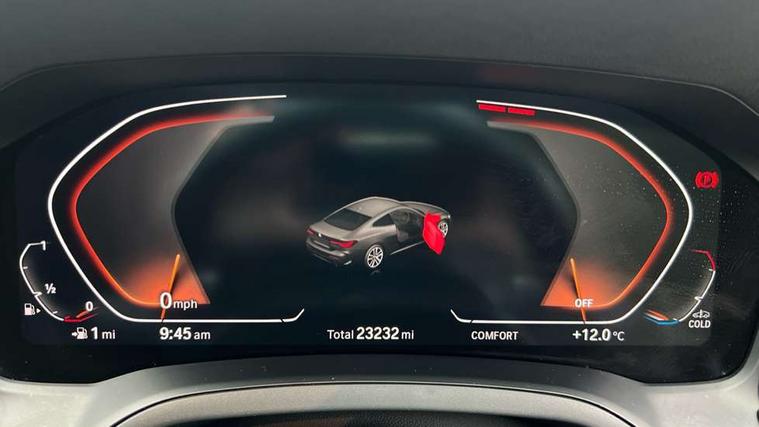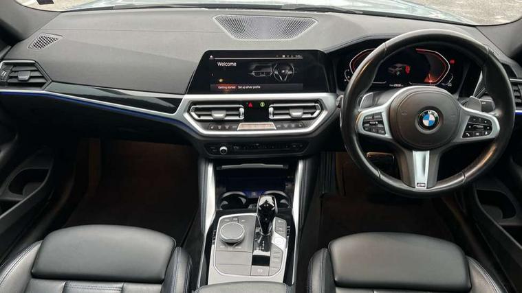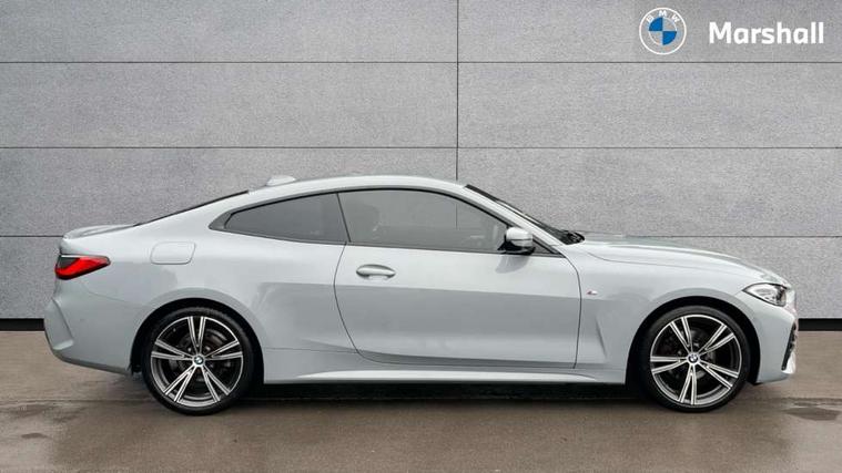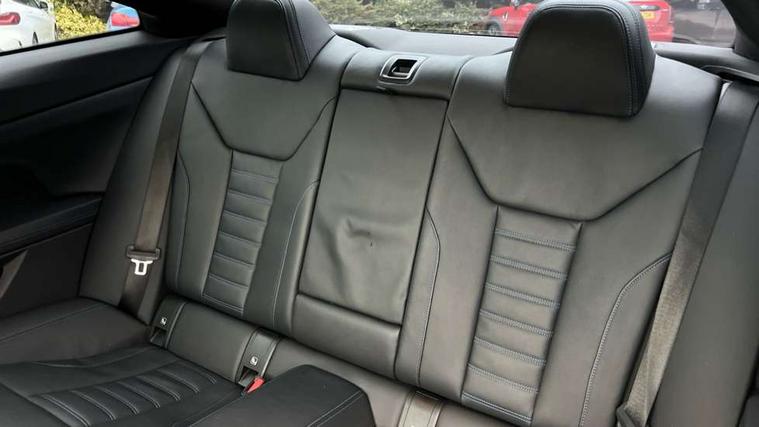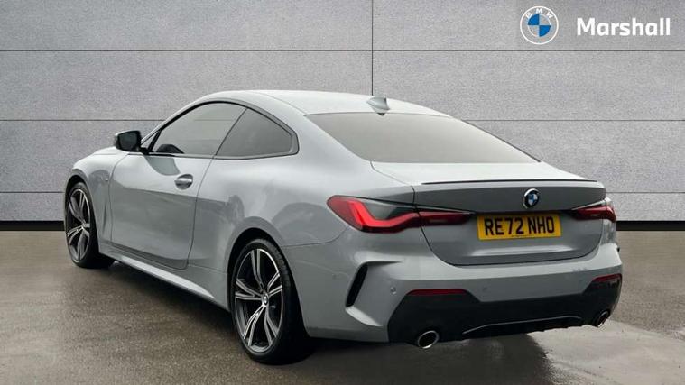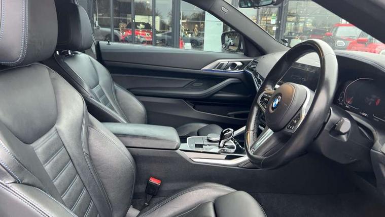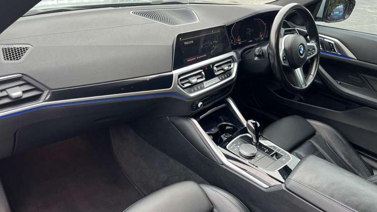 Active guard plus, Attentiveness assist, Auto start-stop, BMW ConnectedDrive online services, BMW iDrive controller on centre console, BMW Live Cockpit Professional Nav with 12.3" instrument display + 10.25" display, Intelligent Voice Assist, BMW OS 7, HDD, 2USB, 4G LTE connect, BMW service history, BMW Teleservices, Brake pad wear indicator in front and rear, Check Control warning system for monitoring of lights and door/luggage compartment open warning, Condition based service, Cruise control with speed limit function, Electric power steering with Servotronic steering optimised at all speed ranges, Gearshift time display in manual mode, Instrument cluster with speedometer with mph readout, tachometer, fuel gauge and oil temperature gauge, Integrated owners handbook, Oil sensor for level and grade, warning by check control system, On board computer - average speed, fuel consumption, outside temp display with acoustic warning, clock/date, service interval, odometer/trip meter, Optimum shift indicator, Run flat indicator, Shifting point display, Touch control functionality for BMW Live Cockpit Professional Nav, Variable sport steering, 8 speed automatic steptronic transmission with gearshift paddles, Balanced 50/50 weight distribution, Double joint spring strut front axle, Double VANOS, Drive performance control - ECO PRO, comfort and sport modes, High precision injection, Low centre of gravity, M sport suspension, Petrol Particulate Filter, Stroke dependent dampers, VALVETRONIC engine management, 2x USB Type C ports in front centre console for charging and data transfer, 2x USB Type C ports in rear centre console for charging, DAB tuner, Electronic service booklet, Acoustic glazing, Automatic headlight beam throw control with load dependent regulating reaction, dynamic compensation of braking dive and acceleration squat, Automatic windscreen wipers and automatic headlight, Automatically dimming electrochromatic rear view mirror, BMW emblem on engine compartment lid and tailgate, BMW kidney grille with mesh grille front side of the nuggets in matt aluminium and frame in chrome high gloss, Body colour fuel filler flap, Body colour roof fin, Brushed aluminium inserts in the front door sill finishers with BMW designation, Door sill strips, Dynamic brake lights, Electric windows - front and rear, with open/close fingertip control, anti trap facility and comfort closing function all round, Exterior mirrors - electrically folding with anti-dazzle, Fading support, Follow me home headlights, Front and rear bumper system, Front apron plastic in body colour, Green tinted heat protection glazing, High gloss shadow line exterior trim, Illuminated bow type door handles in body colour drivers side with door lock, Interior rear view electrochromatic mirror with automatic anti dazzle function, LED daytime running lights, LED front fog lights, LED front indicators, Licence plate panel integrated into front bumper and tailgate, Lightweight engineering, M designation on front side panels, left and right, M rear boot spoiler, Model designation on right side of tailgate, One piece front bumper cover including towing eye cover in body colour, Preparation for high beam assistant, Rear boot, Reversing light, Side frame decorative moulding black matt, Two part LED tailights in L-shape with components in smoked glass, brake light, LED turn indicator and rear fog light, Visible exhaust tailpipe finisher, Visible VIN plate, Welcome lights in interior and door handle area, Widened track and increased camber values for max transverse dynamics, agility and steering precision, Window recess cover black high gloss, Windscreen wipers with integrated heated washing jets, 12V power socket in front centre console, 2 front cupholder in centre console with clamping elements and matt black inlay, 2 Rear seat headrests, 2 seat bench in second row, 3 spoke M sport leather multifunction steering wheel, 3 zone automatic air conditioning, 4 pieces lashing eyelets in luggage compartment, 40:20:40 split folding rear seat and rear centre armrest with two cupholders, Anthracite headlining, Armrest integrated in front and rear door trim + front centre console armrest, BMW ID, Driver seat backrest width adjustment, Four grab handles integrated in roof lining, Front and rear door pockets, Front and rear reading lights, Front sport seats, Heated driver and front passenger seats, Height adjustable front headrests, Height adjustable mechanically and infinitely variable steering column, Illuminated armrest storage compartment, Illuminated glove compartment with separate small compartment, Make-up mirror lights, Single front passenger seat, Storage compartment in rear centre console, Sunvisors with illuminated vanity mirrors and ticket pocket, Toolkit located in luggage compartment, Velour front floor mats, Vernasca leather upholstery, Ambient lighting pack - 4 Series, Connected professional pack - 4 Series, M sport exterior styling pack - 4 Series, 2 x 3-point rear seatbelts, Battery safety cut-off, BMW emergency call, Brake energy regeneration, Braking pre-tensioning, Child seat ISOFIX attachment for the two outer rear seats, Coasting in idle in ECO PRO mode, Cornering brake control (CBC), Crash sensor activating of airbags, Unlocking doors, hazard warning lights, interior light, safety battery terminal, Driver and front passenger side airbags, integrated in the door side seat backrest bolsters for all seat variants, Driver/Front Passenger airbags, Dry braking, Dynamic brake control, Dynamic stability control + (DSC+) - Anti-lock Braking System (ABS) with brake assist and cornering brake control + Automatic Stability Control (ASC), Dynamic Traction Control - DTC, Electric parking brake including automatic hold function and automatic release of the parking brake when driving off, Electronic differential lock control (EDLC), Front and rear ventilated brake disc, Front passenger manual airbag deactivation, Head airbags for all 4 outer seats, Hil