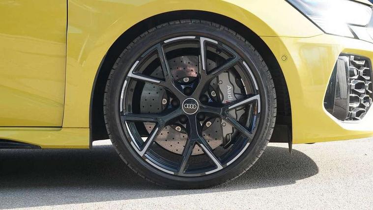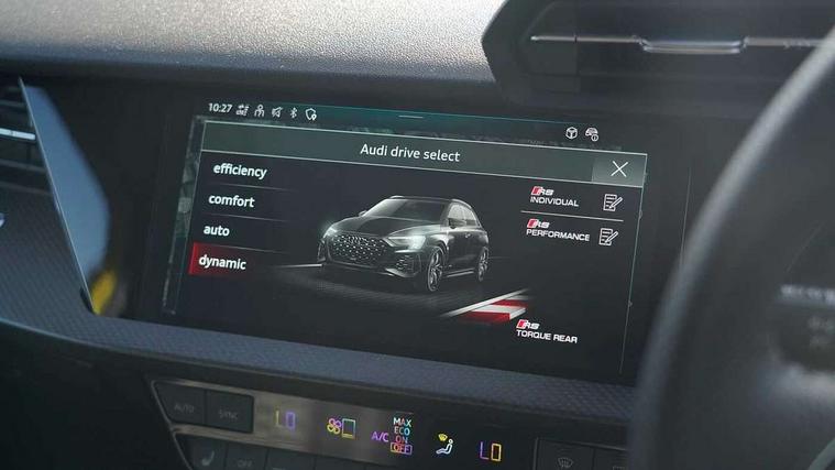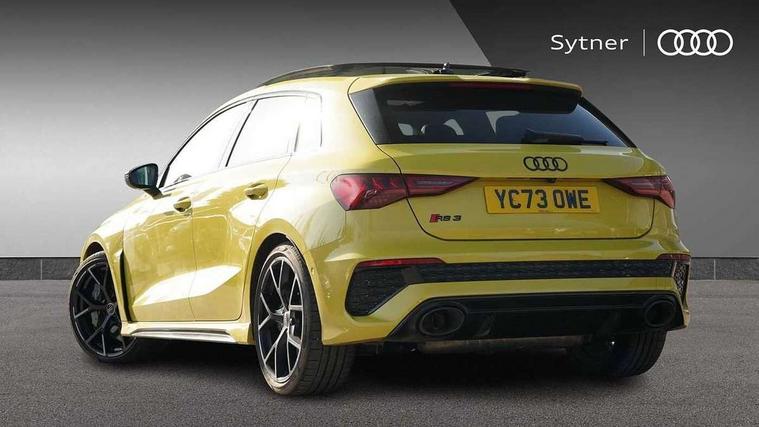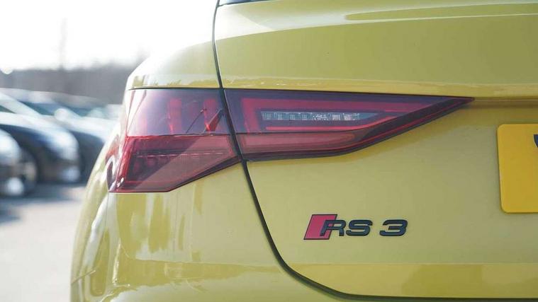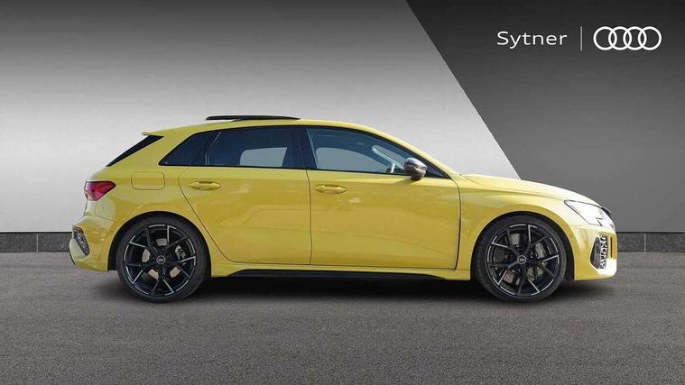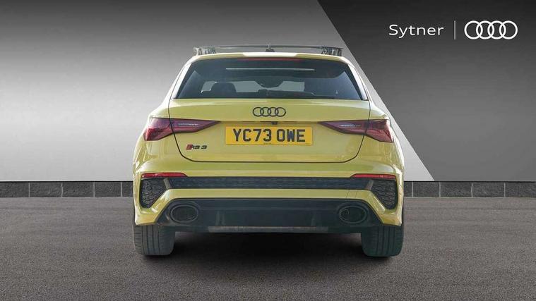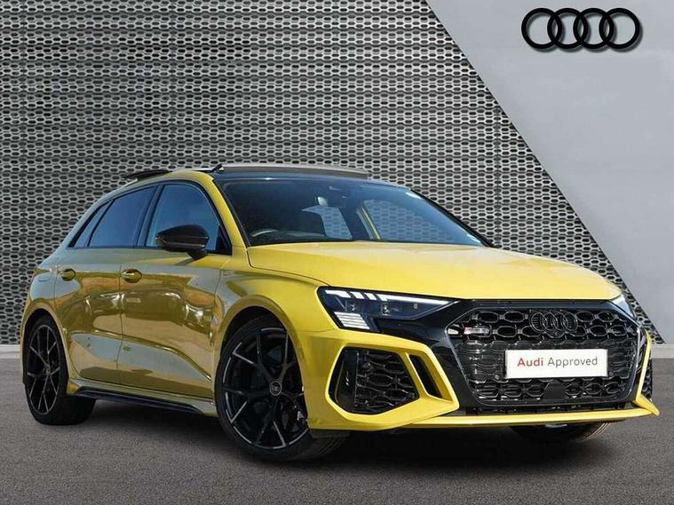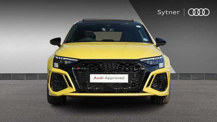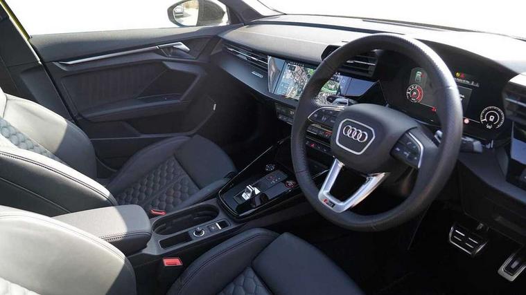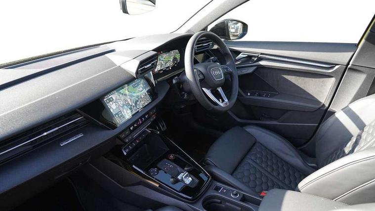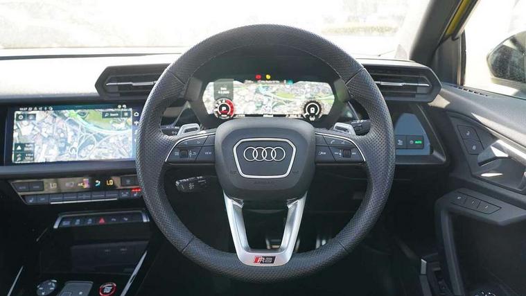 Adaptive cruise assist, Adaptive cruise control, Audi smartphone interface, Audi virtual cockpit with RS specific display 12.3" full colour digital instrument cluster, Automatic start/stop system with recuperation, Bluetooth interface, Camera based traffic sign recognition, Collision avoidance assistant, Emergency e-call, Head up Display, Lane departure warning system, Legal emergency call, Parking assist with parking system plus, Power operated tailgate - Luggage compartment lid opens electrically, Progressive power assisted steering, Reversing camera, Quattro permanent four wheel drive, Rear suspension, DAB Digital radio, 3rd brake light, Acoustic glass windscreen, Audi beam uses LEDs to project the Audi sport logo onto the ground as you exit your RS 3, Audi matrix LED headlights, LED rear lights, dynamic front and rear indicators and headlight cleaning system, Auto dimming rear view mirror, Black side skirts, Body colour roof, Carbon exterior door mirror, Carbon fibre engine cover, Daytime running lights, Electric adj heated/folding + auto dimming exterior mirrors with memory + LED indicator + auto kerb side function for passenger side exterior mirror, Front spoiler in high gloss black, Heat insulating glass windscreen, Light and rain sensors, Panoramic glass sunroof, Privacy glass - dark tinted rear and rear side windows from B-pillar backwards, Rear side wing doors, Rear window wiper and washer system, RS exterior features in gloss black, RS sports exhaust system, 3 seat bench in 2nd row, 3 spoke leather multifunction steering wheel with gear shift paddles, 4 way lumbar support for front seats, 40/20/40 split folding rear seat bench, Black cloth headlining, Dual zone electronic climate control, Electrically adjustable front seats with memory function for driver's side, Front and rear headrests, Front centre armrest, Front sports seats RS embossed logo, Front/rear floor mats, Heated front seats, Honeycomb stitching and RS embossing, Illuminated door sill trims inlays in aluminium with RS 3 logo, Illuminated vanity mirror, RS emblems, Single front passenger seat, Stainless steel pedals and front footrest in black, Aluminium interior elements pack - RS3, Ambient lighting pack - RS3, Comfort and sound pack - RS3, Driver assistance pack with 3 spoke leather multi function steering wheel - RS3, MMI navigation plus with MMI touch - RS3, RS bodystyling - RS3, Storage Pack - RS3, 3x3 point rear seat belts, ABS/EBD, ASR, Audi pre sense front, Driver/Front Passenger airbags, EDL, ESC - Electronic Stability Control + traction control, Front passenger airbag deactivation, Front side airbags with head airbags and interaction airbag, Hill hold assist, Seat belt reminder with passenger presence detection in rear, Tyre pressure loss indicator, Warning triangle and first aid kit, Anti theft alarm, Anti-theft wheel bolts, Electronically operated child lock, Remote control central locking, Full decorative carbon trim, 19" 5 Y spoke black with graphic print alloy wheels, Tool kit, Tyre repair kit,