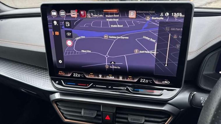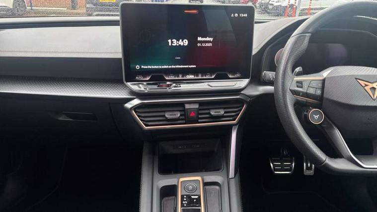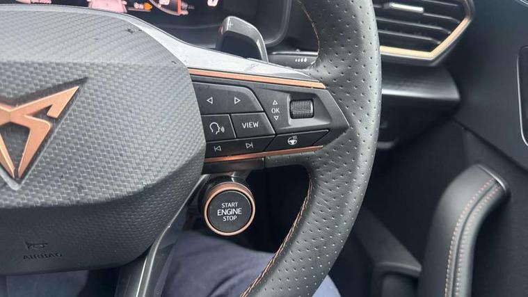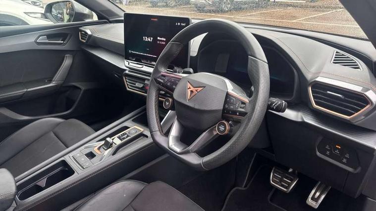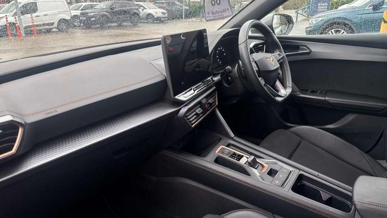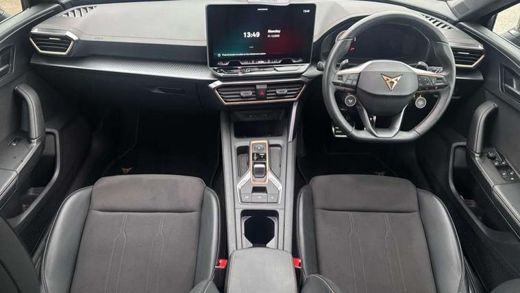 Adaptive cruise control with follow-to-stop and speed limiter, CUPRA drive profile selection with (Comfort/Sport/Individual), throttle response and gearshift mode, Digital cockpit, Dynamic road sign display, E-call, Four x USB Type C ports (2 in front and 2 in rear), Front and rear parking sensors, Front assist with forward collision warning braking reaction to vehicles, pedestrians and cyclists, Full link smartphone integration with Mirror Link, wireless Apple CarPlay and wired Google Android Auto, Lane assist, Lockable tailgate, PAS, RPM, trip computer, outside temp gauge, instrument light brightness, low fuel warning light, lights on reminder, gearshift indicator, Service interval indicator, Start/stop system with regenerative braking, Wireless phone charger, 7 speakers, Auxiliary input socket, Auto dimming rear view mirror, Body colour door handles, Body coloured bumpers, Cupra sports bumpers, Dark tinted rear windows, Electric front/rear windows, Electrically adjustable, heated and folding door mirrors, High beam assist, LED front fog lamps with cornering function, LED headlights with dynamic turn signals, tail lights, rear fog lights with rear coast to coast lighting, LED rear fog lamp, Rain sensing wipers, Rear side wing doors, Rear wash/wipe, Separate daytime running light with automatic headlight control and coming home feature, Third brake light, Welcome light with logo projector in door mirrors, 12v power supply in centre console, 3 seat bench in 2nd row, 5 headrests, 60/40 split rear bench seat with armrest, Ambient lighting with glovebox, footwell and single monocolour, Black headlining, Cloth/PVC upholstery, Cupra sports pedals, CUPRA Supersports, heated steering wheel with satellite buttons, Driver and passenger seat with manual height and lumbar adjustment, Folding boot cover, Front and rear reading lights X 4, Front centre armrest, Height/reach adjust steering wheel, Illuminated interior front door sills, ISOFIX points in outer rear seats with top tether anchorage points, Single front passenger seat, Storage pockets on rear of front seats, Sunvisors with illuminated mirror, Three zone climate control, Media system plus with 12.9" display + navigation pack - Leon Cupra, 3 point seatbelts on all rear seats, ABS, Brake control system - ESC and brake booster, Child proof door locks, Cupra black brake calipers, Driver and front passenger airbags with front passenger airbag de-activation, front side and curtain airbags, Electronic parking brake, Hill hold control, Rear disc brakes, Seat belt reminder for front and rear seats, Tiredness recognition system, Tyre pressure monitoring system, Anti theft alarm system with interior monitoring in cab, backup horn and towing protection, Central locking system Keyless Go, Locking wheel bolts, Chrome and copper interior detailing, 18" Windstorm machined sport black matt and silver alloy wheel with 92Y XL tyres, Tool kit,