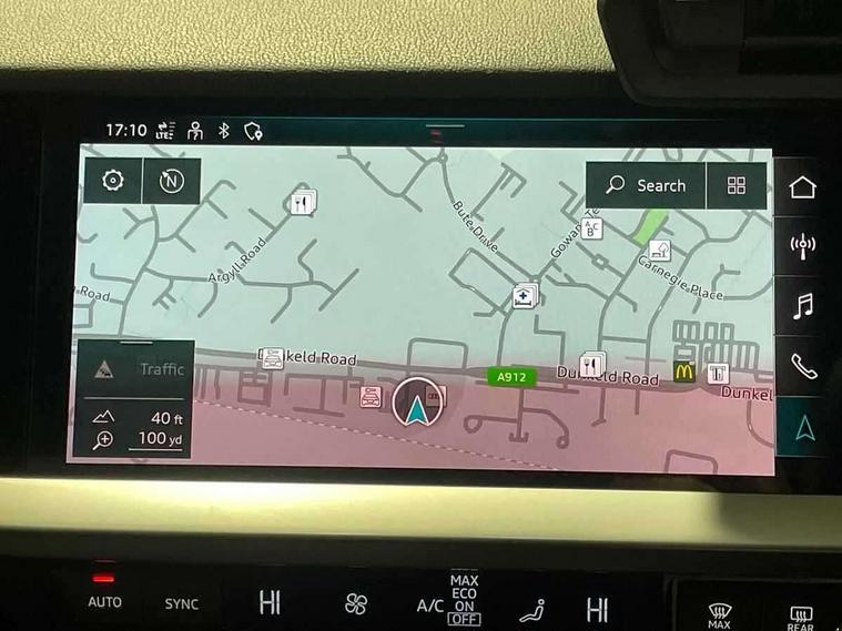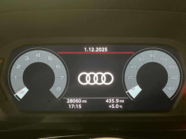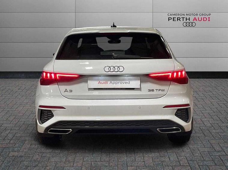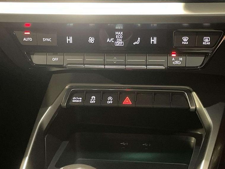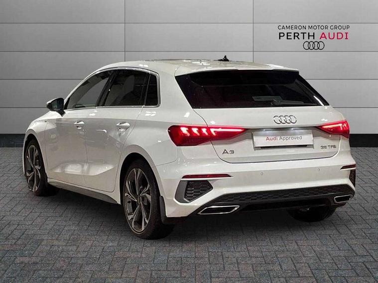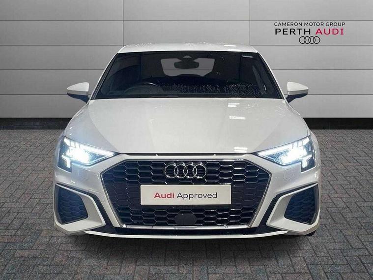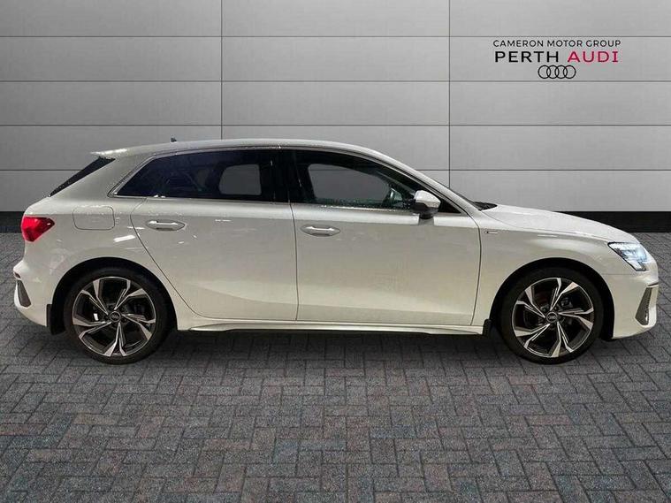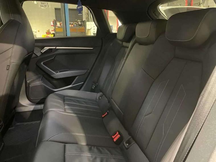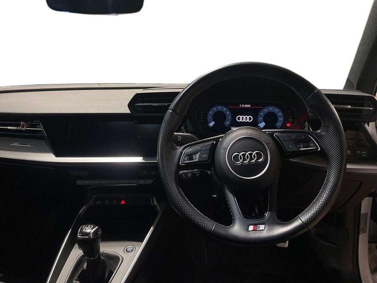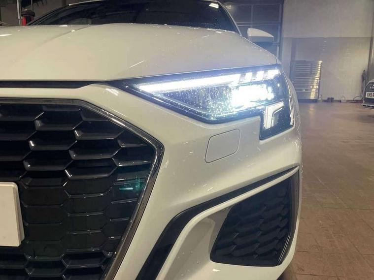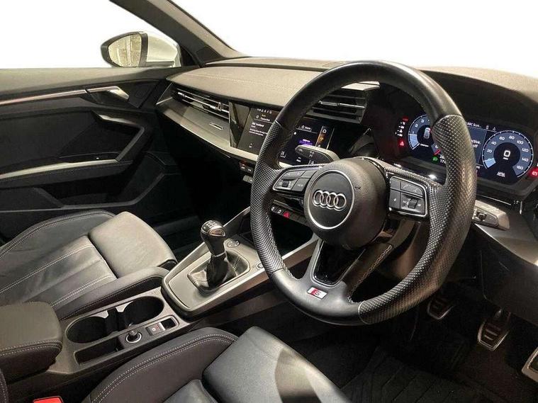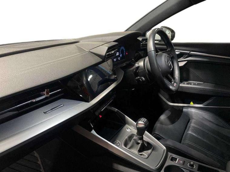 Audi drive select (Auto, Comfort, Dynamic, Efficiency and Individual), Audi smartphone interface, Audi Virtual Cockpit - 10.25" digital and colour instrument cluster, Automatic start/stop system with recuperation, Bluetooth interface, Collision avoidance assistant, Cruise control, e-Call (emergency call), Electromechanical power speed sensitive steering, Lane departure warning system, MMI Navigation Plus with high resolution 10.1" colour touch screen display, Rear parking sensors, Service indicator, Trip computer, Voice control system with natural language interaction, 2xUSB-C connection with data and charging functions, 6 passive loudspeakers, DAB Digital radio, 3rd brake light, Acoustic glass windscreen, Aluminium window trim, Auto dimming frameless rear view mirror, Electrically adjustable/heated/folding/auto dimming door mirrors with integrated LED indications + kerb view function for passenger side, Front electric windows, Illuminated aluminium inserts front door sills with S logo, LED daytime running lights, LED headlights with LED rear lights and dynamic rear indicators, Light and rain sensors, Privacy glass - dark tinted rear window, rear door and side windows, Rear electric windows, Rear side air outlets in grained matt black, Rear side wing doors, Rear wiper, S line bumpers, S roof spoiler, 12V socket and storage compartment in front centre console, 3 seat bench in 2nd row, 40/20/40 split folding rear seat bench with cupholder, Black cloth headlining, Dual zone electronic climate control, Front and rear centre armrest in leather, Front and rear headrests, Front/rear floor mats, Height and reach adjustable steering wheel, Illuminated vanity mirror, Interior lighting - glove compartment light and right hand side, Luggage compartment floor covering, Manual boot compartment lid, Manually adjustable front seats, Seat side bolsters, Single front passenger seat, Stainless steel pedals and front footrest in black, Twin leather upholstery with front sports seats S embossed logo, Aluminium interior elements pack - A3 Sportback, S line styling pack - A3 Sportback, 3x3 point rear seat belts, Audi pre sense front, Driver and front passenger airbag with passenger airbag deactivation, Electronic Stabilisation Control (ESC) including ABS, ASR and EDL, First aid kit with warning triangle and 2 safety vests, Front side airbags with head airbags and interaction airbag, Pre-sense front with pedestrian and cyclist detection, Seatbelt monitoring, Tyre pressure loss indicator, Anti theft alarm, Anti-theft wheel bolts, Immobiliser, Manual child locks, Remote control central locking, Accent surfaces in the dashboard and centre console in platinum grey silk effect paint finish, Dark spectrum aluminium inlays,