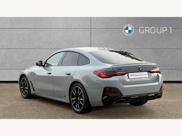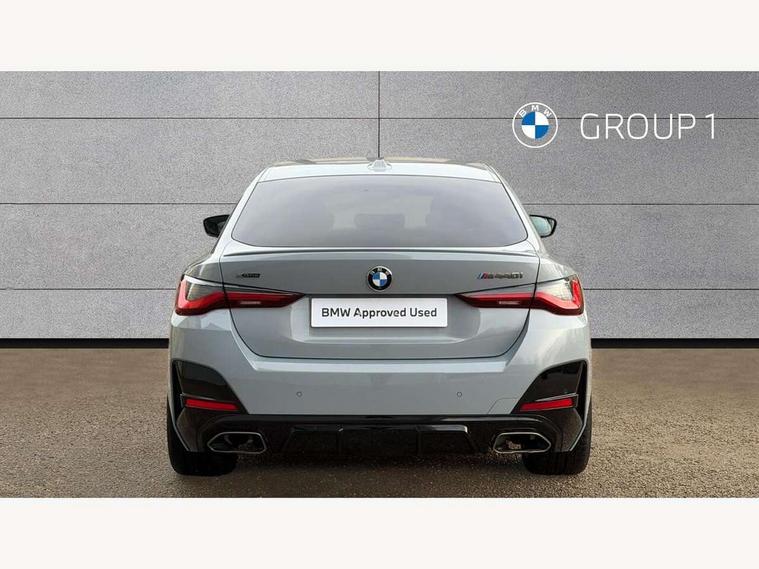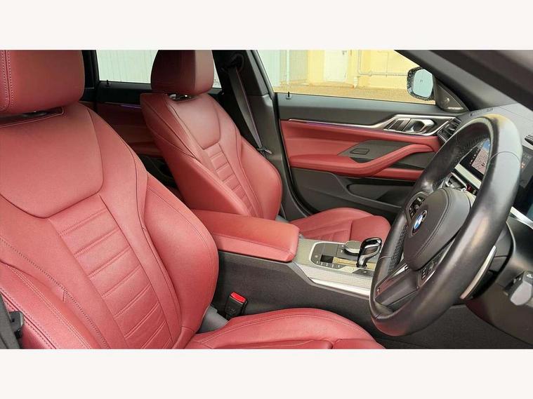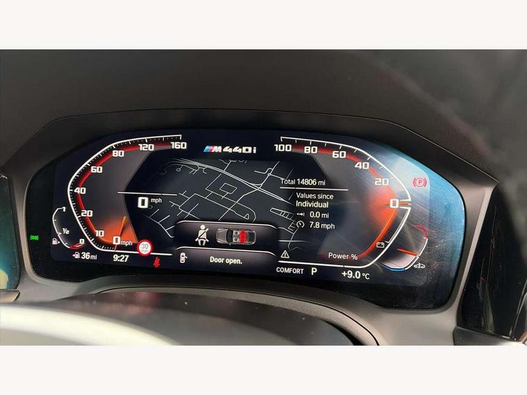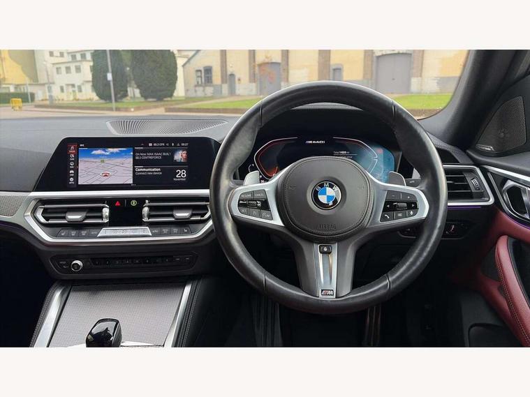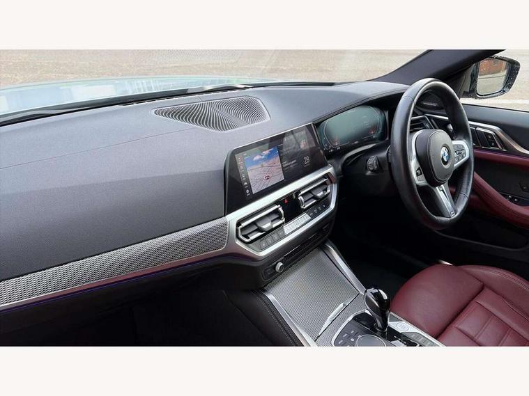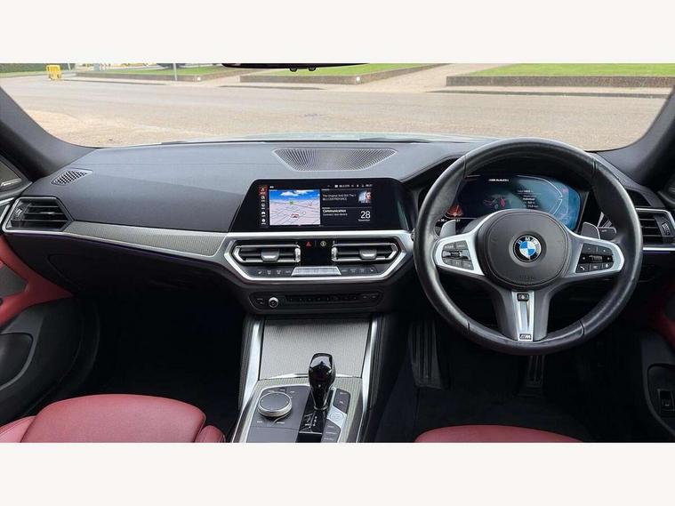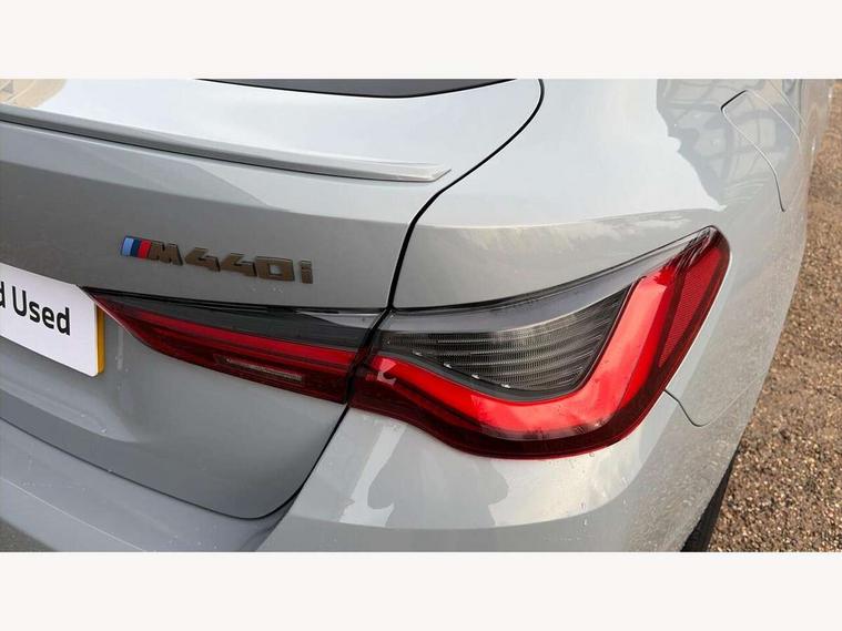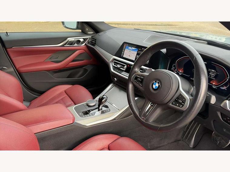 Active guard plus, Attentiveness assist, Auto start-stop, Bluetooth hands free facility with USB audio interface with audio streaming, BMW ConnectedDrive online services, BMW iDrive controller on centre console, BMW Live Cockpit Professional Nav with 12.3" instrument display + 10.25" display, Intelligent Voice Assist, BMW OS 7, HDD, 2USB, 4G LTE connect, BMW service history, BMW Teleservices, Brake pad wear indicator in front and rear, Check Control warning system for monitoring of lights and door/luggage compartment open warning, Condition based service, Electric bootlid, Electric power steering with Servotronic steering optimised at all speed ranges, Gearshift time display in manual mode, Instrument cluster with speedometer with mph readout, tachometer, fuel gauge and oil temperature gauge, Integrated owners handbook, Oil sensor for level and grade, warning by check control system, On board computer - average speed, fuel consumption, outside temp display with acoustic warning, clock/date, service interval, odometer/trip meter, Optimum shift indicator, Tailgate, Variable sport steering, 48V Mild hybrid technology, 8 speed automatic steptronic transmission with gearshift paddles, Adaptive M suspension, Driving experience modes - Comfort, ECO PRO, Sport and Sport+ mode, Low centre of gravity, M Sport differential, Petrol Particulate Filter, Stroke dependent dampers, xDrive system permanent all-wheel drive variable torque distribution, DAB tuner, Electronic service booklet, Acoustic glazing, Automatic headlight beam throw control with load dependent regulating reaction, dynamic compensation of braking dive and acceleration squat, Automatic windscreen wipers and automatic headlight, Automatically dimming electrochromatic rear view mirror, BMW emblem on engine compartment lid and tailgate, Body colour fuel filler flap, Body colour roof fin, Brushed aluminium inserts in the front door sill finishers with BMW designation, Cerium grey finish for mirror caps, kidney grilles, exterior air inlets and model designation, Dynamic brake lights, Electric windows - front and rear, with open/close fingertip control, anti trap facility and comfort closing function all round, Exterior mirrors - electrically folding with anti-dazzle, Fading support, Front and rear bumper system, Front apron plastic in body colour, Green tinted heat protection glazing, Illuminated bow type door handles in body colour drivers side with door lock, Interior rear view electrochromatic mirror with automatic anti dazzle function, Licence plate panel integrated into front bumper and tailgate, Lightweight engineering, M designation on front side panels, left and right, M rear boot spoiler, One piece front bumper cover including towing eye cover in body colour, Preparation for high beam assistant, Side frame decorative moulding black matt, Sun protection glass, Twin exhaust tailpipes x2, Two part LED tailights in L-shape with components in smoked glass, brake light, LED turn indicator and rear fog light, Visible VIN plate, Welcome lights in interior and door handle area, Widened track and increased camber values for max transverse dynamics, agility and steering precision, Window recess cover black high gloss, Windscreen wipers with integrated washing jets, xDrive designation on left tailgate, 12V power socket in front centre console, 2 front cupholder in centre console with clamping elements and matt black inlay, 3 rear headrests, 3 spoke M sport leather multifunction steering wheel, 3 zone automatic air conditioning, 4 pieces lashing eyelets in luggage compartment, 40:20:40 split folding rear seat and rear centre armrest with two cupholders, Ambient lighting with welcome carpet light, Anthracite headlining, Armrest integrated in front and rear door trim + front centre console armrest, Four grab handles integrated in roof lining, Front and rear door exit lighting (left / right), Front and rear door pockets, Front and rear footwell lights, Front and rear reading lights, Front headrests, Heated driver and front passenger seats, Height adjustable mechanically and infinitely variable steering column, Illuminated armrest storage compartment, Illuminated glove compartment with separate small compartment, Luggage compartment light, Make-up mirror lights, Storage compartment in rear centre console, Sunvisors with vanity mirrors and ticket pocket, Toolkit located in luggage compartment, Velour front floor mats, Vernasca leather upholstery, Connected professional package - 4 Series, M sport exterior styling pack - 4 Series M440i, 3 point seatbelts on all seats, Battery safety cut-off, BMW emergency call, Brake energy regeneration, Braking pre-tensioning, Child proof locking system in rear door, Child seat ISOFIX attachment for the two outer rear seats, Coasting in idle in ECO PRO mode, Cornering brake control (CBC), Crash sensor activating of airbags, Unlocking doors, hazard warning lights, interior light, safety battery terminal, Driver and front passenger side airbags, integrated in the door side seat backrest bolsters for all seat variants, Driver/Front Passenger airbags, Dry braking, Dynamic brake control, Dynamic stability control + (DSC+) - Anti-lock Braking System (ABS) with brake assist and cornering brake control + Automatic Stability Control (ASC), Dynamic Traction Control - DTC, Electric parking brake including automatic hold function and automatic release of the parking brake when driving off, Electronic differential lock control (EDLC), Front and rear ventilated brake disc, Front passenger manual airbag deactivation, Head airbags for all 4 outer seats, Hill start assistant, M Sport seatbelts, Seat belt security check for driver and front passenger, Seat belt with belt stopper, pyrotechnic belt tensioners and belt force limiters, Side impact protection, Tyre pressure monitoring with three level warning strategy, Warning triangle and first aid kit, Alarm system (Thatcham 1) with remote control and electronic engine immobiliser, Cent