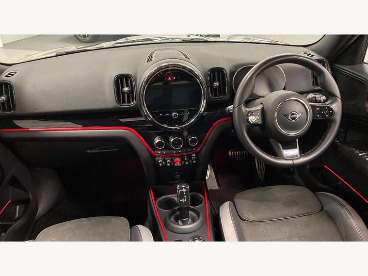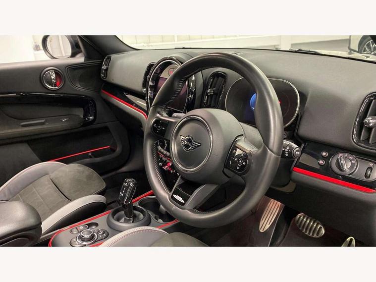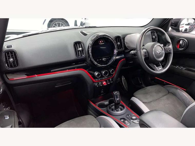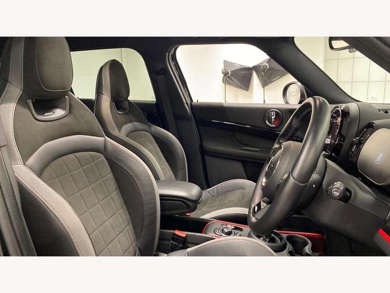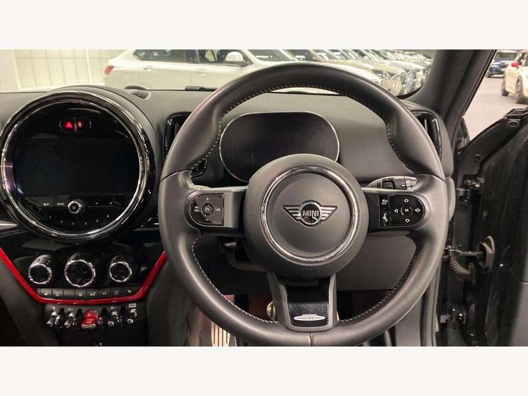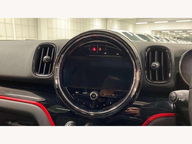 Active Guard incl speed limiting and lane departure functions with auto steering, and front collision warning with brake intervention, Automatic start/stop function with brake energy recuperation, Compatible mobile phone bluetooth with audio streaming, Cruise control with brake assist, Electro-mechanical speed dependant steering assistance, Instrument cluster, MINI Driving Modes - centre toggle switch to control driving setting (sport, mid and green), Mini E-call, On board computer, Double Vanos system, Fully variable valve control, High precision injection, Performance Control, Steptronic transmission with double clutch, FM tuner and DAB digital radio, 3rd brake light, Body colour fuel filler cap, Day time driving lights, Door sill strips, Dynamic brake lights, Electric windows, Heated rear window, Heated windscreen washer jets, John Cooper Works - aerodynamic kit (front and rear apron, spoiler), front and rear sport bumpers and part-painted side sills with door sill finishers, John Cooper Works Logo, LED fog lights, Model logo, Model logo on Tailgate, Rain sensor with auto headlights, Rear fog lights, Rear side wing doors, Rear window wiper, Side scuttle panel with integrated indicator, Split rear doors, Sun/heat protection glass, White indicator lenses, 12V socket in centre console, 3 seat bench in 2nd row, 360L luggage compartment capacity, 4 lashing eyes in luggage compartment, 40:20:40 split folding rear seats, Anthracite headlining with grab handles and clothes hooks, Chrome interior highlights, Colour line - Carbon black, Cupholders, English handbook, Front headrests, Glove compartment, Height and length steering column adjustment, Interior lighting with 12 basic colours selectable via toggle switch in roof, Isofix rear child seat preparation, LED reading lights, vanity mirror lights, front foot well light and spotlight on front seats, Mini John Cooper Works leather gearshift lever and handbrake gaiters, Multifunction steering wheel, Nappa leather steering wheel with MINI Yours logo, Rear headrests, Single front passenger seat, Stainless steel pedals and foot rest, Storage compartments in doors, Sunvisors with vanity mirrors, Excitement pack - Countryman, Navigation pack - Countryman, Piano black exterior pack - Countryman, 2 tone horn, 3 point seatbelts on all seats, 6 Airbags - front, side, head and seat belt tensioners, Anti-lock braking system (ABS), DSC - Dynamic Stability Control, Electronic handbrake, Front and rear disc brakes, Hill start assist, Manual rear child locks, Tyre pressure monitoring system, Alarm system with tilt sensor, monitoring doors, bonnet interior and tailgate, Auto drive away locking, Deadlocking function, Electronic vehicle immobiliser, Locking wheel bolts, Start/stop toggle with keyless go, Piano black JCW interior trim, Tool kit,