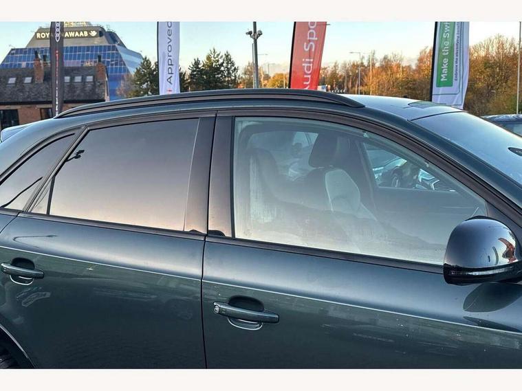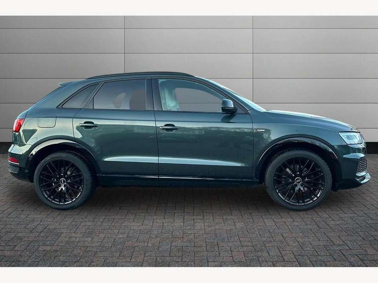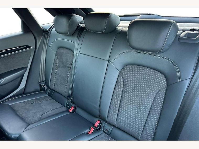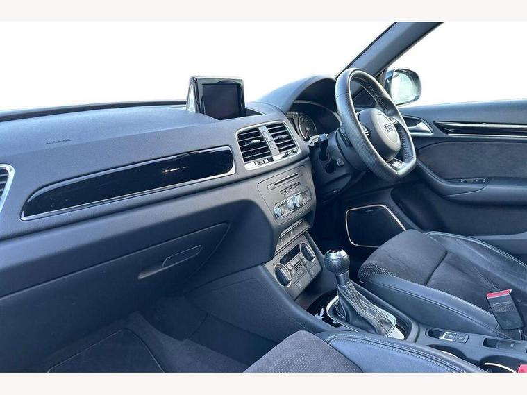 6.5" colour display screen, Audi drive select, Cruise control, Electro-mechanical PAS, Low washer fluid indicator, MMI - Multi Media Interface control system, On board computer, Remote electric boot opening/closing, Service interval indicator, Voice control system, Sports suspension, Audi music interface, BOSE sound system, DAB digital radio module, Acoustic windscreen, Aluminium window surround, Auto dimming rear view mirror, Black exhaust tailpipes, Black high gloss door mirrors, Black roof rails, Coming home function, Door mirror integrated indicators, Front and rear electric windows, Front fog lights, Front lip spoiler, Heated windscreen washer jets, High Gloss Black Contrast Bumpers, High Gloss Black rear spoiler, LED daytime running lights, LED headlights with headlight washers, LED rear lights, Light and rain sensor for auto activation of lights and windscreen wipers, Loading sill protector in stainless steel, Privacy glass, Rear diffuser with platinum insert, Rear wiper, S Line body styling, Sunband for windscreen, 12V socket in rear centre console, 3 spoke flat bottom multi-function perforated leather steering wheel with contrast stitching and aluminium gearshift paddles, Aluminium door sill trims, Aluminium gear knob, Black cloth headlining, Door sill trim strips, Dual zone climate control, Electric front lumbar adjustment, Front and rear headrests, Front and rear velour floor mats, Front centre armrest with storage compartment and angle adjustment, Front sports seats, Height/reach adjust steering wheel, ISOFIX on front passenger and rear outer seats, Jack and tool kit, Retractable luggage cover, Reversible boot floor, Split fold rear seat, Stainless steel pedals, Storage compartment and 12V socket, Under floor storage in luggage area, Audi Exclusive black styling pack - Q3, LED interior light pack - Q3, 3x3 point rear seatbelts, ABS+Electronic Brake force Distribution, Curtain airbags, Driver and passenger airbags, Driver and passenger side airbags, EDL + ASR, Electrically operated child locks on rear doors, Electromechanical parking brake, ESP, First aid kit, Front passenger airbag deactivation, Head airbags, Seatbelt warning light, Tyre pressure monitoring system, Warning triangle, Locking wheel bolts, Remote central locking, Thatcham category 1 alarm + immobiliser, Piano black finish inlay,