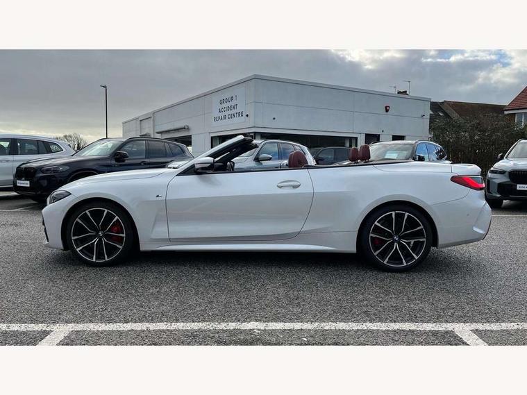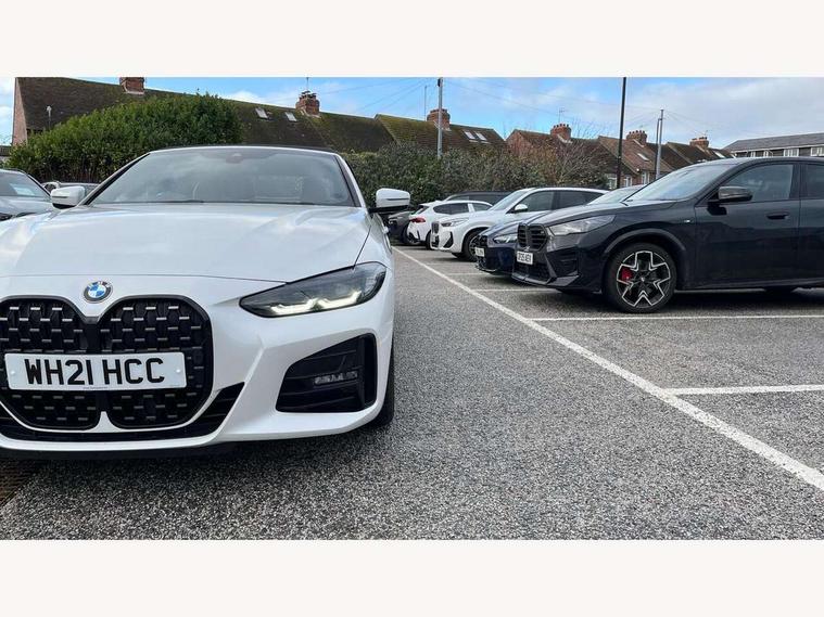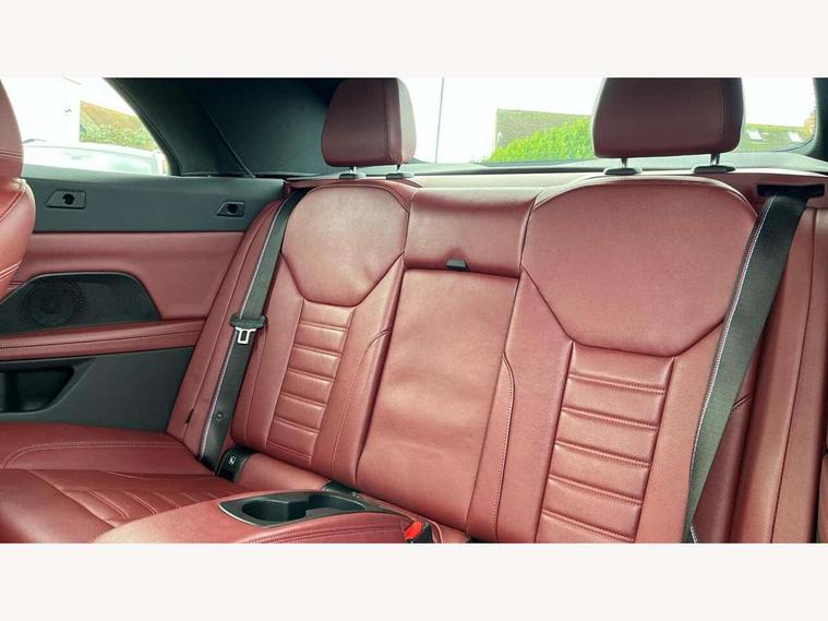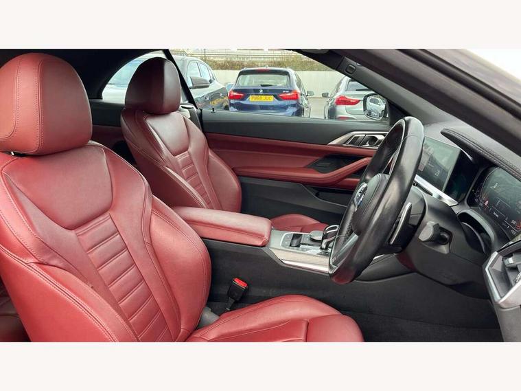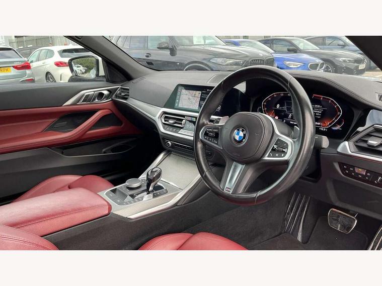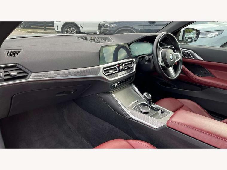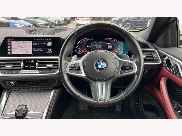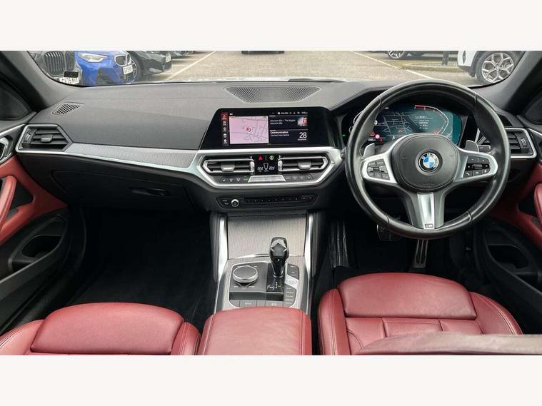 Active guard plus, Attentiveness assist, Auto start-stop, Bluetooth hands free facility with USB audio interface with audio streaming, BMW ConnectedDrive online services, BMW iDrive controller on centre console, BMW Live Cockpit Professional Nav with 12.3" instrument display + 10.25" display, Intelligent Voice Assist, BMW OS 7, HDD, 2USB, 4G LTE connect, BMW service history, BMW Teleservices, Brake pad wear indicator in front and rear, Check Control warning system for monitoring of lights and door/luggage compartment open warning, Condition based service, Cruise control with brake assist, Electric power steering, Electric power steering with Servotronic steering optimised at all speed ranges, Gearshift time display in manual mode, Instrument cluster with speedometer with mph readout, tachometer, fuel gauge and oil temperature gauge, Integrated owners handbook, Oil sensor for level and grade, warning by check control system, On board computer - average speed, fuel consumption, outside temp display with acoustic warning, clock/date, service interval, odometer/trip meter, Optimum shift indicator, Variable sport steering, 8 speed automatic steptronic transmission with gearshift paddles, Balanced 50/50 weight distribution, Double VANOS, Drive performance control - ECO PRO, comfort and sport modes, High precision injection, Low centre of gravity, M sport suspension, Petrol Particulate Filter, Stroke dependent dampers, VALVETRONIC engine management, DAB tuner, Electronic service booklet, Acoustic glazing, Adaptive LED Headlights, Automatic headlight beam throw control with load dependent regulating reaction, dynamic compensation of braking dive and acceleration squat, Automatically dimming electrochromatic rear view mirror, BMW emblem on engine compartment lid and tailgate, BMW kidney grille with mesh grille front side of the nuggets in matt aluminium and frame in chrome high gloss, Body colour fuel filler flap, Body colour roof fin, Brushed aluminium inserts in the front door sill finishers with BMW designation, Dynamic brake lights, Electric windows - front and rear, with open/close fingertip control, anti trap facility and comfort closing function all round, Exhaust tailpipe - split left and right, Exterior mirrors - electrically folding with anti-dazzle, Fading support, Front and rear bumper system, Front apron plastic in body colour, Green tinted heat protection glazing, High gloss shadow line exterior trim, Illuminated bow type door handles in body colour drivers side with door lock, Interior rear view electrochromatic mirror with automatic anti dazzle function, LED front fog lights, Licence plate panel integrated into front bumper and tailgate, Lightweight engineering, M designation on front side panels, left and right, Model designation on right side of tailgate, One piece front bumper cover including towing eye cover in body colour, Preparation for high beam assistant, Rain sensor, Side frame decorative moulding black matt, Two part LED tailights in L-shape with components in smoked glass, brake light, LED turn indicator and rear fog light, Visible VIN plate, Welcome lights in interior and door handle area, Widened track and increased camber values for max transverse dynamics, agility and steering precision, Window recess cover black high gloss, Windscreen wipers with integrated washing jets, 12V power socket in front centre console, 2 front cupholder in centre console with clamping elements and matt black inlay, 2 Rear seat headrests, 3 spoke M sport leather multifunction steering wheel, 3 zone automatic air conditioning, 4 pieces lashing eyelets in luggage compartment, 40:20:40 split folding rear seat and rear centre armrest with two cupholders, Ambient lighting with welcome carpet light, Armrest integrated in front and rear door trim + front centre console armrest, Electric seat adjustment with memory, Four grab handles integrated in roof lining, Front and rear door exit lighting (left / right), Front and rear door pockets, Front and rear footwell lights, Front and rear reading lights, Front headrests, Front seat backrest width adjustment, Front sport seats, Heated driver and front passenger seats, Height adjustable mechanically and infinitely variable steering column, Illuminated armrest storage compartment, Illuminated glove compartment with separate small compartment, Luggage compartment light, Make-up mirror lights, Storage compartment in rear centre console, Sunvisors with vanity mirrors and ticket pocket, Toolkit located in luggage compartment, Velour front floor mats, Vernasca leather upholstery, Connected professional package - 4 Series, M sport exterior styling pack - 4 Series, Park assist pack - 4 Series, 2 x 3-point rear seatbelts, Battery safety cut-off, BMW emergency call, Brake energy regeneration, Braking pre-tensioning, Child proof locking system in rear door, Child seat ISOFIX attachment for the two outer rear seats, Coasting in idle in ECO PRO mode, Cornering brake control (CBC), Crash sensor activating of airbags, Unlocking doors, hazard warning lights, fuel cut off, interior lighting+activation of safety battery terminal clamp, Driver and front passenger side airbags, integrated in the door side seat backrest bolsters for all seat variants, Driver/Front Passenger airbags, Dry braking, Dynamic brake control, Dynamic stability control + (DSC+) - Anti-lock Braking System (ABS) with brake assist and cornering brake control + Automatic Stability Control (ASC), Dynamic Traction Control - DTC, Electric parking brake including automatic hold function and automatic release of the parking brake when driving off, Electronic differential lock control (EDLC), Front and rear ventilated brake disc, Front passenger manual airbag deactivation, Head airbags for all 4 outer seats, Hill start assistant, Seat belt security check for driver and front passenger, Seat belt with belt stopper, pyrotechnic belt tensioners and belt force limiters, Side impact protection, Tyre pressure monit