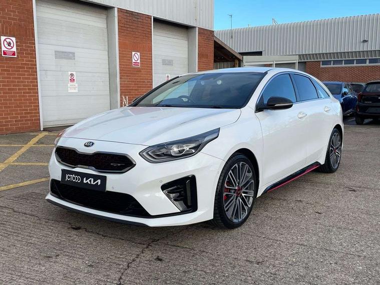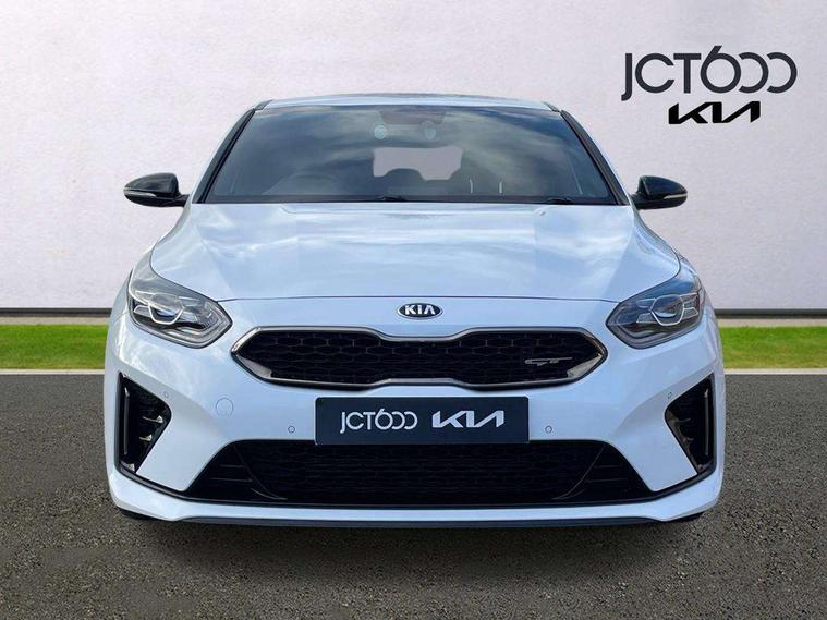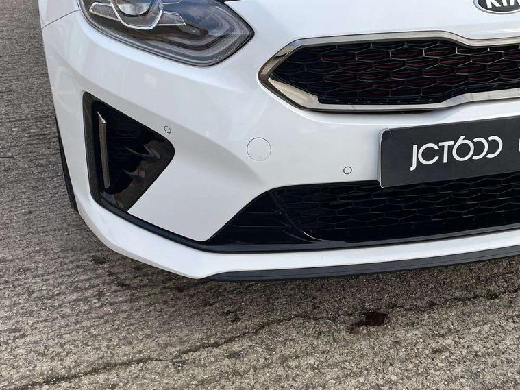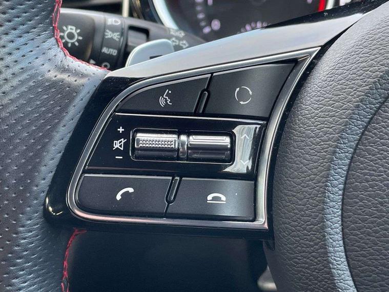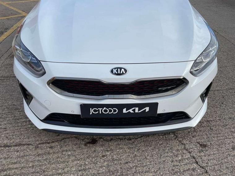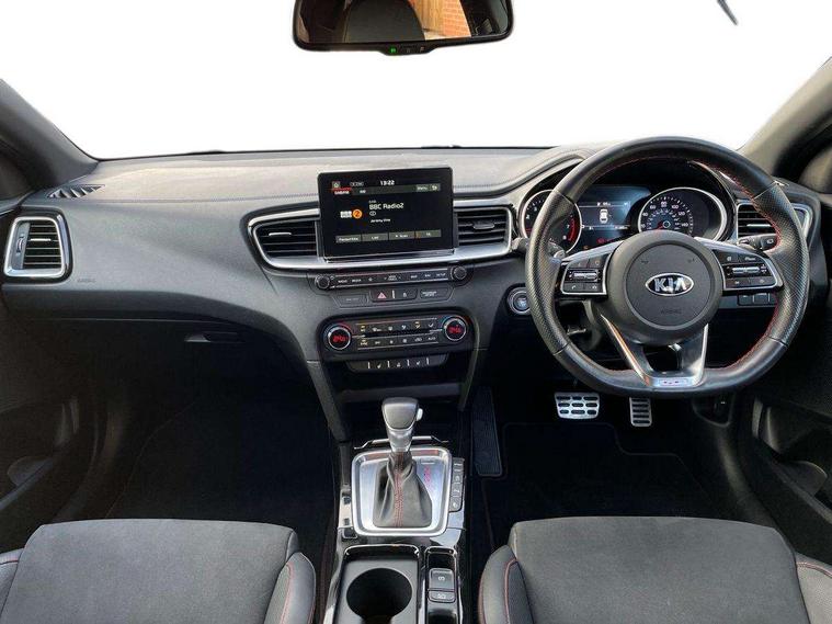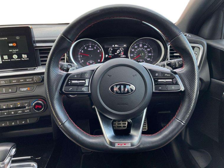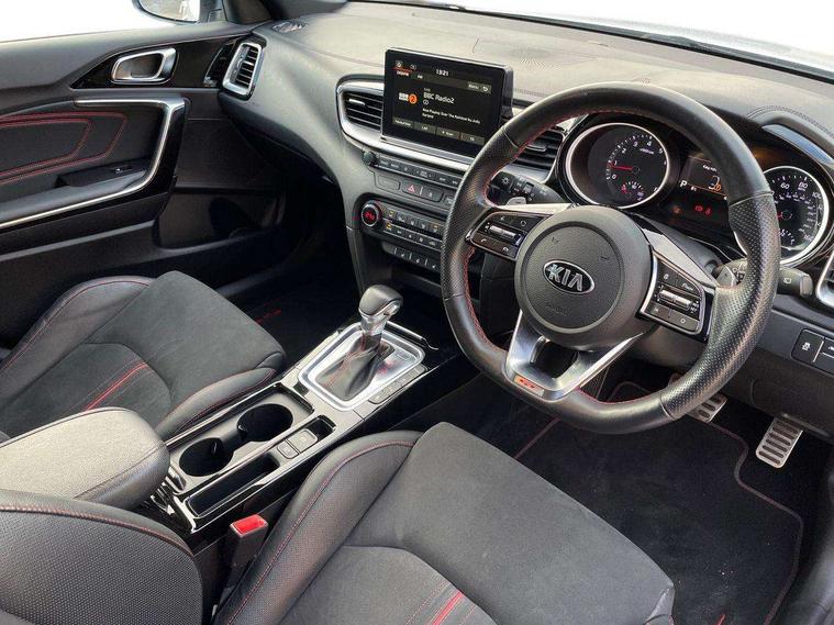 4.2" supervision cluster colour display with GT performance mode, 8" touchscreen satellite navigation with European mapping and traffic messaging channel, Apple car play/Android Auto, Bluetooth with Voice Recognition & Music Streaming, Cruise control + speed limiter, Drive mode selector, Driver attention warning, Emergency stop signalling system, Kia connected services featuring TomTom live, Lane keep assist, Motor driven power steering, Rear parking sensor, Reversing camera with dynamic guide lines, Smart park assist system (SPAS) with parallel/perpendicular/reverse with front/rear parking sensors, Trip computer, Intelligent Stop and Go, 6 speaker audio system, DAB Radio with MP3, Illuminated USB & aux ports, Steering wheel mounted controls, USB & AUX Ports for Connection of a Media Device, USB Fast Charger in Front Centre Console, Air intake with red accent lower lip, All-round Electric Windows with Front Auto Up & Down Function, Auto dimming rear view mirror, Automatic defog system, Automatic headlights, Body colour bumpers, Body colour exterior door handles, Body coloured rear roof spoiler with high gloss black trim, Chrome window surround, Electric adjustable/heated/folding door mirrors with LED Indicators and Kerbside Lights, Exterior front door handle illumination, Front fog lights, Front wiper de-icer, Headlamp levelling, Heated rear window with timer, High beam assistant, High gloss black and chrome with red insert radiator grille, High gloss black door mirrors, High gloss red side sill mouldings, LED Bi-Function headlights, LED daytime running lights, LED High-mounted Brake Light, LED rear fog light, LED rear lights, Privacy glass (rear side windows and rear screen), Projection headlights, Puddle lights, Rain sensing front wipers, Rear bumper with diffuser trim and dual exhaust, Rear wash/wipe, Wide view drivers door mirror, Windscreen Washer Level Warning, 2 x 12V Power sockets (Front centre console), 3 x passenger assist grips, 60/40 split folding rear seat, All-round height adjustable headrests, Black headlining, Centre console storage and sliding armrest, Cupholders in centre console, Cupholders in rear armrest, Dash illumination dimmer switch, Driver & Front Passenger Sunvisors with Vanity Mirror Illumination & Ticket Holder, Driver + front passenger electric lumbar support, Driver's seat height adjuster, Dual Height Luggage Area Floor, Dual zone automatic air conditioning, Faux leather door centre trim with red stitching, Front and rear door storage, Front map light with sunglasses case, Front Passenger Seat Height Adjuster, Front seat and rear pockets, Gear shift indicator, Heated front seats, Heated steering wheel, Illuminated ignition key hole, Interior door lock/unlock function, ISOFIX Child seat top tethers and anchor fixings, Leather D-Cut steering wheel with red stitching, Leather gearshift, Load area cover, Luggage area light, Luggage area parcel shelf, Luggage hooks, Paddle shifter, Part leather/faux suede upholstery, Premium centre console with sliding cupholder cover, Rear Air Ventilation, Rear centre armrest, Rear coat hooks, Satin chrome interior door handles, Stainless steel pedals, Tilt/telescopic adjustable steering wheel, ABS with Electronic Brakeforce Distribution (EBD) and Brake Assist System (BAS), All round 3-point seatbelts, Dual front side airbags, Dual horn, Electric parking brake, Electronic stability control (ESC) and vehicle stability management (VSM), Front passenger airbag deactivation, Height adjustable front seatbelts, Hill start assist control (HAC), Impact sensing auto door unlocking, Rear door child safety locks, Seatbelt reminder warning, Traction control, Twin curtain airbags, Twin front airbags, Tyre pressure monitoring system, Alarm system, Engine Immobiliser & Deadlocks, Engine Start/Stop Button with Smart Entry System, Locking wheel nuts, Speed sensitive auto door locking, Black high gloss front console tray garnish & door trim, Satin Chrome Fascia Trim, 18" Alloy wheels with red centre cap, Tyre mobility system,