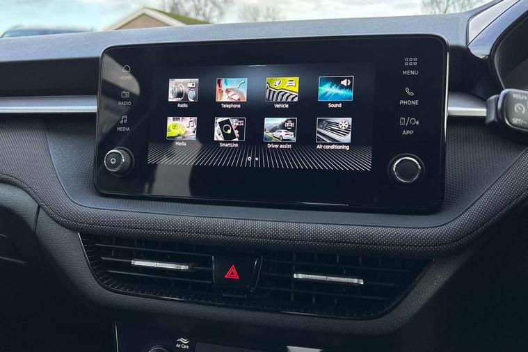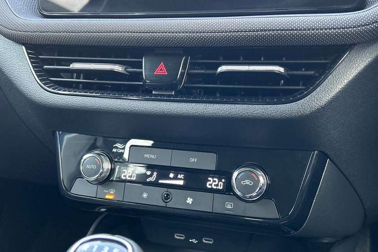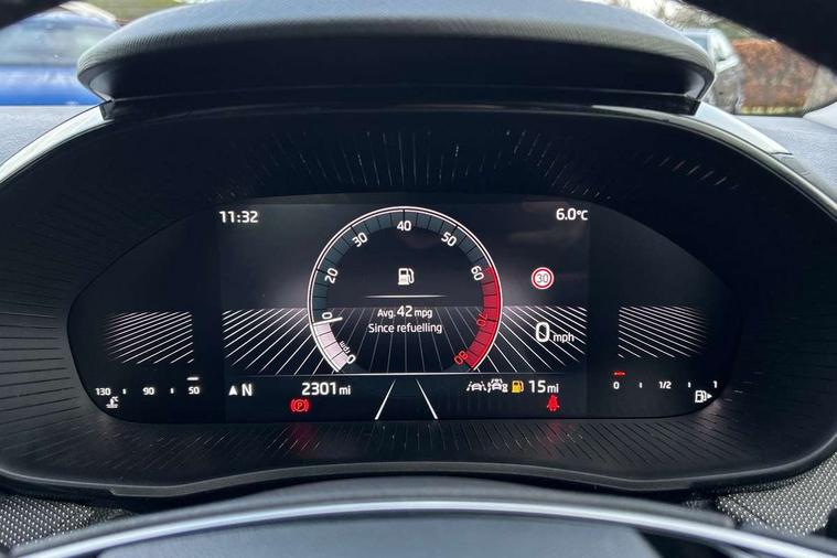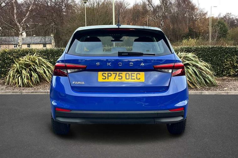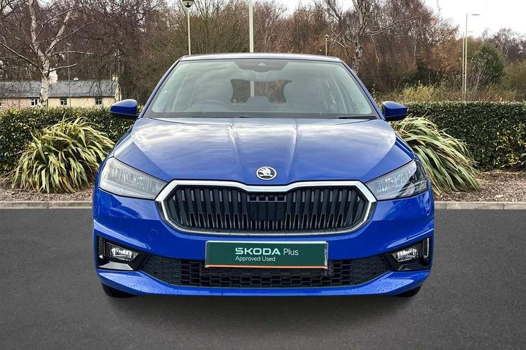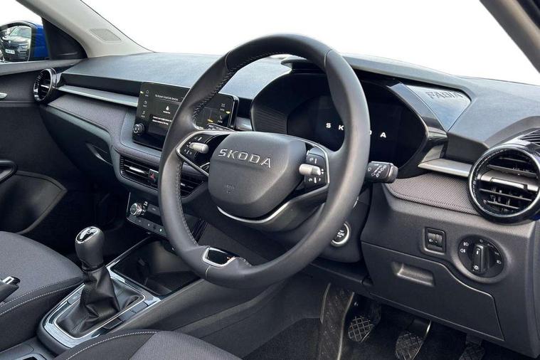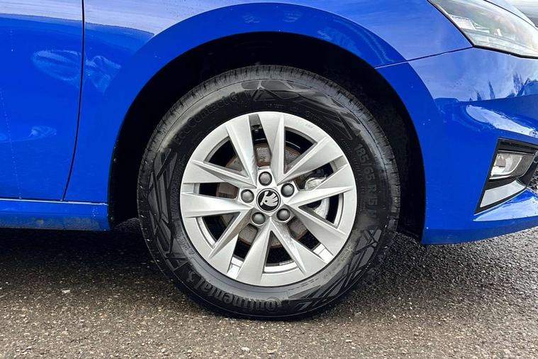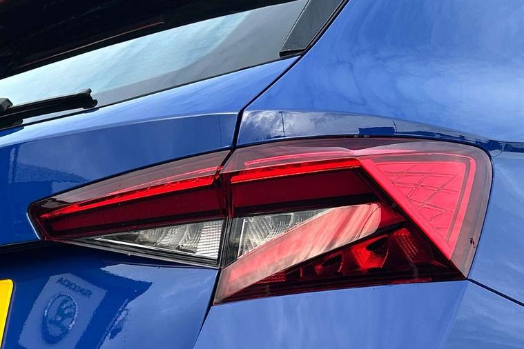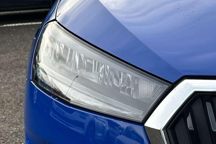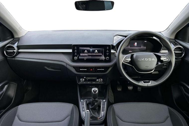 8" Digital instrument display, Advanced driver attention and drowsiness monitor, Bluetooth connection, Driver alert system, Electromechanical power steering, Exterior temperature gauge, Rear parking sensors, Service interval indicator, Traffic sign recognition, Wireless SmartLink for Apple CarPlay and Android Auto, 6 Speakers (4 in front and 2 in rear), 8.25" Skoda infotainment touchscreen display, Auxiliary socket for external MP3 player, DAB digital radio reception, Auto dimming rear view mirror, Body colour door mirrors, Body coloured bumpers, Door mirror integrated indicators, Front and rear electric windows, Front window wiper intermittent control, Headlight range control - Automatic, LED 3rd brake light, LED daytime running lights with coming and leaving home feature, LED rear lights, Rear LED fog light, Rear side wing doors, Rear window wiper with washing nozzles, Roof mounted spoiler, SKODA tailgate lettering in chrome, Unique dark chrome design logo on alloy wheels, 2 reading lights in front and 2 reading lights in rear, 3 rear headrests, Backrest split and folding, Central console with removable cup holder and storage box, Chrome handbrake release button, Dual zone air conditioning with climatronic electronic control, Fabric upholstery, Front centre armrest, Gearshift knob/handle in leather, Grain satin black interior door handles, Hand brake lever handle in leather, Height adjustable front headrests, Height adjustable front seats, Height adjustable steering wheel, ISOFIX and TopTether anchorage points to the outer rear seats, ISOFIX and TopTether on the front passenger seat, Luggage compartment lighting, Manually adjustable lumbar support in front seats, Pollen filter, Rear seat bench unsplit, Single front passenger seat, Skoda lettering on steering wheel, Storm grey headlining, Sun visors with mirror and airbag label on passenger side, Textile floor mats, Ambient lighting pack - Fabia Hatchback, 3-point height adjustable front seats belts with pretensioner and force limiter, Automatic warning lights in case of crash, Driver and passengers airbag with switch off function, e-Call+, ESC including ABS, MSR, ASR, EDS, HBA and XDS, Front and rear seat belt warning, FRONT ASSIST (AEB City and AEB Inter Urban), Front side airbags, Head airbags, One tone horn, Pedestrian protection, Three rear 3-points safety seat belts with pretensioner and force limiter including stop function for outer rear seat belts, Tyre pressure monitoring system, Anti-theft alarm system including immobiliser, interior monitoring, backup horn, and towing protection, Central locking with radio remote control, interior controls, SAFE function and 2 foldable keys, KESSY - Keyless engine start/stop, Black painted air vents, Grain satin black central console cover, Metallic grey upper decorative trim, Satin black door and side trim panel in front, Textile Kota grey lower decorative inserts, Anti-theft wheel bolts protection, Super-low rolling resistance tyres,
