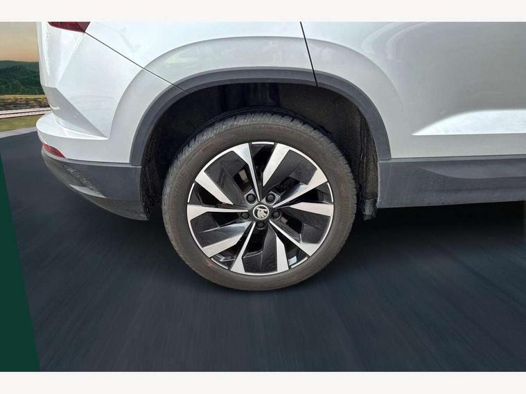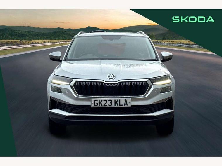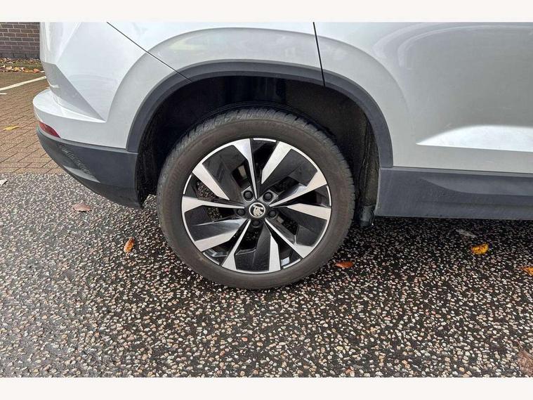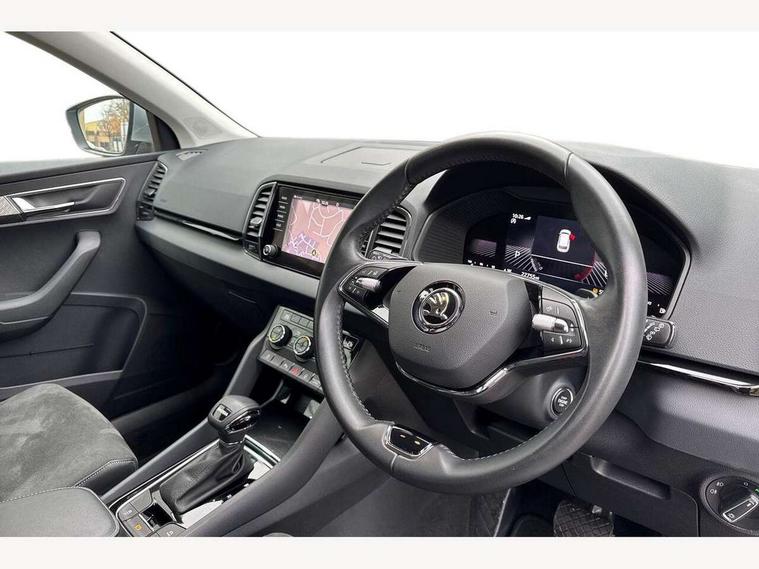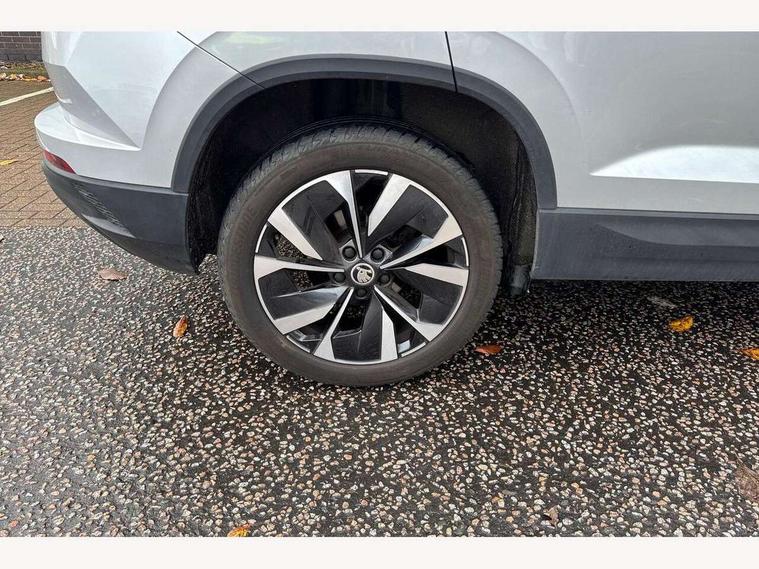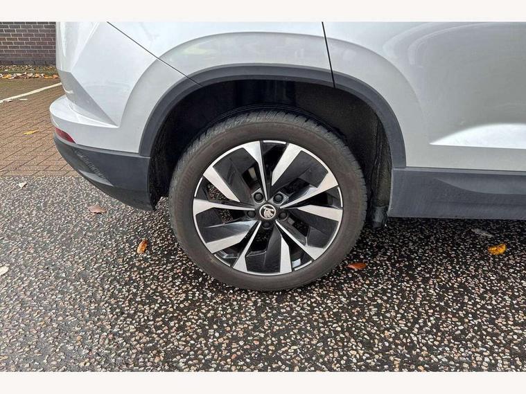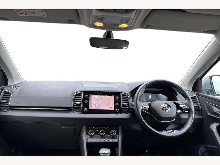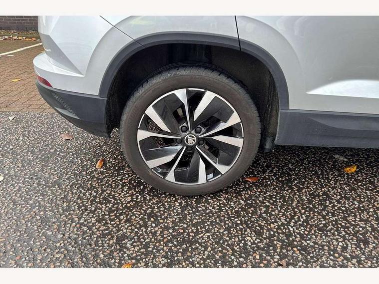 8" Digital display, Care connect, Driver fatigue sensor, Emergency services call system, Outside temperature gauge, Service interval indicator, SmartLink wireless for Apple and wired for Android, Start/stop system with regenerative braking, USB C Port x 2 in front centre console, 8 Speakers, DAB radio with Bluetooth, USB connection, Acoustic glass, Aero front windscreen wipers with intermittent function, Auto dimming rear view mirror with light and rain sensors, Black electric window control buttons, Body colour door mirrors and handles, Dynamic headlight range control with cornering light function, Electric front and rear windows with child proof lock, Heated rear windscreen, LED daytime running lights, LED rear lights with high functionality welcome effect and dynamic indicators, Light assistant (coming/leaving home/tunnel light), Plastic scuff plates, Privacy glass, Rear side wing doors, Rear spoiler, Rear window wiper with washer system and intermittent control, Safety reflectors on front doors, 1.5 litre bottle holders in driver and front passenger door panels, 12V socket in boot, 12v socket in front centre armrest with storage compartment and rear air vents, 2 Folding hooks and nets in boot, 2 spoke leather heated multifunction steering wheel with DSG paddles, 2 x Tablet holder, 3 rear height adjustable headrests, 3 seat bench in 2nd row, 4 foldable roof handles with rear coat hooks, Black floor carpet, Chrome inner door handles, Decorative door sills with KAROQ badging, Double sided boot floor, Foldable hooks in the boot, Front head restraints, Height adjustable front three point seats belts with tensioners, Height/reach adjust steering wheel, Ice scraper, Illuminated glovebox, Illuminated luggage compartment, Isofix child seat preparation for front passenger seat, Isofix child seat preparation outer rear, Manual lumbar support for front seats, Pen holder, Pollen filter, Rear boot cover, Rear reading lights, Rubbish bin door, Safety vest holder, Single front passenger seat, Storage box in upper central dashboard closed, Sunvisors with illuminated vanity mirrors, Textile floor mats, Ticket holder, VarioFlex seats with standard rear seat release, Chrome roof rails + chrome pack - Karoq, Parking pack - Karoq, Automatic door unlocking in case of crash, Automatic fuel cut off in case of crash, Child locks on rear doors, Driver airbag, Electronic parking brake with auto hold function, Emergency rear braking signal, ESC including ABS, MSR, ASR, EDS, HBA, DSR, RBS, MKB and traction control, Front side airbags, Hill hold control, Knee airbags, Passenger airbag with switch-off function, Pedestrian monitor, Seatbelt reminder signalisation and pretensioner for all seats, Three point seatbelts rear, Two tone horn, Tyre pressure display, Tyre pressure monitor, Alarm with interior monitoring, back up horn and tilt sensor with safe function, Electronic engine immobiliser, Keyless entry and start/stop, Remote central locking with 2 remote folding keys, Chrome framed air vents, 18" Procyon silver alloy wheels with anthracite aero inserts, Anti-theft wheel bolts protection, Storage on wheel cover, Tool kit,