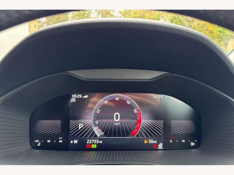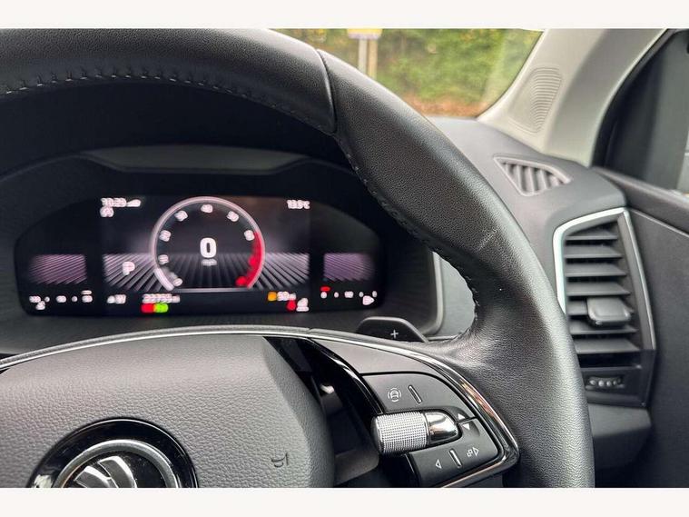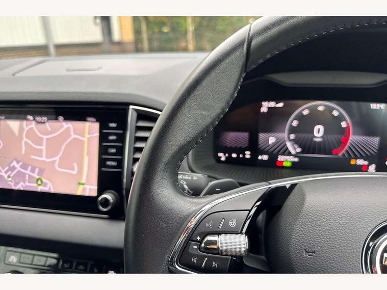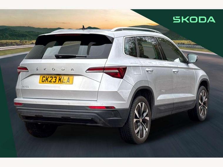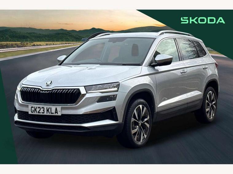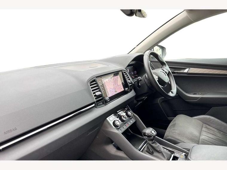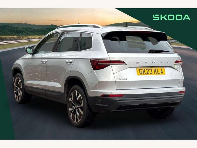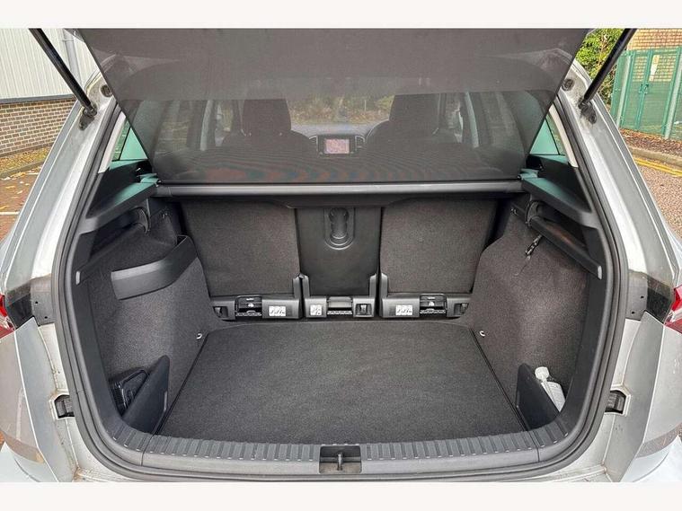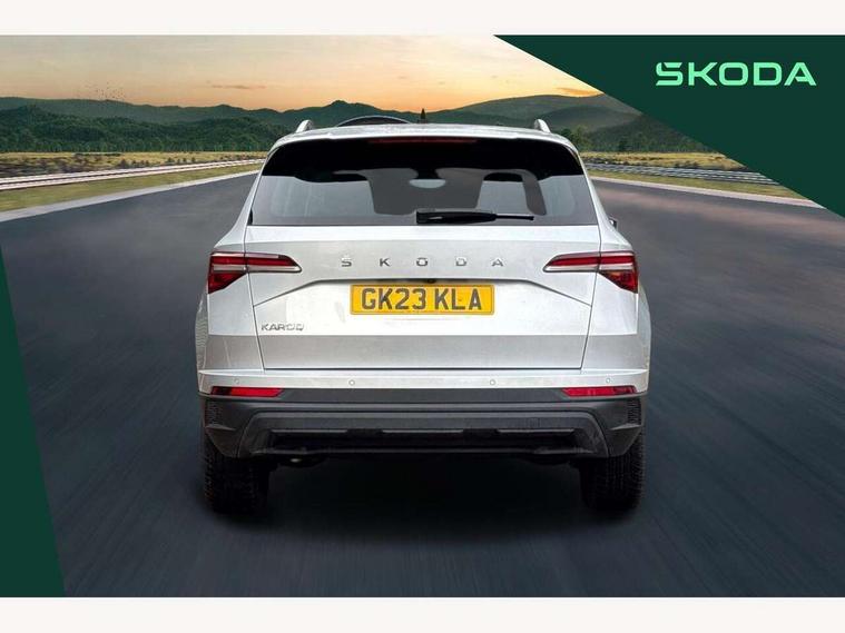8" Digital display, Care connect, Driver fatigue sensor, Emergency services call system, Outside temperature gauge, Service interval indicator, SmartLink wireless for Apple and wired for Android, Start/stop system with regenerative braking, USB C Port x 2 in front centre console, 8 Speakers, DAB radio with Bluetooth, USB connection, Acoustic glass, Aero front windscreen wipers with intermittent function, Auto dimming rear view mirror with light and rain sensors, Black electric window control buttons, Body colour door mirrors and handles, Dynamic headlight range control with cornering light function, Electric front and rear windows with child proof lock, Heated rear windscreen, LED daytime running lights, LED rear lights with high functionality welcome effect and dynamic indicators, Light assistant (coming/leaving home/tunnel light), Plastic scuff plates, Privacy glass, Rear side wing doors, Rear spoiler, Rear window wiper with washer system and intermittent control, Safety reflectors on front doors, 1.5 litre bottle holders in driver and front passenger door panels, 12V socket in boot, 12v socket in front centre armrest with storage compartment and rear air vents, 2 Folding hooks and nets in boot, 2 spoke leather heated multifunction steering wheel with DSG paddles, 2 x Tablet holder, 3 rear height adjustable headrests, 3 seat bench in 2nd row, 4 foldable roof handles with rear coat hooks, Black floor carpet, Chrome inner door handles, Decorative door sills with KAROQ badging, Double sided boot floor, Foldable hooks in the boot, Front head restraints, Height adjustable front three point seats belts with tensioners, Height/reach adjust steering wheel, Ice scraper, Illuminated glovebox, Illuminated luggage compartment, Isofix child seat preparation for front passenger seat, Isofix child seat preparation outer rear, Manual lumbar support for front seats, Pen holder, Pollen filter, Rear boot cover, Rear reading lights, Rubbish bin door, Safety vest holder, Single front passenger seat, Storage box in upper central dashboard closed, Sunvisors with illuminated vanity mirrors, Textile floor mats, Ticket holder, VarioFlex seats with standard rear seat release, Chrome roof rails + chrome pack - Karoq, Parking pack - Karoq, Automatic door unlocking in case of crash, Automatic fuel cut off in case of crash, Child locks on rear doors, Driver airbag, Electronic parking brake with auto hold function, Emergency rear braking signal, ESC including ABS, MSR, ASR, EDS, HBA, DSR, RBS, MKB and traction control, Front side airbags, Hill hold control, Knee airbags, Passenger airbag with switch-off function, Pedestrian monitor, Seatbelt reminder signalisation and pretensioner for all seats, Three point seatbelts rear, Two tone horn, Tyre pressure display, Tyre pressure monitor, Alarm with interior monitoring, back up horn and tilt sensor with safe function, Electronic engine immobiliser, Keyless entry and start/stop, Remote central locking with 2 remote folding keys, Chrome framed air vents, 18" Procyon silver alloy wheels with anthracite aero inserts, Anti-theft wheel bolts protection, Storage on wheel cover, Tool kit,
