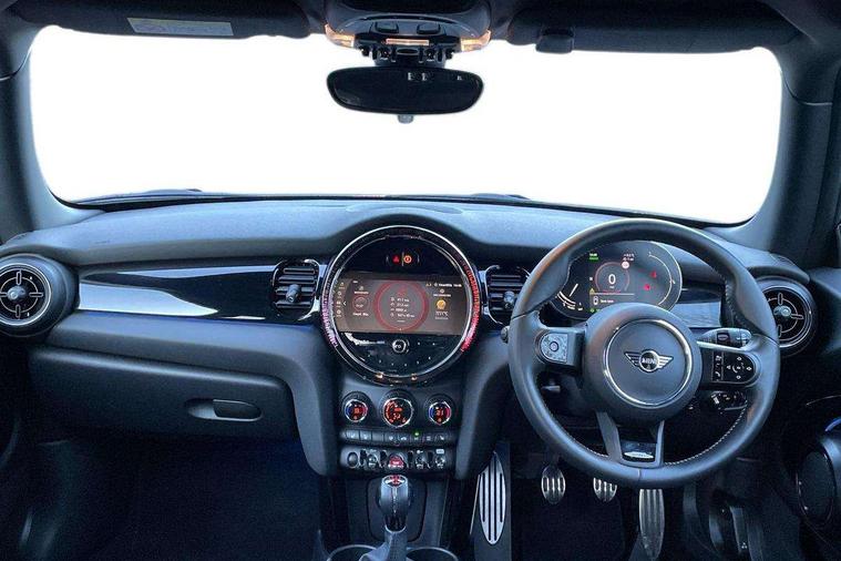 Apple CarPlay, Automatic start/stop function with brake energy recuperation, Compatible mobile phone bluetooth with audio streaming, Cruise control with brake assist, Electro-mechanical speed dependant steering assistance, Flexible car sharing preparation, Instrument cluster, MINI Driving Modes - centre toggle switch to control driving setting (sport, mid and green), Mini E-call, MINI TeleServices, On board computer, Rear park distance control, Service interval indicator, 6 Speed manual transmission including gear change indicator display, Double Vanos system, Fully variable valve control, High precision injection, Intelligent adaptive suspension, Performance Control, 8.8" touchscreen with LED ring, FM tuner and DAB digital radio, 3rd brake light, Automatic headlight activation switch, Body colour fuel filler cap, Chrome border high gloss black slats radiator grille, Dynamic brake lights, Electric front windows, Exhaust tailpipe on left with chrome finisher, Heated rear window, Heated windscreen washer jets, JCW Aerodynamic kit - Front and rear bumpers with sporty JCW styling and part-painted side sills with MINI John Cooper Works door sill finishers, John Cooper Works rear spoiler, LED headlight with closed ring and daytime driving lights, Metal door sill strips with MINI imprint, Model logo Cooper on right of tailgate, Rain sensor window wipers, Rear fog lights, Rear LED lights with union jack design, Rear window wiper, Side scuttle panel with integrated indicator, Sun/heat protection glass, White indicator lenses, 12V Accessory socket in centre console, 2 seat bench in 2nd row, 4 lashing eyes in luggage compartment, 60/40 split folding rear seat, Anthracite headliner including grab handles and clothes hooks, Carbon black colour line - Knee roll and door armrest, Chrome interior highlights, Cupholders, Front and rear isofix with front passenger airbag deactivation, Front floor mats in velour, Glove compartment, Height and length steering column adjustment, Interior lighting with 12 different colours across the dashboard, underneath door bezel with illuminated laser-engraved design on central display, JCW Sport seats with integrated headrests, adjustable thigh support and John Cooper Works logo, Leatherette gearshift lever and handbrake gaiters, LED reading lights, vanity mirror lights, front foot well light and spotlight on front seats, Manual air conditioning, Mechanical seat adjustment - forward/back & backrest for front seats and driver seat height adjust, Multifunction steering wheel, Passenger seat height adjuster, Single front passenger seat, Storage compartments in doors, Sunvisors with vanity mirrors, Walknappa leather steering wheel with grey seam and John Cooper Works badge on Piano Black lower steering wheel spoke, Piano black exterior pack - Mini Hatchback Cooper, 3 point seatbelts on all four seats, 6 Airbags - front, side, head and seat belt tensioners, Anti-lock braking system (ABS), DSC - Dynamic Stability Control, Front and rear disc brakes, Single tone fanfare horn, Tyre pressure monitoring system, Alarm system with tilt sensor, monitoring doors, bonnet interior and tailgate, Electronic vehicle immobiliser, Start/stop toggle with keyless go, Piano black interior trim, Tool kit,