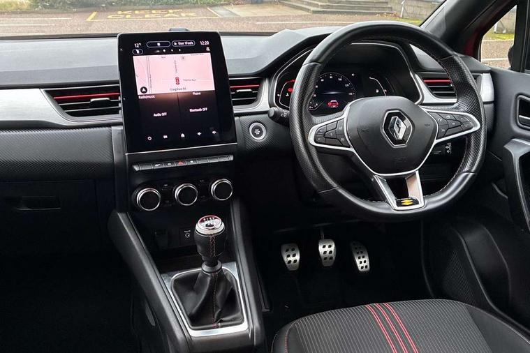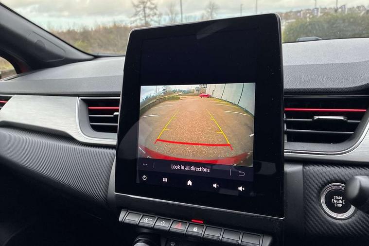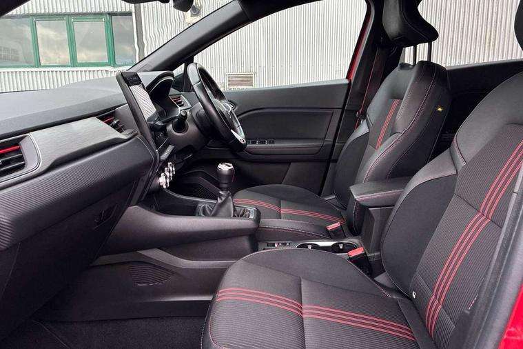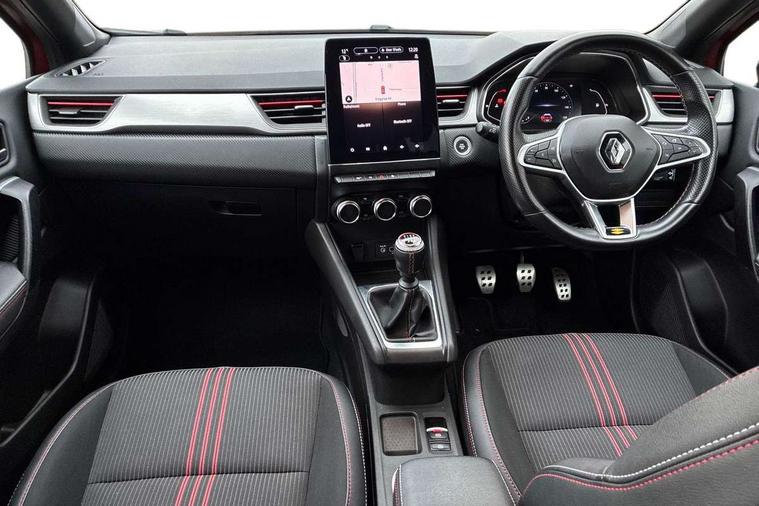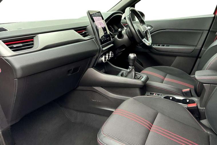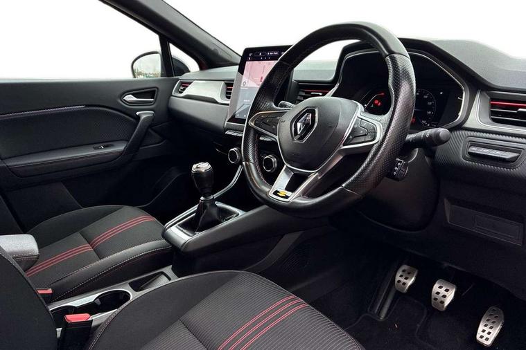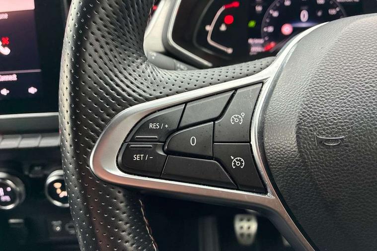 7" TFT Driver information display, Cruise control + speed limiter, EasyLink 9.3" portrait touchscreen with navigation, google search and traffic information, Eco mode, Front and rear parking sensors with rear view camera, Gear change indicator, Lane departure warning system, Lane keep assist, Multisense with 3 driving modes + 8 ambient lighting colours, Renault automatic emergency assist, Smartphone integration compatible with Apple CarPlay and Android Auto, Traffic sign recognition with over speed prevention, Trip computer, Variable assistance power steering, DAB Radio with Bluetooth and USB, Aluminium Renault sport door sills, Auto dimming rear view mirror, Automatic front wipers with rain sensors, Automatic headlights, Automatic high/low beam, Black side door protection with chrome effect, Body colour door handles, Body coloured bumpers, Body coloured door mirrors, C Shaped LED front and rear lighting signatures with 3D effect on the rear lights, Double chromed exhaust tailpipes element, Drivers one touch window with anti-pinch feature, Extra tinted glass in rear windows and tailgate, Frameless rear view mirror, Front and rear electric windows, Front bumper with F1 blade and honeycomb front grille, Front grille with chrome upper trim, Full LED headlights, Grey front and rear skid plate, LED daytime running lights, LED front fog lights, LED high level brake lights, LED rear fog light, Longitudinal roof bars, Rear side wing doors, Rear wiper, RS Line badges on front wing and hatch door, Shark fin antenna, 12V Accessory socket, 3 rear headrests, 60/40 split and fixed base rear seat bench, Aluminium pedals, Automatic climate control with one touch demist function and air quality regulator, Centre console storage tray, Dark roof lining, Front head restraints, Glovebox, Heating system with pollen filter, Height adjustable driver's seat, Height adjustable passenger seat, Height/reach adjust steering wheel, ISOFIX child seat fixing points on rear outermost seats, LED front roof lights, Middle console with armrest and storage, Modular boot floor, Perforated leather steering wheel with red stitching and RS Line badge, Rear air vents, Red insert on air vent, RS Line sport synthetic leather/cloth upholstery, Single front passenger seat, Sliding rear bench, 3 rear seatbelts, ABS+EBA, AEBS, Distance warning alert, Driver and front passenger, side, head and curtain airbags, Driver height adjustable seat belt, Electric parking brake with auto hold function, Electronic stability control, Front and rear no seatbelt warning sound, Front dash warning indicator in case of heavy braking, Front driver and passenger side airbag deactivation, Hill start assist, Rear door and window child locking function for rear door, Tyre pressure warning light, Anti drill door locks and locking fuel cap, Central door locking, Deadlocking system, Hands free keycard with push button and start/stop function, RAID (Renault Anti-Intruder Device) automatic door locking, Carbon style soft touch dashboard, 18" Le castellete diamond cut alloy wheels,