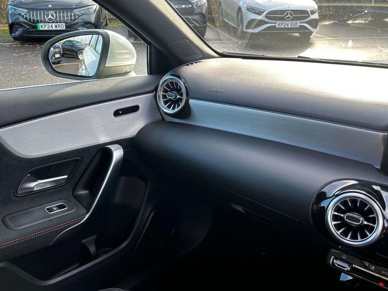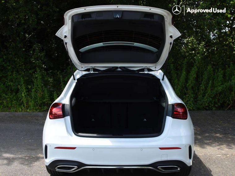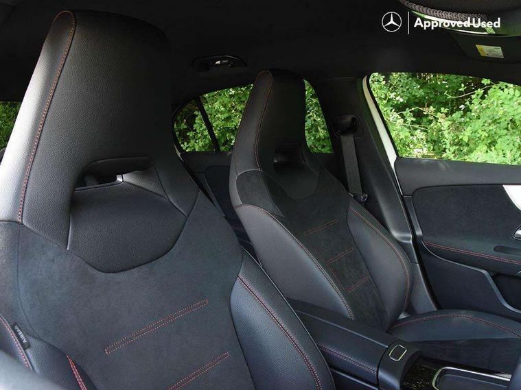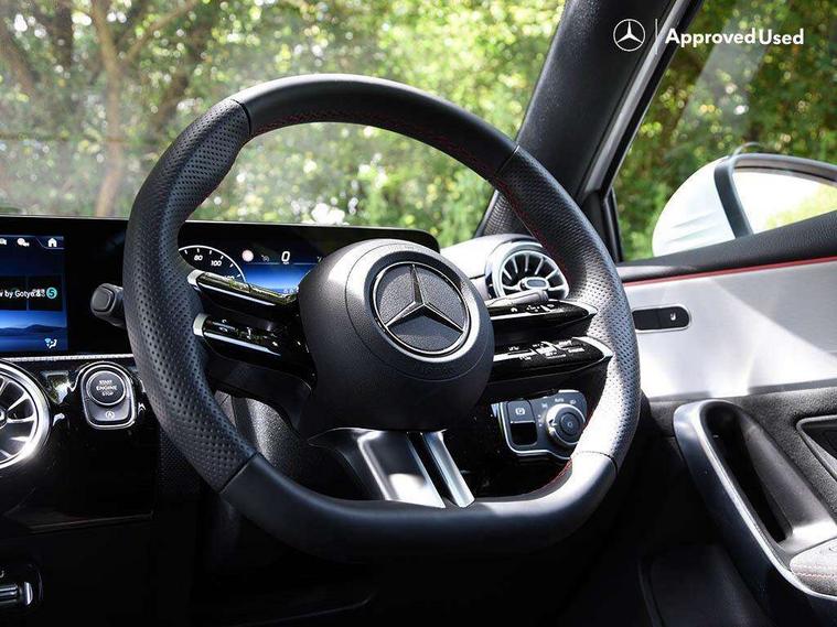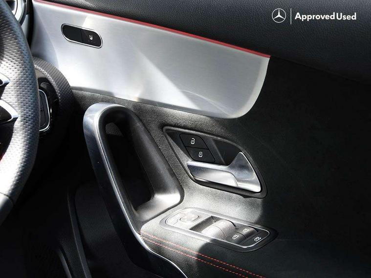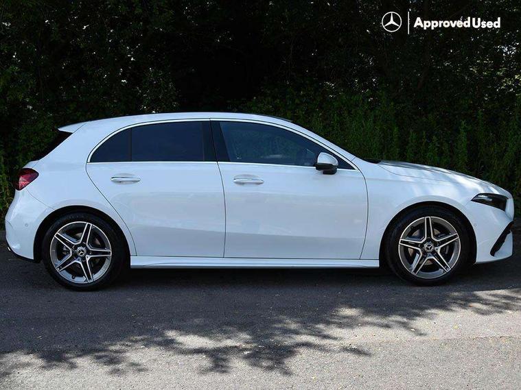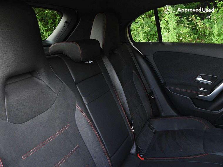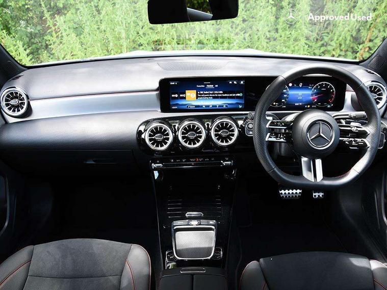10.25 inch touchscreen central media display, 10.25" Digital instrument cluster display screen, Attention assist, Brake pad wear indicator warning light, Car wash mode, Cruise control + speed limiter, Direct steering, Direction indicators with lane change function, Dual bluetooth interfaces, DYNAMIC SELECT with a choice of driving modes (ECO, Comfort, Sport and Individual), Easy pack tailgate hands-free access, ECO start/stop function, Engine start/stop button, Fluid level warning indicator for fuel, oil, coolant and washer fluid, Fluorescent jacket for driver, Hard-disk navigation, Hey Mercedes Voice activation, Lamp failure indicator, Lane keeping system, Mercedes me connect including emergency call system, accident recovery, breakdown and maintenance management, Mercedes me remote services, Outside temperature gauge, Owners manual in English, Pre-installation of private car share, Preinstallation for Mercedes Benz link, Remote boot closing, Service indicator (ASSYST), Smartphone integration with Apple CarPlay and Android auto, Speed limit assist, Speed sensitive power steering, Tailgate, Trip computer in multifunction display with current consumption indicator, Wireless charging, Lowered comfort suspension, DAB Digital radio, MBUX multimedia system, Mercedes Benz sound system (100 W) with 6 speakers, 4 Electric Front and Rear windows, Adaptive brake lights, AMG body styling - AMG front apron with front splitter and AMG rear apron and visible exhaust tailpipe trim elements, Body colour bumpers, Body colour door handles with chrome inserts, Body colour side skirt, Body coloured door mirrors, Chrome beltline strips, Diamond radiator grille with pins in fine star pattern, Electric adjustable and heated door mirrors with integrated LED side indicators, Exhaust system with 2 visible tailpipe trim elements and rear apron, Headlamp assist automatic headlamp activation, Heat insulating dark tinted rear and rear side windows, Heated glass rear windscreen + timer control, LED High level third brake light, LED High Performance headlamps including integral LED daytime running lamps and adaptive highbeam assist, LED tail lamp, Privacy glass, Radio aerial, Rain sensing windscreen wipers with two sensitivity settings, Rear fog lights, Rear side wing doors, Rear windscreen wiper, Window line trim strip in chrome, 3 seat bench in 2nd row, 3 Spoke flat bottom leather multi function steering wheel with perforated leather in grip area, 4 way lumbar support, 40:20:40 split folding rear seats, Air conditioning - One zone THERMATIC automatic climate control with automatically controlled air distribution, AMG floor mats, Automatic child seat recognition sensor, Black air vents with surround in silver chrome, Black roof lining, Brushed stainless steel sports pedals with rubber studs, Front centre armrest with stowage, Front door sills with Mercedes Benz lettering, Front seat backs luggage nets, Galvanished gear shift paddles on steering wheel, Heated front seats, Height/reach adjustable steering column, Interior lighting - 64 colour Ambient lighting, Interior mirror with reading lamps in black and frameless, Rear armrest with 2 cupholders, Seat occupancy sensor for front passenger seat, Single front passenger seat, Sports seats with integrated headrests, Stowage compartment in centre console with retractable cover, Sunvisors with illuminated vanity mirrors, Twin front cupholders, Light and sight pack - A Class, Mirror package - A Class, Parking pack - A Class, Seat comfort pack - A Class, USB pack plus - A Class, 3 rear 3 point seatbelts, ABS with Brake Assist, Active bonnet, Active brake assist includes forward collision warning system with autonomous braking, Adaptive brake assist with hold function and hill start assist, Black seatbelts, Bonnet with power domes, Childproof locks manually operated for rear doors and electrically operated for rear power windows, Crash responsive emergency lighting, Driver and passenger head and side airbags, Drivers knee airbag, Dual stage driver/passenger airbags, Electronic parking brake, ESP curve dynamic assist, ESP with ASR, Front and rear seatbelt reminder, ISOFIX and top tether child seat fixing points in two outer rear seats, Tyre pressure monitoring system, Warning triangle and first aid kit, Window airbags, Alarm system/interior protection/immobiliser, Guard 360 degree vehicle protection, Keyless entry lock/unlock, Keyless Go, Remote central locking and crash sensor with emergency opening function, Light longitudinal grain aluminium trim, 18" AMG 5 twin spoke light alloy wheels, aerodynamically optimised, painted in termolite grey with high sheen finish, Summer tyres, Tirefit sealant kit,