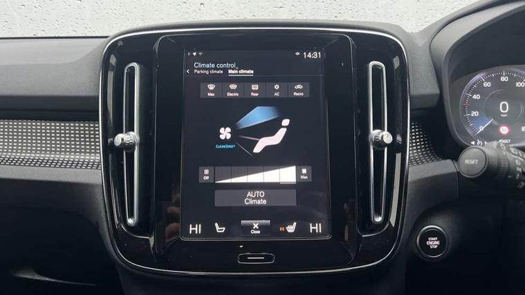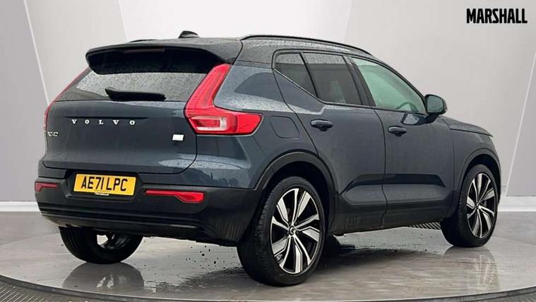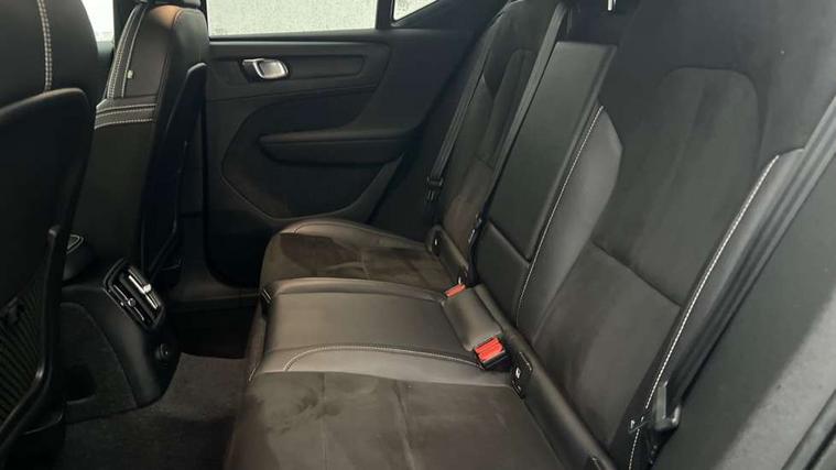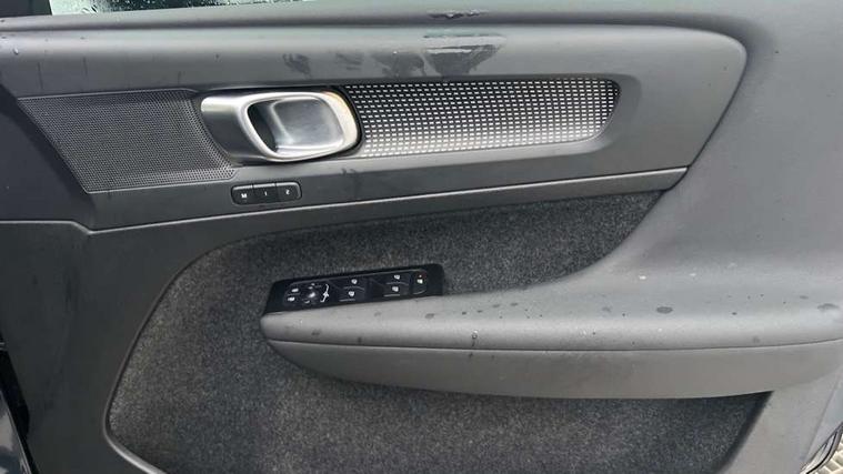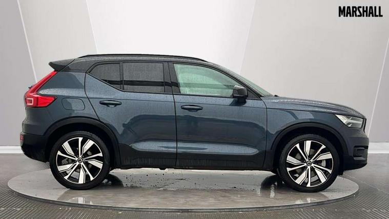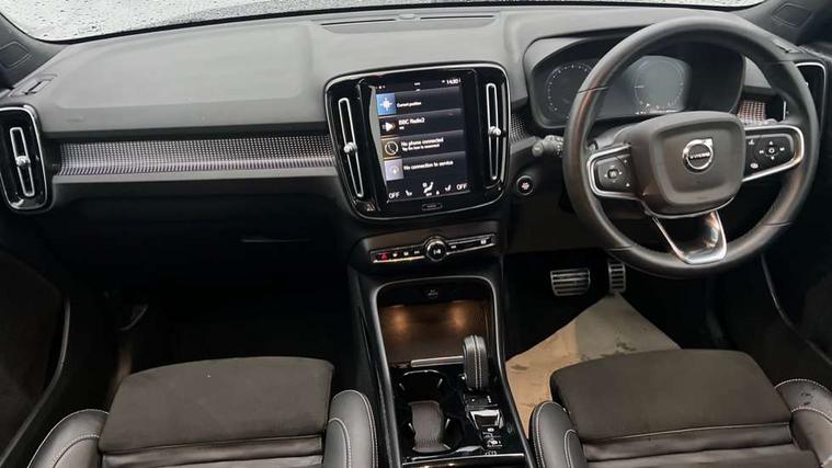 12.3" Active TFT crystal driver's instrument display, 9" centre console portrait touch screen, Adjustable steering wheel force, Bluetooth hands free telephone kit, Drive mode selector, Lane keep assist with driver alert control, Oncoming Lane Mitigation, Power operated tailgate, Sensus navigation with European mapping and traffic information, Speed limiter, Speed sensitive steering, Voice activated control for key functions, Volvo on call, 7m 10amp charge cable with 3 pin plug and 7m 1 phase 16amp type 2/mode 3 charge cable, Electric front axle drive, Recharging port located in nearside front wing, Sports chassis, DAB Digital radio, Low speed exterior sound speaker, Steering wheel mounted remote controls, Adaptive brake lights with high level LED brake lights, Auto dimming interior mirror, Automatic headlamp levelling, Dark tinted windows for rear door side windows and cargo compartment, Electric adjustable/heated/auto folding door mirrors, Front aluminium tread plates, Front and rear electric windows, Heated front windscreen, High gloss black front and rear skid plate, High gloss black lower front bumper, High gloss black mesh front grille with high gloss black surround, High gloss black sensus surround deco, High gloss black window trim, Home safe and approach lighting, Integrated roof rails in high gloss black, LED Headlights + Active high beam incorporating daytime running lights, Rain sensor with automatic windscreen wiper activation, Rear side wing doors, Rear wiper, Roof antenna, Roof spoiler, Visible VIN plate, 12V socket in front tunnel console and luggage compartment, 2 zone electronic climate control and rear air vent, 3 seat bench in 2nd row, 60/40 versatile split folding rear seat, A-pillar parking ticket holder, Bright metal luggage threshold, Centre console cupholders and storage, Charcoal headlining, Front footwell illumination, Front headrests, Front reading light and theatre lighting, Front seat cushion extensions, Glovebox bag hook, Heated front seats, Height/reach adjustable steering column, Height/tilt adjustable driver's seat, High gloss centre tunnel deco, Illuminated glovebox, Illuminated luggage compartment, Illuminated vanity mirrors, Isofix attachments on outer rear seats, Leather gearknob, Load protection net, Multi directional lumbar support, Power driver seat with memory + exterior mirrors memory, Rear armrest / integral cup holders / storage tray, Rear coat hook, Single front passenger seat, Sports floor mats, Sports pedals, Sports tailored steering wheel, Underfloor cargo storage, Vanity mirror with ticket holder, Lighting pack - XC40, 3x3 point rear seatbelts, City safety includes pedestrian, cyclist and large animal detection and front collision warning with full auto brake, Drivers knee airbag, Dual stage driver/passenger airbags, Electronic parking brake with auto hold, First aid kit, Front and outer rear seatbelt reminder and pretensioners, Front seats SIPS airbags, Hill descent control, Hill start assist, Inflatable curtain, Passenger airbag cut-off device, Road sign information display, Run off Road Mitigation, Run off Road Protection, SIPS (Side Impact Protection System), Slippery road and hazard light alert, Stability and Traction Control with Spin control, Engine Drag Control and Corner Traction Control, Tyre pressure monitoring system, Vehicle deceleration control with Anti-lock Brake System, Electronic Brake Distribution and Emergency Brake Assist, Warning triangle, WHIPS whiplash protection system - front, Anti-theft alarm including immobiliser/volume sensor + level sensor, Care key with user defined top speed, Key integrated remote control central locking + fuel flap with deadlocking system and auto open/close power windows, Locking wheel nuts, Private locking for tailgate, Cutting edge aluminium inlay, Lower dashboard, tunnel console and door panel in charcoal,