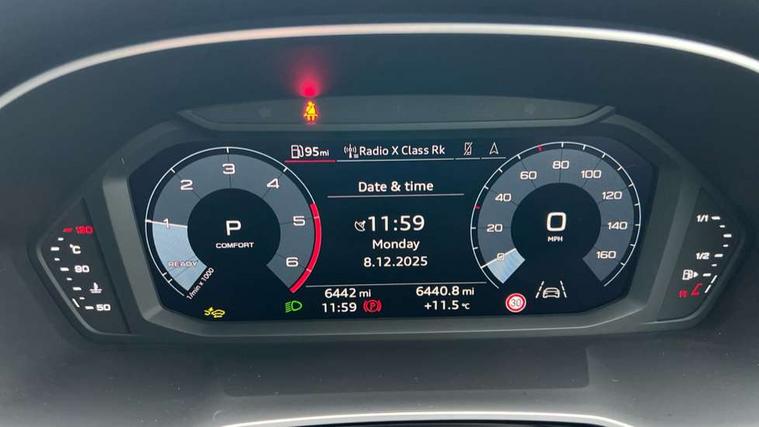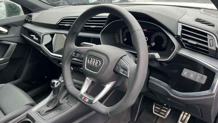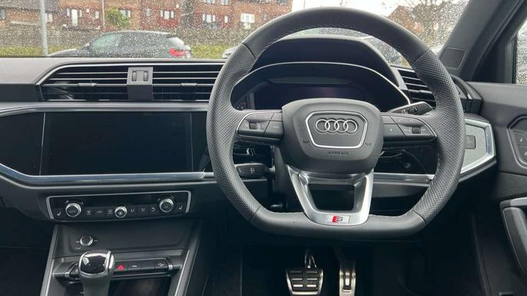 Audi connect safety and service, Audi drive select, Audi lane departure warning, Audi Virtual Cockpit - 10.25" display, Bluetooth interface, Camera based traffic sign recognition, Distraction and Fatigue warning, Legal emergency call, MMI Navigation Plus with high resolution 10.1 inch touchscreen colour display, Power operated tailgate, Progressive steering, Service interval indicator, Smartphone interface includes wireless Apple carplay/Android Auto, Start stop system with recuperation, Voice control system with natural language interaction, Diesel particulate filter, Sports suspension, 2 USB-C ports with charge and data functions, 6 passive loudspeakers, DAB digital radio module, Acoustic windscreen, Audi Beam uses LEDs to project the Audi logo onto the ground as you exit your Q3, Auto dimming door mirrors, Auto dimming frameless rear view mirror, Diffuser grille in grained matt black, Diffuser trim in selenite silver, Electrically folding, adjustable and heated door mirrors with integrated LED side indicators and kerb view function for passenger side, Front and rear electric windows, Front fog lights, Front underbody protection in manhattan grey paint finish, High gloss black finish B and C pillars, LED Dynamic rear indicators, LED headlights with LED daytime running lights, LED rear lights, LED third brake light, Privacy glass dark tinted rear and rear-side windows (from B-pillar backwards), Rain and light sensors, Rear side wing doors, Rear underbody protection in matt black, Rear wiper, S line front and rear bumpers and side skirts in contrasting Manhattan grey paint finish, Variable front intermittent wipers, 12V socket in rear centre console, 3 seat bench in 2nd row, 40:20:40 folding with manual adjustment for 60:40 forwards/backwards position and backrest angle, Adjustable rear seat bench/backrest with centre armrest and cupholder, Black cloth headlining, Dual zone electronic climate control, Electric lumbar support, Front and rear black floor mats with contrast stitching, Front and rear headrests, Front centre armrest, Height and reach adjustable steering wheel, Illuminated door sill trims with S logo, ISOFIX child seat mounting for front passenger with airbag deactivation and outer rear seat including top tether attachment point for outer rear seats, Luggage compartment sill protection in stainless steel, Manual front seats with height adjustment, Perforated leather gearknob, Single front passenger seat, Stainless steel pedals, Twin leather upholstery with front sport seats + S embossing, Black styling pack - Q3, Non smoking pack - Q3, 3x3 point rear seatbelts, 6 airbags - Driver, front passenger, curtain and side windows, Audi pre-sense front with pedestrain and cyclist recognition, Electrically operated child locks on rear doors, Electromechanical parking brake, Electronic stabilisation control including ABS, ASR and EDL, Front seatbelt reminder, Hill descent control, Hill hold assist, Pre sense basic, Seatbelt monitoring, Tyre pressure warning, Warning triangle and first aid kit, Anti theft alarm, Anti theft wheel bolts, Immobiliser, Remote central locking, Aluminium look interior elements, Detail dashboard around MMI touch colour display in glass look, black with surround in aluminium look, Leatherette door armrest, Piano black inlay,