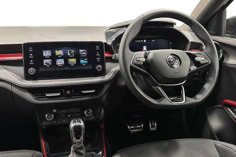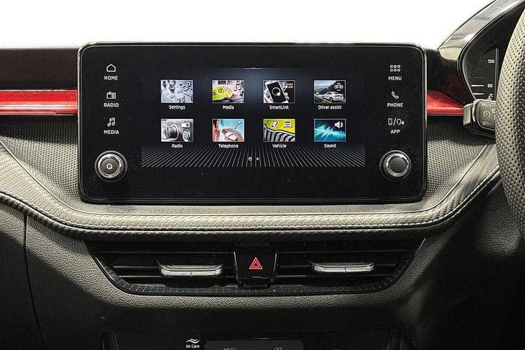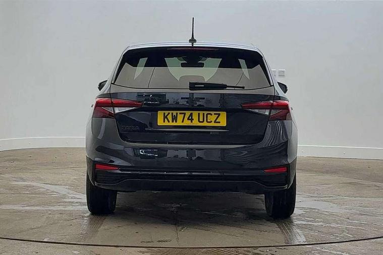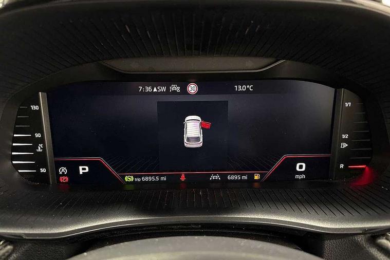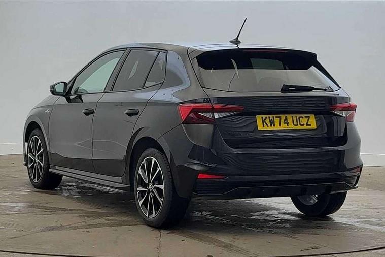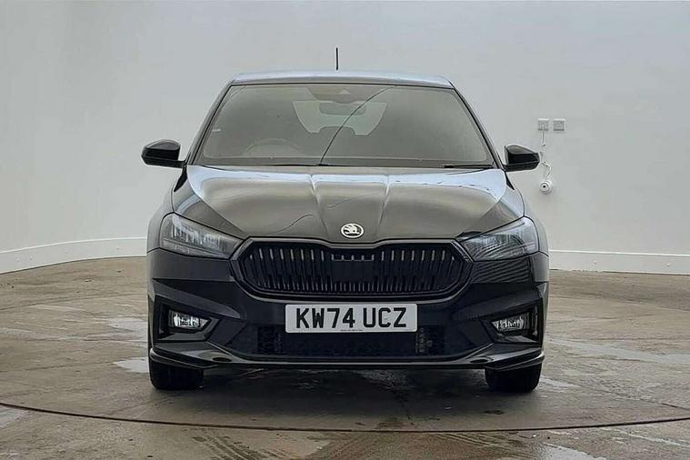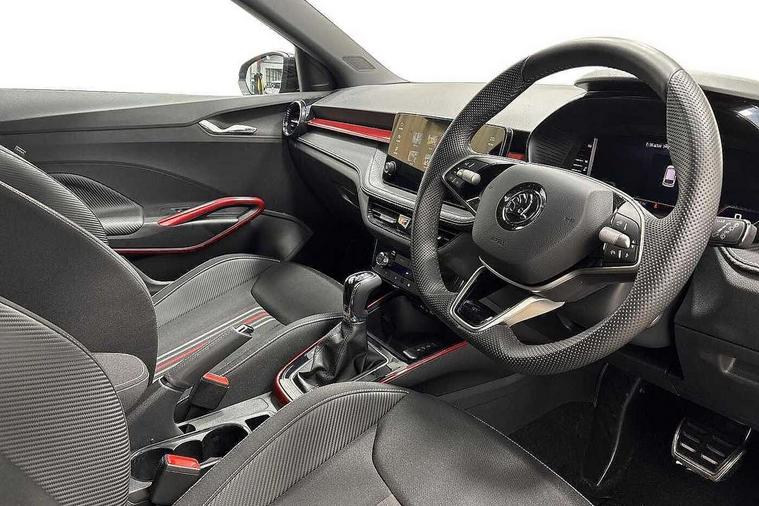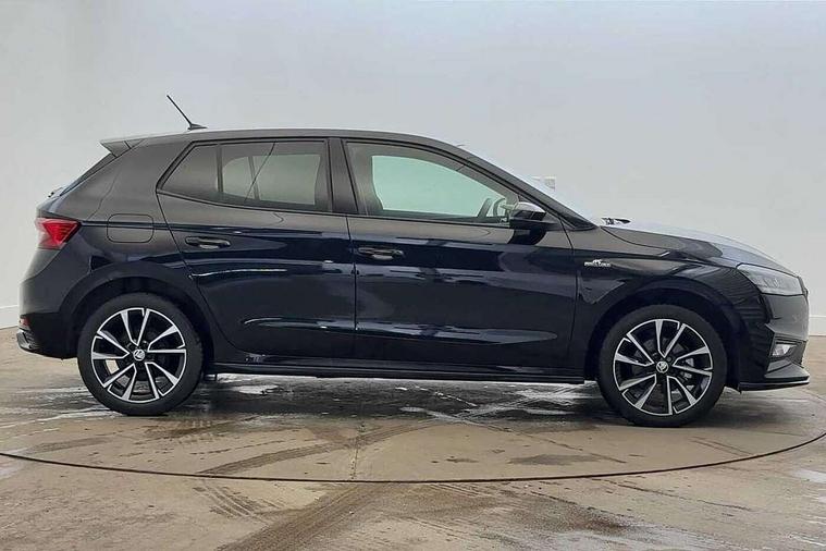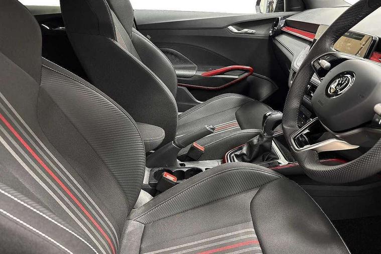 Advanced driver attention and drowsiness monitor, Bluetooth connection, Electromechanical power steering, Exterior temperature gauge, Service interval indicator, Traffic sign recognition, Virtual cockpit with 10.25" colour display, Wireless SmartLink for Apple CarPlay and Android Auto, 6 Speakers (4 in front and 2 in rear), Auxiliary socket for external MP3 player, DAB digital radio reception, Auto dimming rear view mirror, Black radiator grille, Body coloured bumpers, Door mirror integrated indicators, Front and rear electric windows, Front window wiper intermittent control, Headlight range control - Automatic, Ice scraper in fuel cap, LED daytime running lights with coming and leaving home feature, LED rear lights, Monte Carlo badging, Privacy glass, Rear LED fog light, Rear side wing doors, Rear window wiper with washing nozzles, Roof mounted spoiler, SKODA tailgate lettering in black, Sports bumpers, Third brake light, 2 reading lights in front and 2 reading lights in rear, 3 rear headrests, Aluminium pedals, Backrest split and folding, Black headlining, Central console with removable cup holder and storage box, Chrome handbrake release button, Door sills with fabia badging, Dual zone air conditioning with climatronic electronic control, Fabric/artificial leather upholstery, Front centre armrest, Front sports seats, Gearshift knob/handle in leather, Hand brake lever handle in leather, Height adjustable front headrests, Height adjustable front seats, Height adjustable steering wheel, ISOFIX and TopTether anchorage points to the outer rear seats, ISOFIX and TopTether on the front passenger seat, Luggage compartment lighting, Manually adjustable lumbar support in front seats, Metallic painted red central console cover, Metallic red interior door handles, Pollen filter, Rear seat bench unsplit, Single front passenger seat, Sun visors with mirror and airbag label on passenger side, Textile floor mats, Ticket holder, Umbrella in drivers door, 3-point height adjustable front seats belts with pretensioner and force limiter, Automatic warning lights in case of crash, Driver and passengers airbag with switch off function, e-Call+, ESC including ABS, MSR, ASR, EDS, HBA and XDS, Front and rear seat belt warning, FRONT ASSIST (AEB City and AEB Inter Urban), Front side airbags, Head airbags, Hill hold control, One tone horn, Pedestrian protection, Three rear 3-points safety seat belts with pretensioner and force limiter including stop function for outer rear seat belts, Tyre pressure monitoring system, Anti-theft alarm system including immobiliser, interior monitoring, backup horn, and towing protection, Central locking with radio remote control, interior controls, SAFE function and 2 foldable keys, Carbon effect door and side trim panels, Carbon effect lower decorative trim with white stitching, Monte carlo air vents, Red metallic upper decorative trim, Anti-theft wheel bolts protection, Super-low rolling resistance tyres,