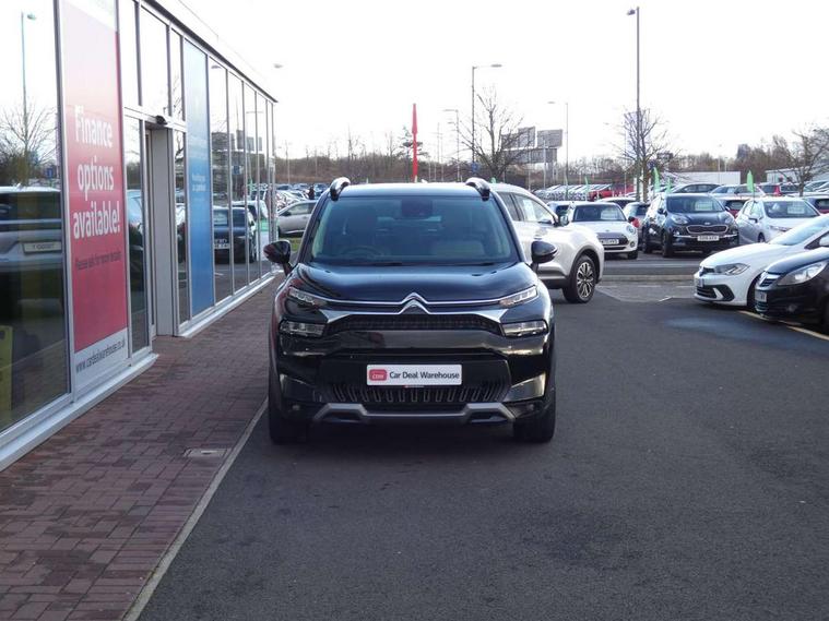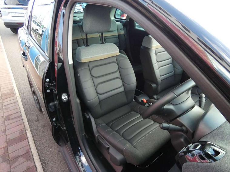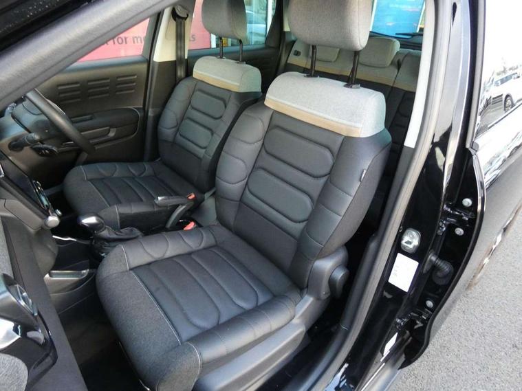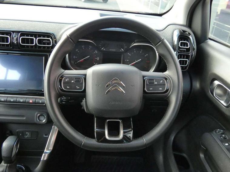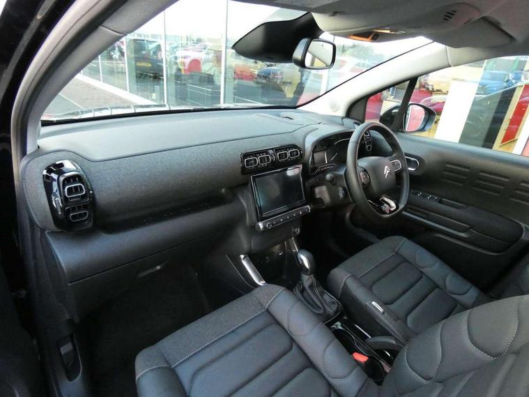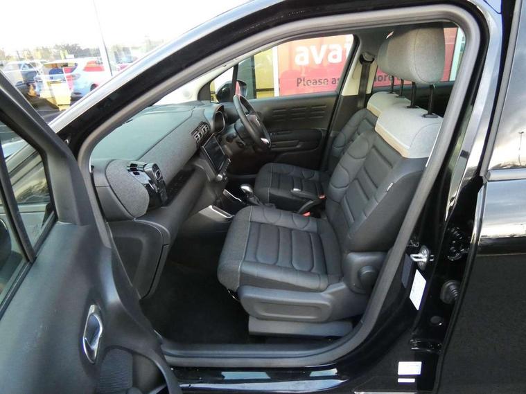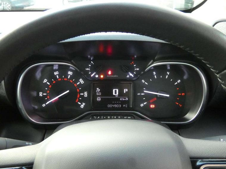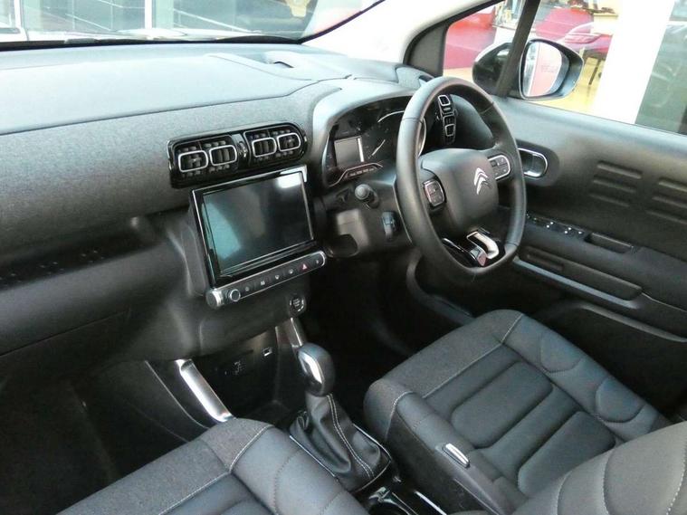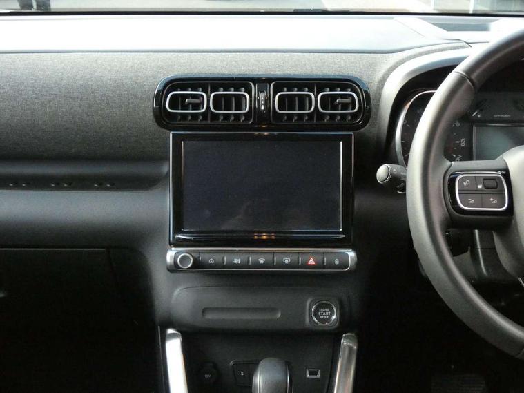 3.5" head up display, 9" Touchscreen display, Citroen connect box emergency and assistance system, Citroen Connect Nav with 3D navigation, Coffee Break Alert, Cruise control with speed limiter, Driver instrument cluster including trip computer and rev counter with white text LCD display and white needles and chrome decor, eCall emergency call system, Engine start button, Lane departure warning system, Mirror screen with Apple CarPlay and Android auto, Outside temperature sensor, Rear parking sensors, Tailgate, Top rear vision reversing camera, Traffic signs and speed limit recognition and recommendation, Variable assistance power steering, Voice recognition for radio, navigation and telephone features, Bluetooth hands free and media streaming with USB socket, Citroen connected DAB radio with 6 speakers, Steering wheel mounted controls for stereo and telephone, 3D effect LED rear lights, Automatic Eco LED headlights, Automatic lights and windscreen wipers, Black roof bars, Body colour painted door handles, Chrome chevrons front grille, Electric front windows + one touch + anti-pinch, Electric rear windows with one touch/anti-pinch, Electrically adjustable door mirrors, Electrically folding door mirrors, Electrochrome rear view mirror, Fog lights integrated into front bumper, Front and rear body coloured bumpers, Heated door mirrors, Integrated roof spoiler, LED daytime running lights, LED third brake light, Rear side wing doors, Rear wiper, Roof aerial, Tinted rear windows and rear quarterpanel glass, Variable front intermittent wipers, 12V socket in front, 12V socket in rear of vehicle, 60/40 split folding rear seats with sliding rear bench, centre armrest and ski flap, Automatic air conditioning, Boot light, Brasilia leather effect and flecked cloth upholstery with metropolitan graphite ambience, advanced comfort seats and wrapped dashboard, Central adjustable armrest on drivers seat, Centre console with closed storage and chrome insert, Driver and front passenger cup holders, Driver and passenger sunvisor with courtesy mirror, Flex load/Pull out boot floor, Front and rear courtesy reading lights, Front and rear door storage, Front head restraints, Front passengers seat flat folding, Glovebox with closable lid, Height adjustable driver's seat, Height and reach adjustable steering wheel, Leather steering wheel with satin chrome inserts and radio controls, Manual handbrake with chrome insert, Passenger compartment headlight adjustment, Rear isofix mounting points (outside seats) with top tether, Row 2 - Three seats with individually adjustable head rests, Satin chrome interior door handles, Single front passenger seat, Gloss black colour pack - C3 Aircross Max, 3 point, height adjustable, pre tensioned front seatbelts, ABS with Electronic brakeforce distribution and Emergency braking assistance, Active safety brake including Forward collision warning, Automatic illumination of hazard warning lights, Curtain airbags, Driver airbag, Drivers/passengers and rear seats unfastened seat belt warning, ESC (Electronic Stability Control), Front lateral airbags, Front passenger airbag, Front passenger airbag deactivation switch, Hill start assist function, Mono-tone horn, Rear door child safety locks, Three 3 point rear seatbelts, Tyre pressure monitor, Automatic door and boot locking when moving off with automatic unlocking in case of impact, Automatic locking of the vehicle (after 30 seconds if door or boot unopened), Immobiliser, Keyless entry and keyless start, Perimetric and volumetric anti theft alarm, Remote central locking + deadlocks, Vehicle locater function (headlights illuminate when button on key pressed), Gloss black centre console, Satin chrome air vent decors,