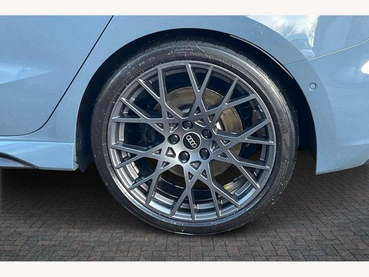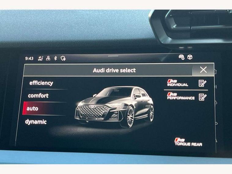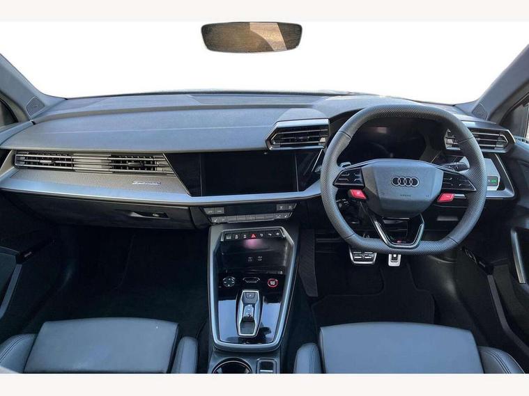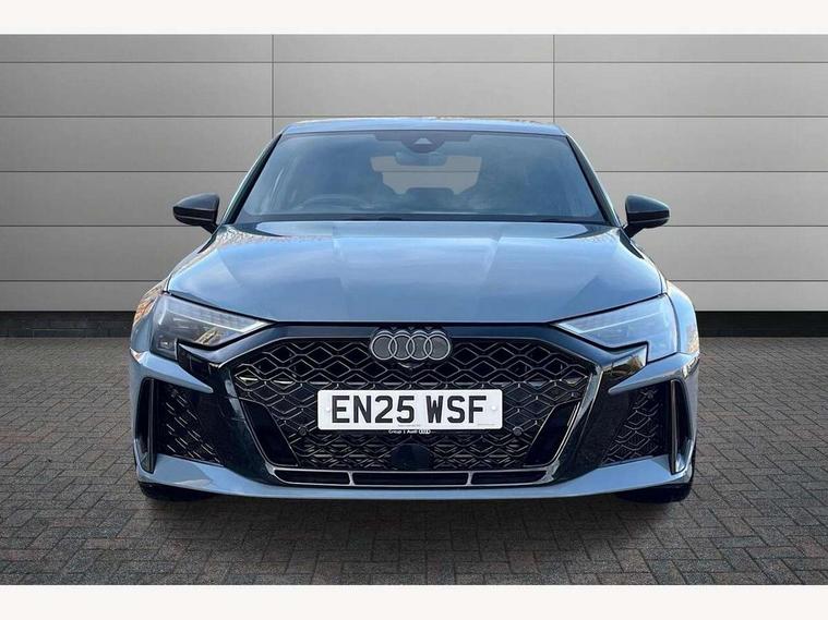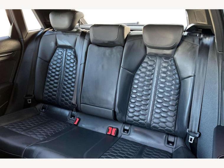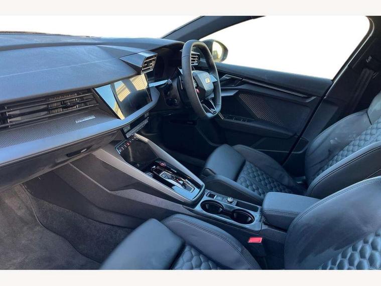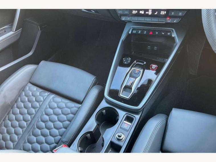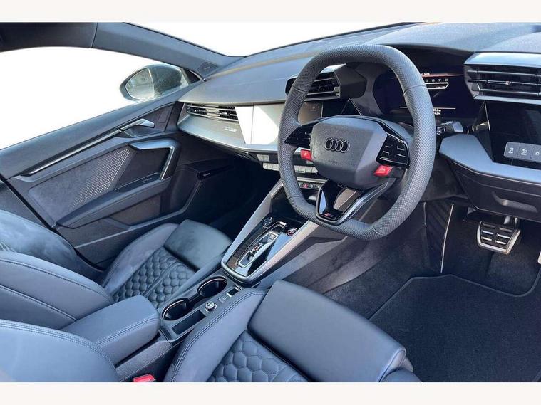 Adjustable speed limiter, Audi drive select comfort, auto, dynamic and efficiency, Audi smartphone interface with app store includes wireless Apple carplay, Android auto and Amazon alexa integration, Audi virtual cockpit plus with RS specific design and 12.3" display with additional graphic display options, Automatic start/stop system with recuperation, Bluetooth interface, Camera based traffic sign recognition, Collision avoidance assistant, Distraction and Fatigue warning, e-Call (emergency call), Lane departure warning system, MMI Navigation Plus with high resolution 10.1" colour touch screen display, Park Assist with parking system Plus, Progressive steering, RS specific driving modes - RS Individual, RS Performance and RS Torque rear, Voice control system with natural language interaction, Quattro permanent four wheel drive, Audi Phonebox light with wireless charging, DAB Digital radio, USB ports with charging function in the rear, All weather light, Audi beam LED projection of RS logo on ground as you exit, Audi darkened matrix LED headlights with dynamic light sequencing and dynamic indicator, Auto dimming frameless rear view mirror, Automatic dynamic range control, Carbon door mirror housings, Carbon fibre engine cover, Dipped beam, main beam, position light and turning light, Dynamic RS specific light sequencing of the coming home and leaving home function, Electrically adjustable/heated/folding/auto dimming door mirrors with integrated LED indications + kerb view function for passenger side, Exterior model badging, Front electric windows, Headlight cleaning system, Heat insulating glass windscreen, Intersection light, LED 3rd brake light, LED brake lights, LED rear lights with dynamic light sequencing and dynamic indicator, LED rear number plate lights, LED reverse light, LED tail lights, Light and rain sensors, Manoeuvring light, Motorway light, Privacy glass - dark tinted rear window, rear door and side windows, Rear electric windows, Rear side wing doors, Rear wiper, Roof edge spoiler in carbon, RS dual branch exhaust system with two chrome plated oval tailpipe trims, Static Cornering lights, Visually upgraded RS specific daytime running light choice of 4 digital signature in chequered flag design within the headlight, 12V socket and storage compartment in front centre console, 3 seat bench in 2nd row, 3 Spoke flat top and bottomed black leather multi function steering and gear shift paddles, 3-zone deluxe automatic air conditioning, 40/20/40 split folding rear seat bench, Black cloth headlining, Black front and rear floor mats, Front and rear headrests, Front centre armrest, Front door sill trims with RS 3 logo, Front sports seats RS embossed logo, Heated front seats, Height and reach adjustable steering wheel, Manual boot compartment lid, Manually adjustable front seats, Rear centre armrest with cupholder, Seat side bolsters, Single front passenger seat, Stainless steel pedals and front footrest in black, Vanadium look - Interior door handles, Door trim, power latching, Air vents, window controls, mirror adjust, rear door lock, Selector lever in centre console, Black Styling plus package - RS3, Extended ambient lighting package Pro with Multi-coloured contour lighting of instrument panel - RS3, RS exterior features pack in carbon and gloss black - RS3, RS sport suspension pack - RS3, Storage package - RS3 Sportback, Technology package without speed limiter - RS3, 3x3 point rear seat belts, Driver and front passenger airbag with passenger airbag deactivation, Electronic Stabilisation Control (ESC) including ABS, ASR and EDL, First aid kit with warning triangle and 2 safety vests, Hill hold assist, Pre-sense front with pedestrian and cyclist detection, RS steel brakes, Seatbelt monitoring, Tyre pressure loss indicator, Anti theft alarm, Anti-theft wheel bolts, Electronically operated child locks, Immobiliser, Remote central locking with safelock, Black dashboard, Inlays in carbon atlas structure, 19" 10 cross spoke silk matt grey alloy wheels, Tyre repair kit,