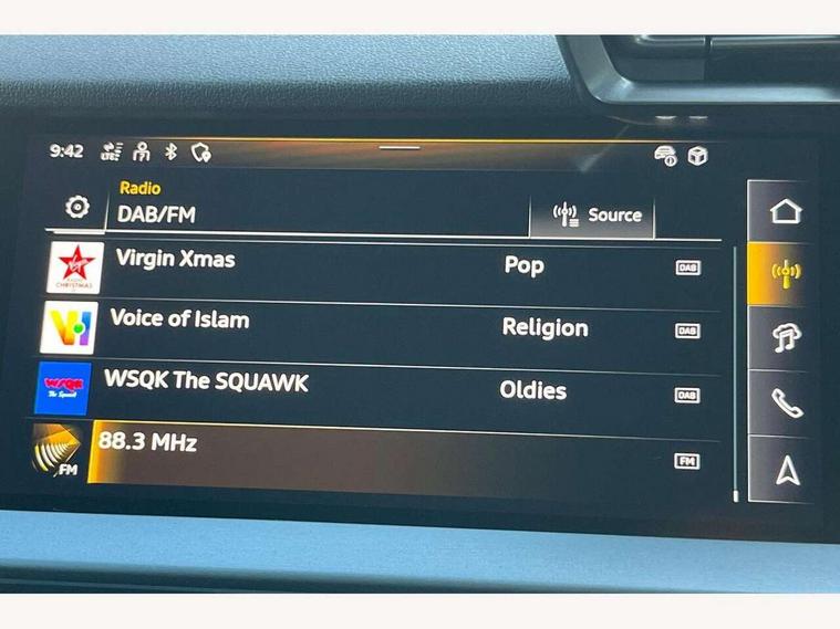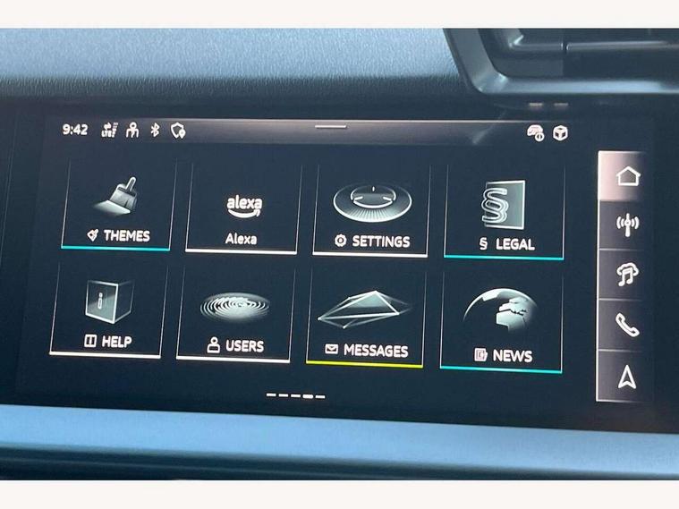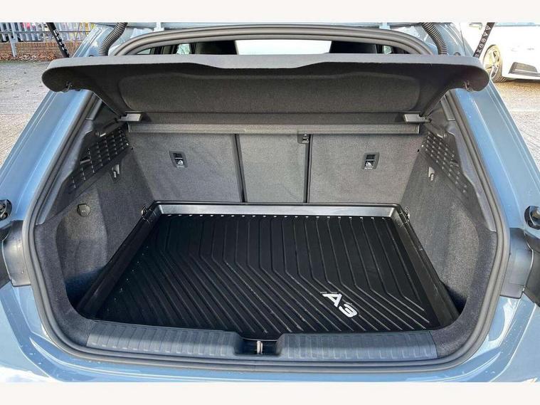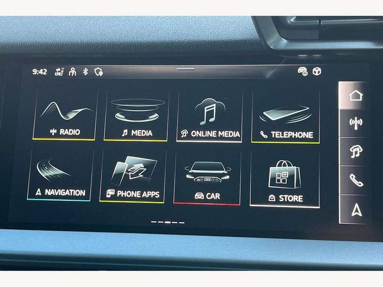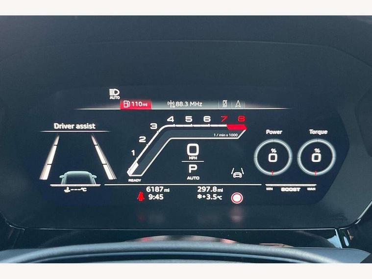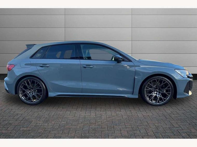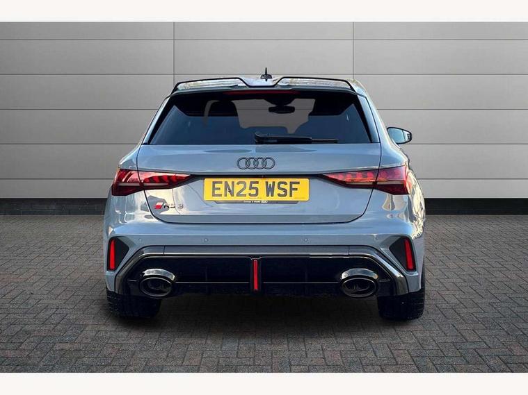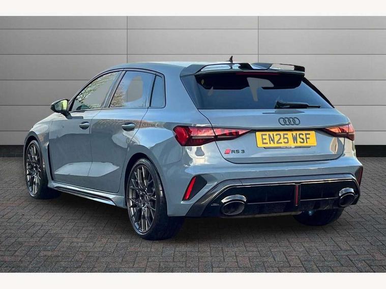 Adjustable speed limiter, Audi drive select comfort, auto, dynamic and efficiency, Audi smartphone interface with app store includes wireless Apple carplay, Android auto and Amazon alexa integration, Audi virtual cockpit plus with RS specific design and 12.3" display with additional graphic display options, Automatic start/stop system with recuperation, Bluetooth interface, Camera based traffic sign recognition, Collision avoidance assistant, Distraction and Fatigue warning, e-Call (emergency call), Lane departure warning system, MMI Navigation Plus with high resolution 10.1" colour touch screen display, Park Assist with parking system Plus, Progressive steering, RS specific driving modes - RS Individual, RS Performance and RS Torque rear, Voice control system with natural language interaction, Quattro permanent four wheel drive, Audi Phonebox light with wireless charging, DAB Digital radio, USB ports with charging function in the rear, All weather light, Audi beam LED projection of RS logo on ground as you exit, Audi darkened matrix LED headlights with dynamic light sequencing and dynamic indicator, Auto dimming frameless rear view mirror, Automatic dynamic range control, Carbon door mirror housings, Carbon fibre engine cover, Dipped beam, main beam, position light and turning light, Dynamic RS specific light sequencing of the coming home and leaving home function, Electrically adjustable/heated/folding/auto dimming door mirrors with integrated LED indications + kerb view function for passenger side, Exterior model badging, Front electric windows, Headlight cleaning system, Heat insulating glass windscreen, Intersection light, LED 3rd brake light, LED brake lights, LED rear lights with dynamic light sequencing and dynamic indicator, LED rear number plate lights, LED reverse light, LED tail lights, Light and rain sensors, Manoeuvring light, Motorway light, Privacy glass - dark tinted rear window, rear door and side windows, Rear electric windows, Rear side wing doors, Rear wiper, Roof edge spoiler in carbon, RS dual branch exhaust system with two chrome plated oval tailpipe trims, Static Cornering lights, Visually upgraded RS specific daytime running light choice of 4 digital signature in chequered flag design within the headlight, 12V socket and storage compartment in front centre console, 3 seat bench in 2nd row, 3 Spoke flat top and bottomed black leather multi function steering and gear shift paddles, 3-zone deluxe automatic air conditioning, 40/20/40 split folding rear seat bench, Black cloth headlining, Black front and rear floor mats, Front and rear headrests, Front centre armrest, Front door sill trims with RS 3 logo, Front sports seats RS embossed logo, Heated front seats, Height and reach adjustable steering wheel, Manual boot compartment lid, Manually adjustable front seats, Rear centre armrest with cupholder, Seat side bolsters, Single front passenger seat, Stainless steel pedals and front footrest in black, Vanadium look - Interior door handles, Door trim, power latching, Air vents, window controls, mirror adjust, rear door lock, Selector lever in centre console, Black Styling plus package - RS3, Extended ambient lighting package Pro with Multi-coloured contour lighting of instrument panel - RS3, RS exterior features pack in carbon and gloss black - RS3, RS sport suspension pack - RS3, Storage package - RS3 Sportback, Technology package without speed limiter - RS3, 3x3 point rear seat belts, Driver and front passenger airbag with passenger airbag deactivation, Electronic Stabilisation Control (ESC) including ABS, ASR and EDL, First aid kit with warning triangle and 2 safety vests, Hill hold assist, Pre-sense front with pedestrian and cyclist detection, RS steel brakes, Seatbelt monitoring, Tyre pressure loss indicator, Anti theft alarm, Anti-theft wheel bolts, Electronically operated child locks, Immobiliser, Remote central locking with safelock, Black dashboard, Inlays in carbon atlas structure, 19" 10 cross spoke silk matt grey alloy wheels, Tyre repair kit,