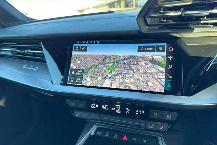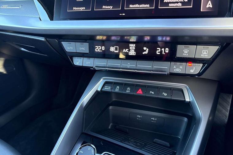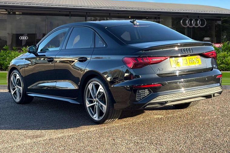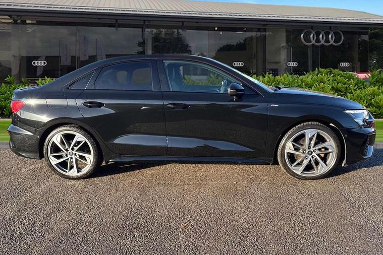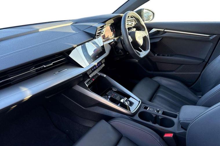 Audi drive select (Auto, Comfort, Dynamic, Efficiency and Individual), Audi smartphone interface, Audi Virtual Cockpit - 10.25" digital and colour instrument cluster, Automatic start/stop system with recuperation, Bluetooth interface, Camera based traffic sign recognition, Collision avoidance assistant, e-Call (emergency call), Electromechanical power speed sensitive steering, Lane departure warning system, MMI Navigation Plus with high resolution 10.1" colour touch screen display, Service indicator, Trip computer, Voice control system with natural language interaction, Sports suspension, 2xUSB-C connection with data and charging functions, 6 passive loudspeakers, CD player, DAB Digital radio, 3rd brake light, Acoustic glass windscreen, Audi beam uses LEDs to project the Audi logo onto the ground as you exit your A3, Auto dimming frameless rear view mirror, Electrically adjustable/heated/folding/auto dimming door mirrors with integrated LED indications + kerb view function for passenger side, Front electric windows, Illuminated door sills with aluminium inserts at the front with S logo, LED daytime running lights, LED headlights with LED rear lights and dynamic rear indicators, Light and rain sensors, Model and engine designation badges at rear, Privacy glass - dark tinted rear window, rear door and side windows, Rear boot, Rear electric windows, Rear side wing doors, S roof spoiler, 12V socket and storage compartment in front centre console, 3 seat bench in 2nd row, 3 spoke flat bottomed leather multifunction sport steering wheel with gear shift paddles, 4 way electrically adjustable lumbar support for driver and front passenger, 60/40 split folding rear seat bench, Black cloth headlining, Dual zone electronic climate control, Front and rear centre armrest in artificial leather, Front and rear headrests, Front/rear floor mats, Height and reach adjustable steering wheel, Interior lighting - glove compartment light and right hand side, Luggage compartment floor covering, Manual boot compartment lid, Single front passenger seat, Stainless steel pedals and front footrest in black, Twin leather upholstery with front sports seats S embossed logo, Aluminium interior elements pack - A3, Black styling pack - A3 Saloon/Black edition, LED interior lighting pack - A3 Saloon, 3x3 point rear seat belts, Driver and front passenger airbag with passenger airbag deactivation, Electronic Stabilisation Control (ESC) including ABS, ASR and EDL, First aid kit with warning triangle and 2 safety vests, Front side airbags with head airbags and interaction airbag, Pre-sense front with pedestrian and cyclist detection, Seatbelt monitoring, Tyre pressure loss indicator, Anti theft alarm, Anti-theft wheel bolts, Electronically operated child locks, Immobiliser, Remote control central locking, Aluminium air vent surrounds, Dark spectrum aluminium inlays, accent surfaces in the dashboard and centre console in platinum grey silk effect paint finish, 19" 5 arm trapezoid design alloy wheels in matt grey with diamond cut finish,