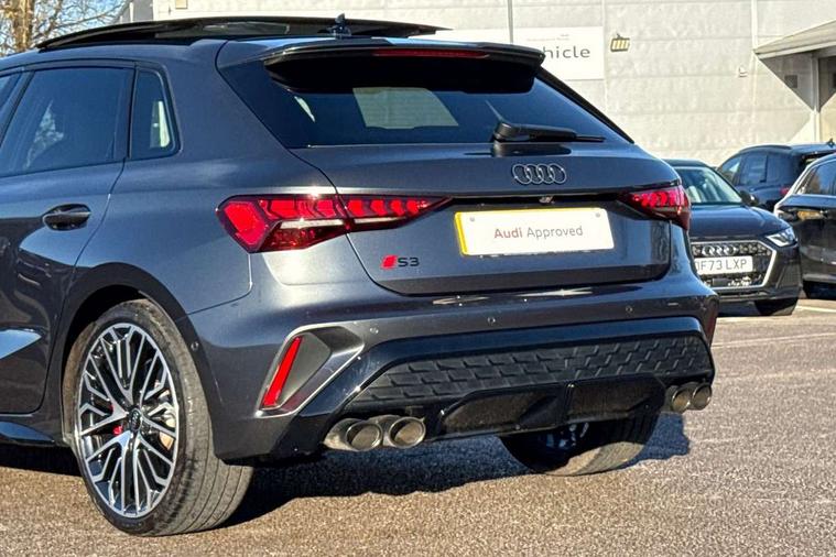 Adjustable speed limiter, Audi drive select, Audi smartphone interface with app store includes wireless Apple carplay, Android auto and Amazon alexa integration, Audi virtual cockpit plus - 12.3" full HD resolution dynamic digital instrument cluster, Automatic start/stop system with recuperation, Bluetooth interface, Camera based traffic sign recognition, Collision avoidance assistant, Distraction and Fatigue warning, e-Call (emergency call), Lane departure warning system, MMI Navigation Plus with high resolution 10.1" colour touch screen display, Park Assist with parking system Plus, Progressive steering, Service indicator, Tailgate, Trip computer, Voice control system with natural language interaction, Quattro permanent four wheel drive, S sport suspension with spring damper adjustment and lowering by 15mm, Audi Phonebox light with wireless charging, DAB Digital radio, USB ports with charging function in the rear, Anthracite grey Audi rings (front and rear), Audi Beam uses LEDs to project the rhombus S logo onto the ground as you exit your S3, Auto dimming frameless rear view mirror, Black accents front and rear bumpers including air inlets, Black accents in front grille and frame, Black accents window trims strips, Electrically adjustable/heated/folding/auto dimming door mirrors with integrated LED indications + kerb view function for passenger side, Exterior model badging, Front electric windows, Headlight washers, Heat insulating glass windscreen, Illuminated door sills with aluminium inserts at the front with S logo, LED 3rd brake light, LED daytime running lights, LED headlights with LED rear lights and dynamic rear indicators, Light and rain sensors, Privacy glass - dark tinted rear window, rear door and side windows, Rear electric windows, Rear side wing doors, Rear wiper, S grille, S3 front bumper with S specific air intake grilles, S3 roof spoiler, 12V socket and storage compartment in front centre console, 3 seat bench in 2nd row, 3 spoke flat bottomed leather multifunction sport steering wheel with gear shift paddles, 3-zone deluxe automatic air conditioning, 4 way electrically adjustable lumbar support for driver and front passenger, 40/20/40 split folding rear seat bench, Black cloth headlining, Fine Nappa leather upholstery with front sports seats S embossed logo, Front and rear centre armrest in artificial leather, Front and rear centre armrest in artificial leather with contrasting stitching on armrests and instrument panel, Front and rear headrests, Front/rear floor mats, Heated front seats, Height and reach adjustable steering wheel, Manual boot compartment lid, Manually adjustable front seats, Rear cup holders, S badging on the steering wheel, Seat side bolsters, Single front passenger seat, Stainless steel pedals and front footrest in black, Aluminium interior elements pack - A3 Sportback, Extended ambient lighting package Pro - S3 Black edition, Storage package - A3, Technology package - A3, 3x3 point rear seat belts, Driver and front passenger airbag with passenger airbag deactivation, Electronic Stabilisation Control (ESC) including ABS, ASR and EDL, First aid kit with warning triangle and 2 safety vests, Front side airbags with head airbags and interaction airbag, Hill hold assist, Pre-sense front with pedestrian and cyclist detection, Seatbelt monitoring, Tyre pressure loss indicator, Anti theft alarm, Anti-theft wheel bolts, Electronically operated child locks, Immobiliser, Remote central locking with safelock, Inlays in black dynamica microfibre, Tyre repair kit,