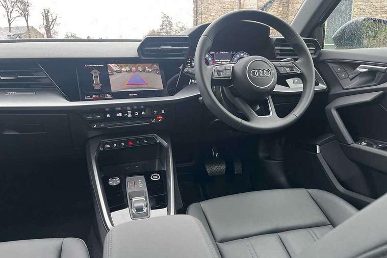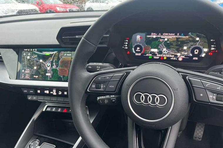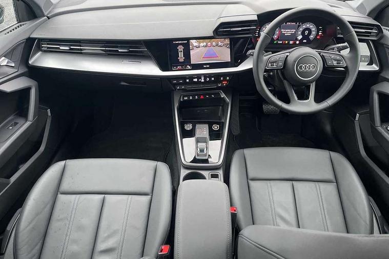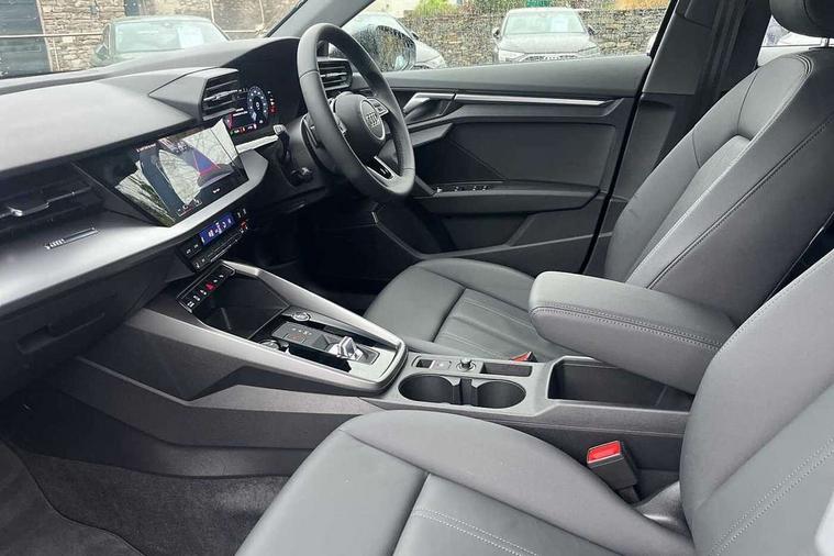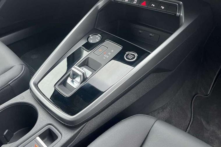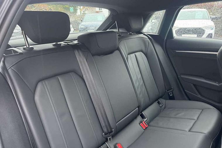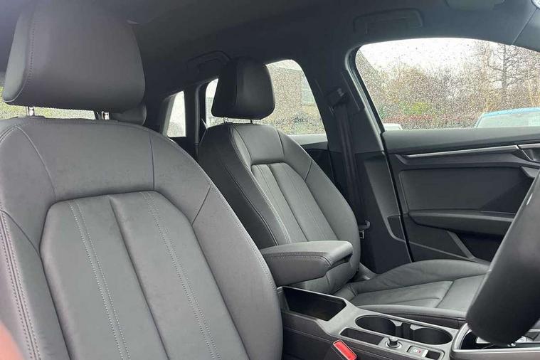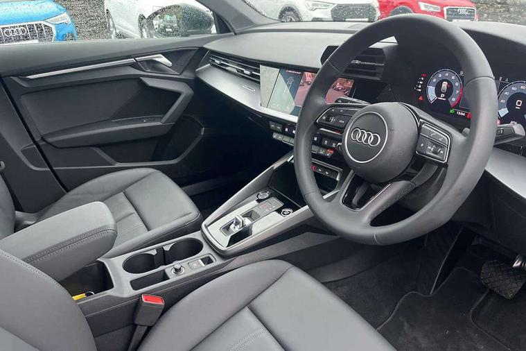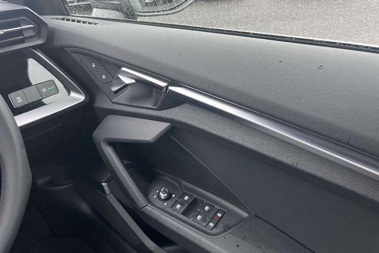 Audi drive select (Auto, Comfort, Dynamic and Individual), Audi smartphone interface, Audi Virtual Cockpit - 10.25" digital and colour instrument cluster, Automatic start/stop system with recuperation, Bluetooth interface, Camera based traffic sign recognition, Collision avoidance assistant, Cruise control, e-Call (emergency call), Electromechanical power speed sensitive steering, Lane departure warning system, MMI Navigation Plus with high resolution 10.1" colour touch screen display, Rear parking sensors, Service indicator, Trip computer, Voice control system with natural language interaction, Standard suspension, 2xUSB-C connection with data and charging functions, 6 passive loudspeakers, DAB Digital radio, 3rd brake light, Acoustic glass windscreen, Aluminium window trim, Auto dimming frameless rear view mirror, Body colour exterior mirrors, Body colour roof spoiler, Electrically adjustable/heated/folding/auto dimming door mirrors with integrated LED indications + kerb view function for passenger side, Front electric windows, LED daytime running lights, LED headlights and halogen rear lights, Light and rain sensors, Rear electric windows, Rear side wing doors, Rear window, rear door windows and rear side windows in clear glass, Rear wiper, 12V socket and storage compartment in front centre console, 3 seat bench in 2nd row, 3 spoke leather multifunction steering wheel with paddle shift, 4 way electrically adjustable lumbar support for driver and front passenger, 60/40 split folding rear seat bench, Dual zone electronic climate control, Front and rear headrests, Front centre armrest, Front door sill trims with aluminium inlay, Front/rear floor mats, Height and reach adjustable steering wheel, Interior lighting - Front and rear roof module including reading lights, glove compartment light and right hand side, Interior lighting - glove compartment light and right hand side, Luggage compartment floor covering, Manual boot compartment lid, Manually adjustable front seats, Routine cloth upholstery with front sports seats, Seat side bolsters, Single front passenger seat, Steel grey cloth headlining, Aluminium interior elements pack - A3 Sportback, LED interior lighting pack - A3 Sportback, Sport styling pack - A3 Sportback, 3x3 point rear seat belts, Driver and front passenger airbag with passenger airbag deactivation, Electronic Stabilisation Control (ESC) including ABS, ASR and EDL, First aid kit with warning triangle and 2 safety vests, Front side airbags with head airbags and interaction airbag, Pre-sense front with pedestrian and cyclist detection, Seatbelt monitoring, Tyre pressure loss indicator, Anti theft alarm, Anti-theft wheel bolts, Electronically operated child lock, Immobiliser, Remote control central locking, Inlays with silk effect paint in platinum grey,