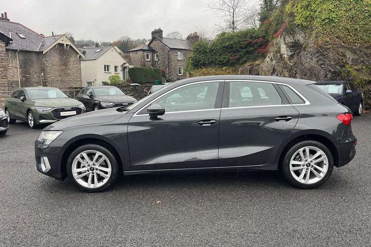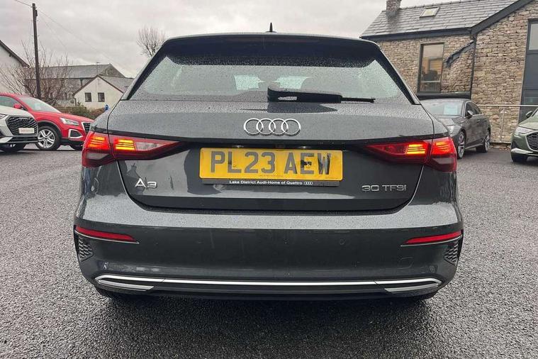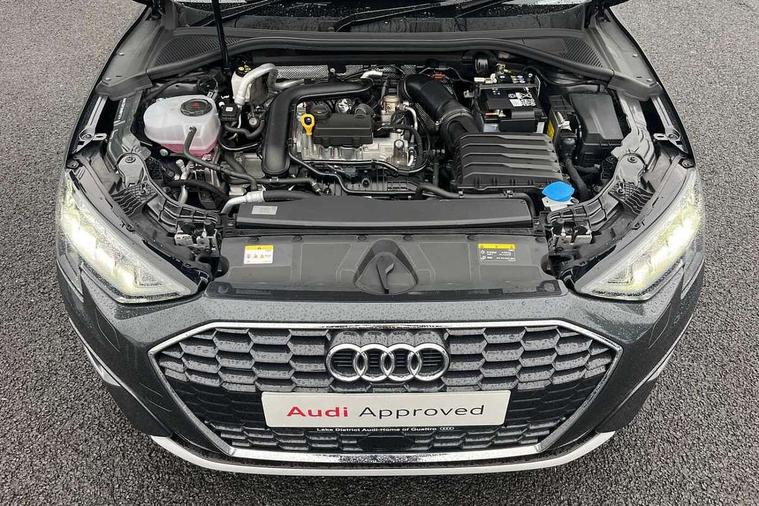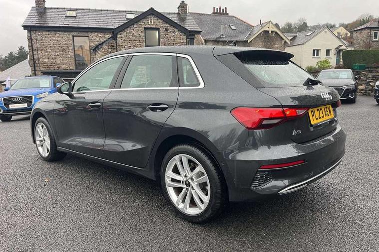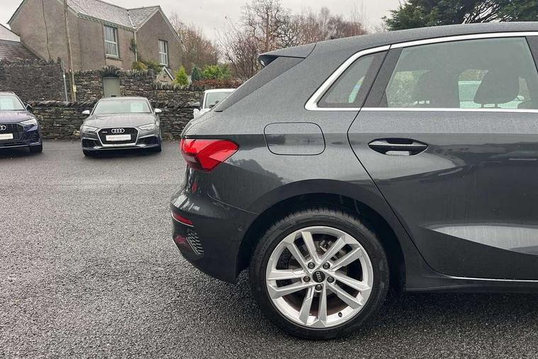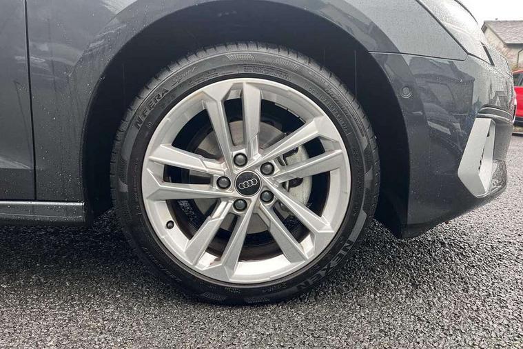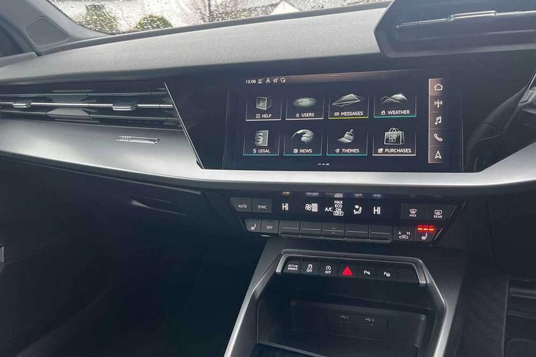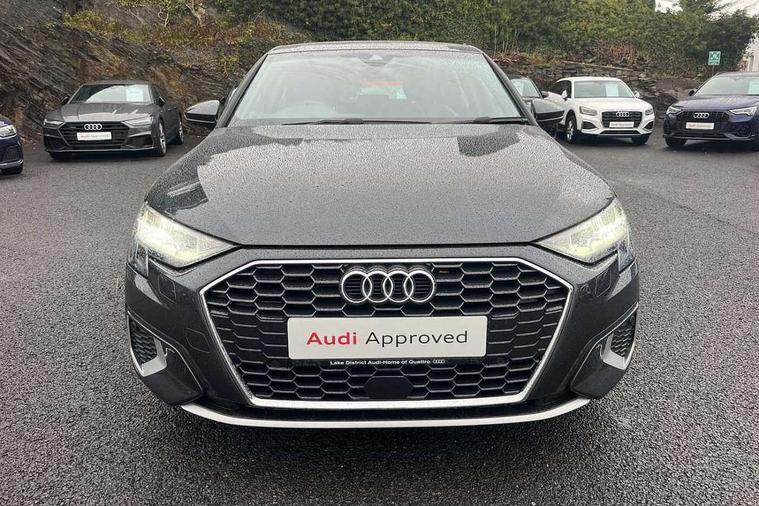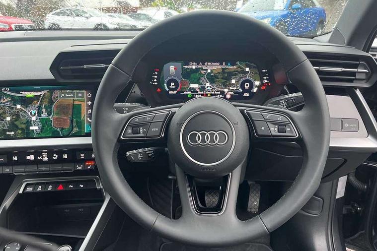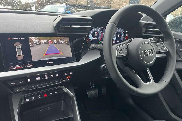 Audi drive select (Auto, Comfort, Dynamic and Individual), Audi smartphone interface, Audi Virtual Cockpit - 10.25" digital and colour instrument cluster, Automatic start/stop system with recuperation, Bluetooth interface, Camera based traffic sign recognition, Collision avoidance assistant, Cruise control, e-Call (emergency call), Electromechanical power speed sensitive steering, Lane departure warning system, MMI Navigation Plus with high resolution 10.1" colour touch screen display, Rear parking sensors, Service indicator, Trip computer, Voice control system with natural language interaction, Standard suspension, 2xUSB-C connection with data and charging functions, 6 passive loudspeakers, DAB Digital radio, 3rd brake light, Acoustic glass windscreen, Aluminium window trim, Auto dimming frameless rear view mirror, Body colour exterior mirrors, Body colour roof spoiler, Electrically adjustable/heated/folding/auto dimming door mirrors with integrated LED indications + kerb view function for passenger side, Front electric windows, LED daytime running lights, LED headlights and halogen rear lights, Light and rain sensors, Rear electric windows, Rear side wing doors, Rear window, rear door windows and rear side windows in clear glass, Rear wiper, 12V socket and storage compartment in front centre console, 3 seat bench in 2nd row, 3 spoke leather multifunction steering wheel with paddle shift, 4 way electrically adjustable lumbar support for driver and front passenger, 60/40 split folding rear seat bench, Dual zone electronic climate control, Front and rear headrests, Front centre armrest, Front door sill trims with aluminium inlay, Front/rear floor mats, Height and reach adjustable steering wheel, Interior lighting - Front and rear roof module including reading lights, glove compartment light and right hand side, Interior lighting - glove compartment light and right hand side, Luggage compartment floor covering, Manual boot compartment lid, Manually adjustable front seats, Routine cloth upholstery with front sports seats, Seat side bolsters, Single front passenger seat, Steel grey cloth headlining, Aluminium interior elements pack - A3 Sportback, LED interior lighting pack - A3 Sportback, Sport styling pack - A3 Sportback, 3x3 point rear seat belts, Driver and front passenger airbag with passenger airbag deactivation, Electronic Stabilisation Control (ESC) including ABS, ASR and EDL, First aid kit with warning triangle and 2 safety vests, Front side airbags with head airbags and interaction airbag, Pre-sense front with pedestrian and cyclist detection, Seatbelt monitoring, Tyre pressure loss indicator, Anti theft alarm, Anti-theft wheel bolts, Electronically operated child lock, Immobiliser, Remote control central locking, Inlays with silk effect paint in platinum grey,