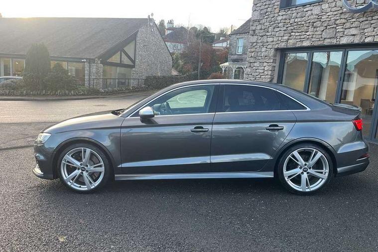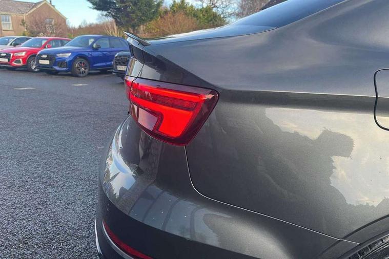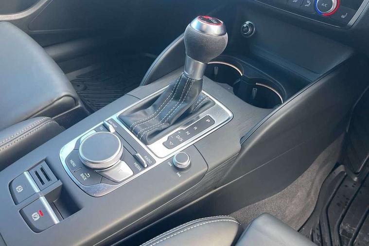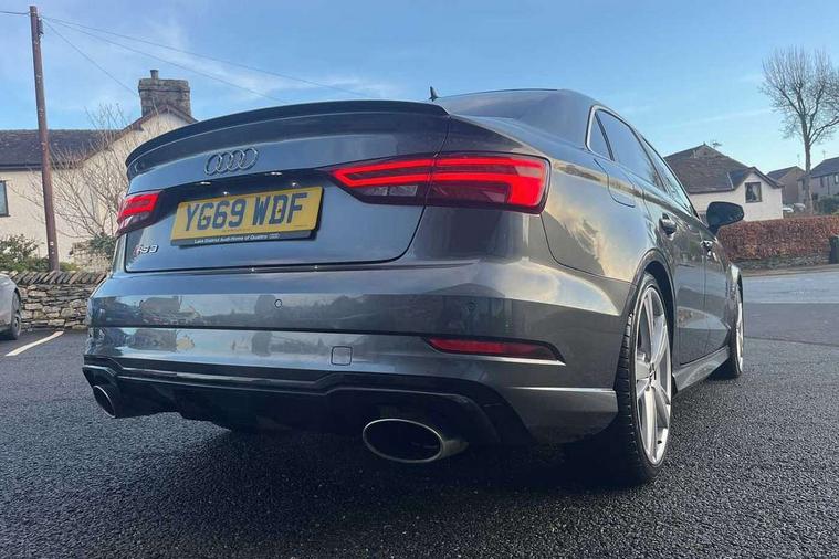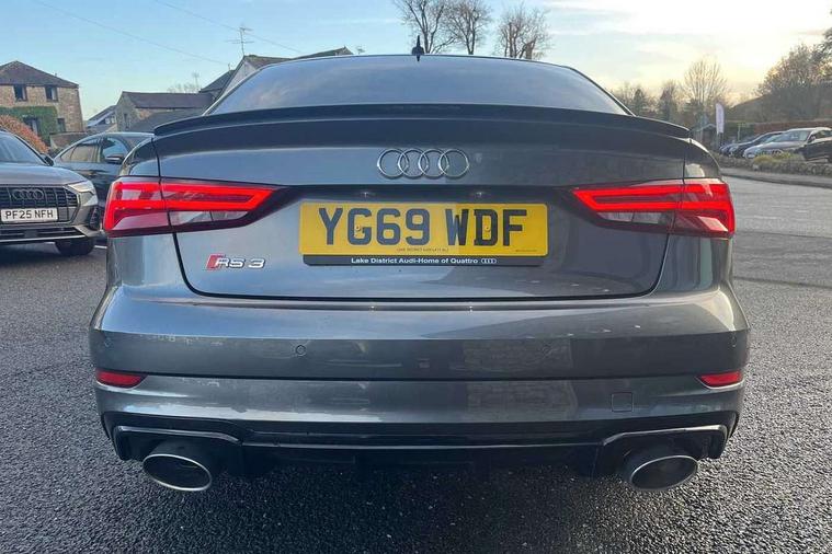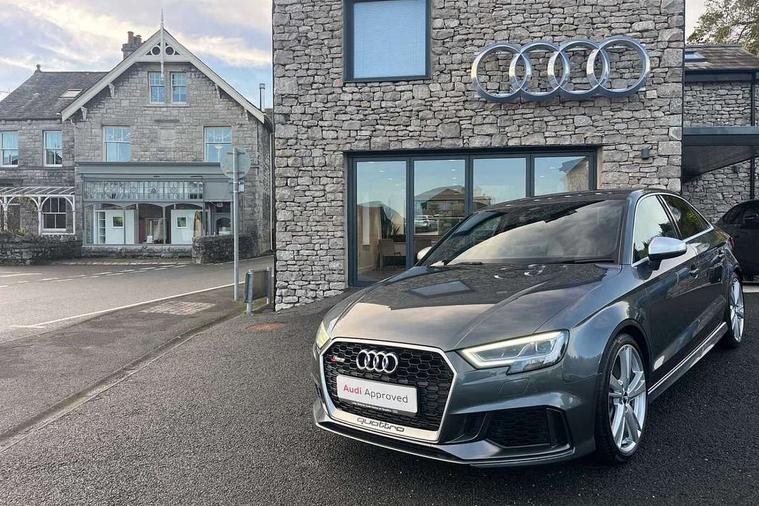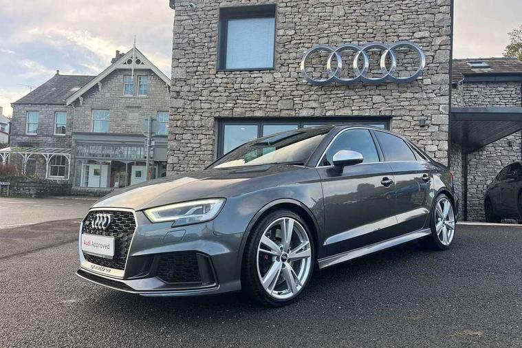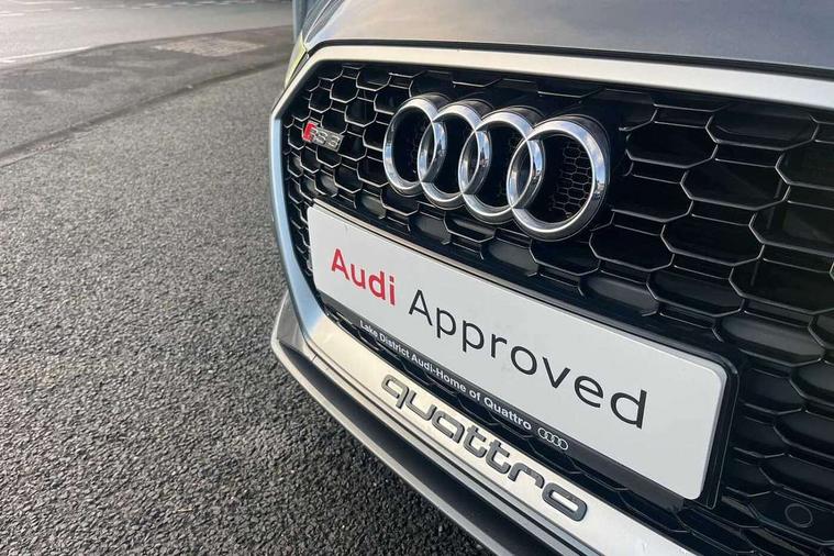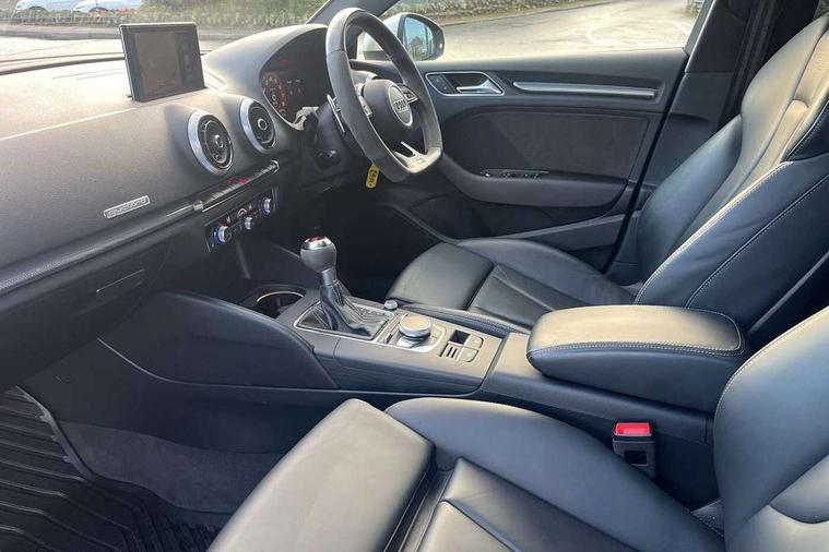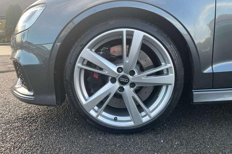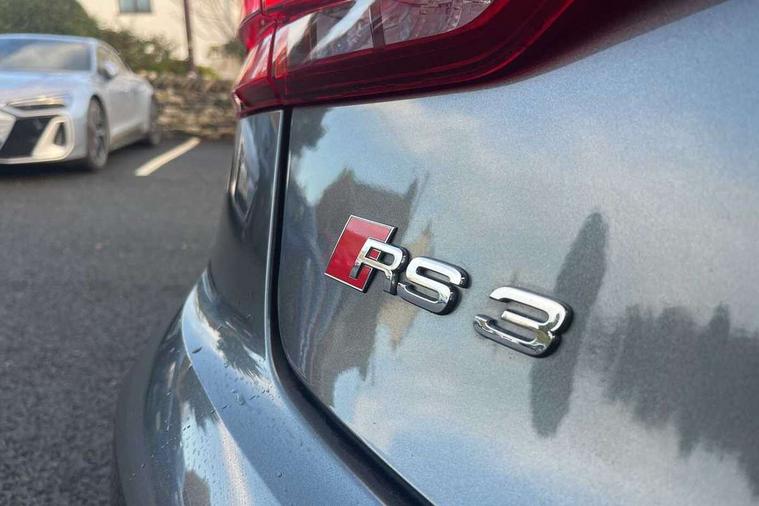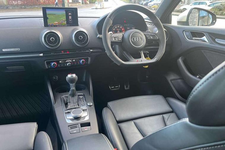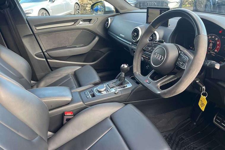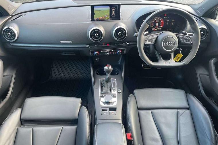 3D design optic inlays in titanium grey, Aluminium air vent surrounds, Aluminium trim elements, LED interior light pack - A3/RS3, Non smoking pack - RS3, Storage and luggage pack - A3/RS3, Tyre repair kit, Anti theft alarm, Anti-theft wheel bolts, Immobiliser, Remote control central locking, 2 USB interfaces and Aux-In jack, CD player, DAB Digital radio, MMI radio plus with 7" colour MMI screen and MMI controller, Two SDXC card slots, 3 point seatbelts on all seats, ABS/EBD, Airbags - front driver/passenger, front & rear side, curtain, drivers knee, ASR, Black painted brake calipers with RS logo at the front, EDL, Electromechanical parking brake, ESC - Electronic Stability Control + traction control, Hill hold assist, Predictive pedestrian protection, RS brake system, Seatbelt warning, Warning triangle and first aid kit, Audi Beam uses LEDs to project the Audi Sport logo, Auto dimming rear view mirror, Automatic lights and wipers, Body colour rear spoiler, Body coloured side sills extension, Electrically adjustable and heated door mirrors with integrated LED side indicators, Flared front wheel arches, Front and rear electric windows, Gloss black rear diffuser insert, Headlight washers, Heated rear window, Heated windscreen washer jets, Honeycomb radiator grille in gloss black, Illuminated door sill trims with RS logo, Matt aluminium door mirrors, Matt aluminium radiator grille frame including matt black quattro logo, Matt aluminium window trims, Model and engine designation badges at rear, Privacy glass - dark tinted rear and rear side windows from B-pillar backwards, RS front bumper with large air inlets in gloss black and horizontal blade painted in body colour, RS3 badge on grille and luggage compartment lid, 3 adjustable rear headrests, 3 Spoke flat bottomed leather/alcantara multi-function sport steering wheel + gear shift paddles in aluminium look, contrast stitching and RS badging, 4 lashing points to secure luggage, 60/40 split folding rear seat, Adjustable front centre armrest, Driver/passenger sunvisors, Dual zone electronic climate control, Front and rear interior lights with delay, Front head restraints, Front/rear floor mats, Heated front seats, Height/depth adjustable steering column, Illuminated glovebox, ISOFIX child seat mounting and Top Tether with front passenger airbag deactivation, Manual height adjustable front seats, RS gear lever knob in alcantara/leather gaiter with contrast stitching, Stainless steel pedals, Storage compartments in doors side trims, centre console and under front drivers seat, Tool kit, Audi connect, Audi drive select, Audi phone box with wireless charging, Audi smartphone interface, Audi virtual cockpit with RS specific display, Automatic start/stop system, Bluetooth interface, MMI navigation plus with MMI touch, Progressive power assisted steering, Service indicator, Voice control system, RS sports suspension,