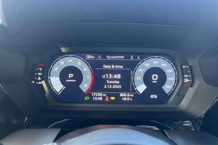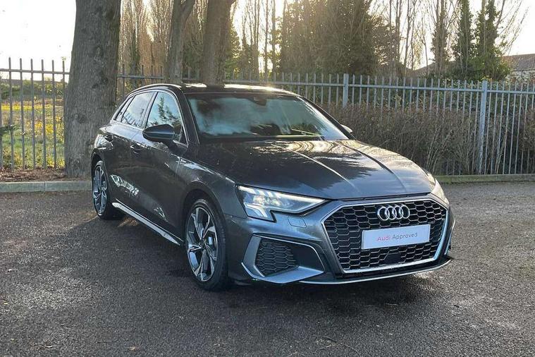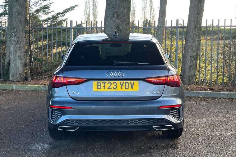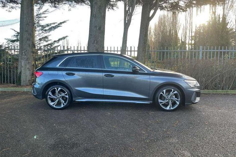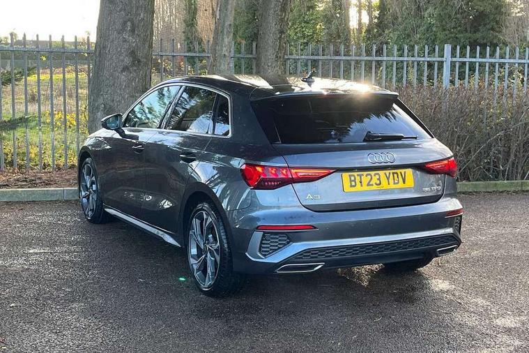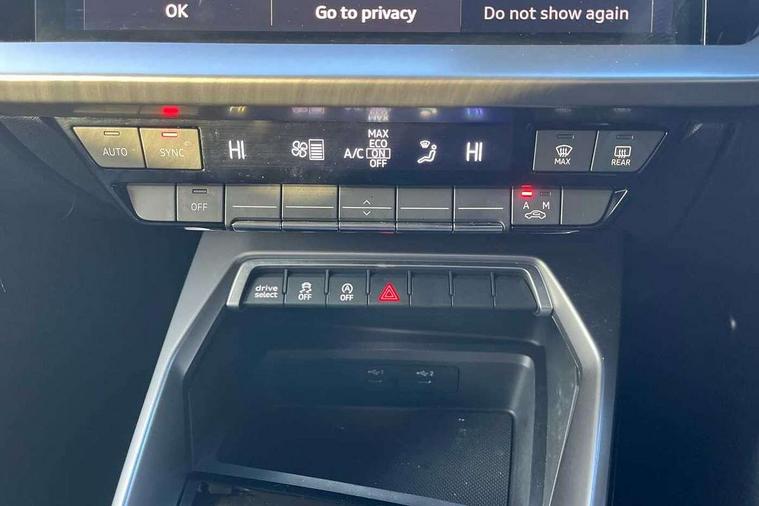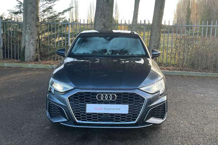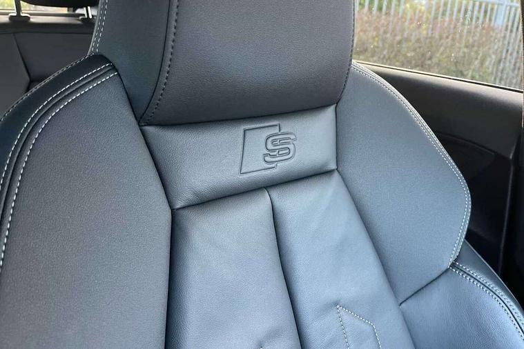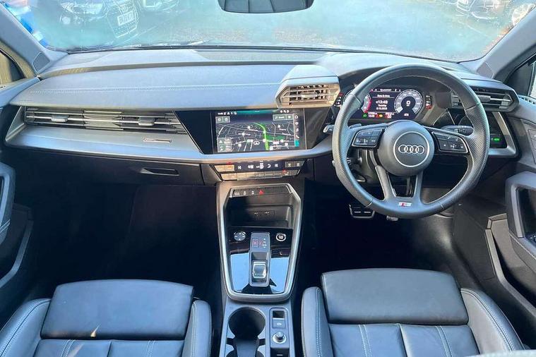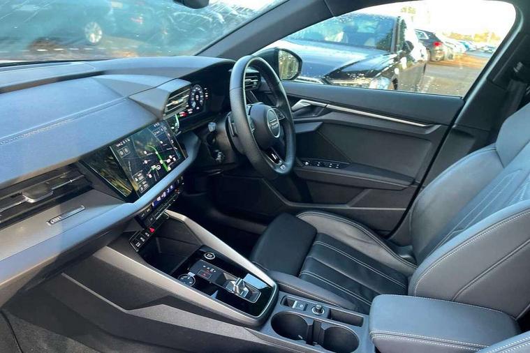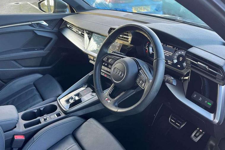 Audi drive select (Auto, Comfort, Dynamic, Efficiency and Individual), Audi smartphone interface, Audi Virtual Cockpit - 10.25" digital and colour instrument cluster, Automatic start/stop system with recuperation, Bluetooth interface, Camera based traffic sign recognition, Collision avoidance assistant, e-Call (emergency call), Electromechanical power speed sensitive steering, Lane departure warning system, MMI Navigation Plus with high resolution 10.1" colour touch screen display, Service indicator, Trip computer, Voice control system with natural language interaction, Sports suspension, 2xUSB-C connection with data and charging functions, 6 passive loudspeakers, DAB Digital radio, 3rd brake light, Acoustic glass windscreen, Aluminium window trim, Auto dimming frameless rear view mirror, Body colour exterior mirrors, Electrically adjustable/heated/folding/auto dimming door mirrors with integrated LED indications + kerb view function for passenger side, Front electric windows, Illuminated aluminium inserts front door sills with S logo, LED daytime running lights, LED headlights with LED rear lights and dynamic rear indicators, Light and rain sensors, Privacy glass - dark tinted rear window, rear door and side windows, Rear electric windows, Rear side air outlets in grained matt black, Rear side wing doors, Rear wiper, S line bumpers, S roof spoiler, 12V socket and storage compartment in front centre console, 3 seat bench in 2nd row, 3 spoke leather multifunction steering wheel with paddle shift, 4 way electrically adjustable lumbar support for driver and front passenger, 60/40 split folding rear seat bench, Black cloth headlining, Dual zone electronic climate control, Front and rear centre armrest in leather, Front and rear headrests, Front/rear floor mats, Height and reach adjustable steering wheel, Interior lighting - glove compartment light and right hand side, Luggage compartment floor covering, Manual boot compartment lid, Manually adjustable front seats, Seat side bolsters, Single front passenger seat, Stainless steel pedals and front footrest in black, Twin leather upholstery with front sports seats S embossed logo, Aluminium interior elements pack - A3 Sportback, LED interior lighting pack - A3 Sportback, S line styling pack - A3 Sportback, 3x3 point rear seat belts, Driver and front passenger airbag with passenger airbag deactivation, Electronic Stabilisation Control (ESC) including ABS, ASR and EDL, First aid kit with warning triangle and 2 safety vests, Front side airbags with head airbags and interaction airbag, Pre-sense front with pedestrian and cyclist detection, Seatbelt monitoring, Tyre pressure loss indicator, Anti theft alarm, Anti-theft wheel bolts, Electronically operated child lock, Immobiliser, Remote control central locking, Dark spectrum aluminium inlays, accent surfaces in the dashboard and centre console in platinum grey silk effect paint finish,