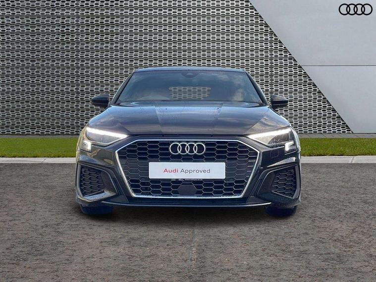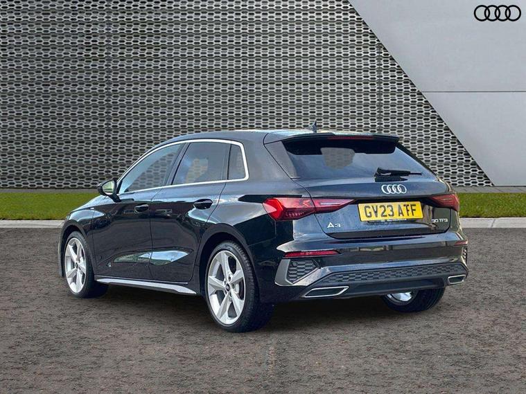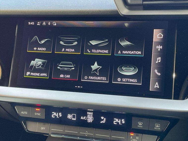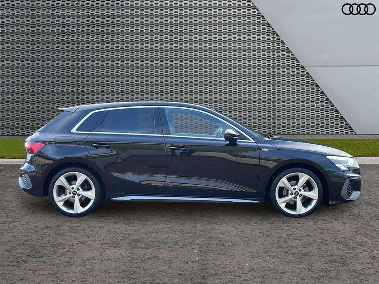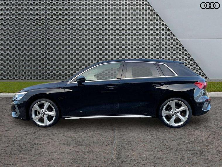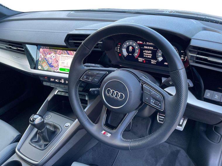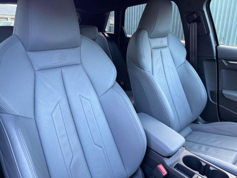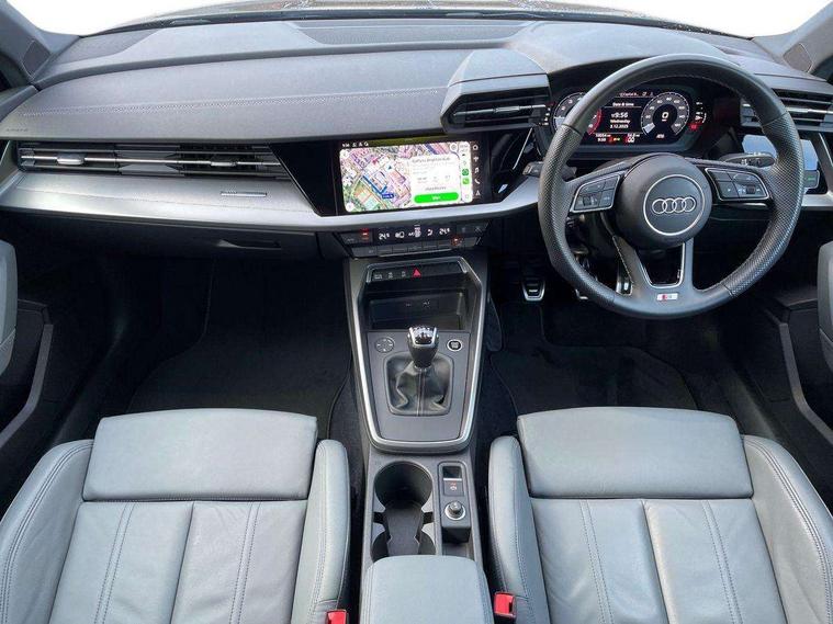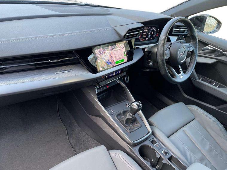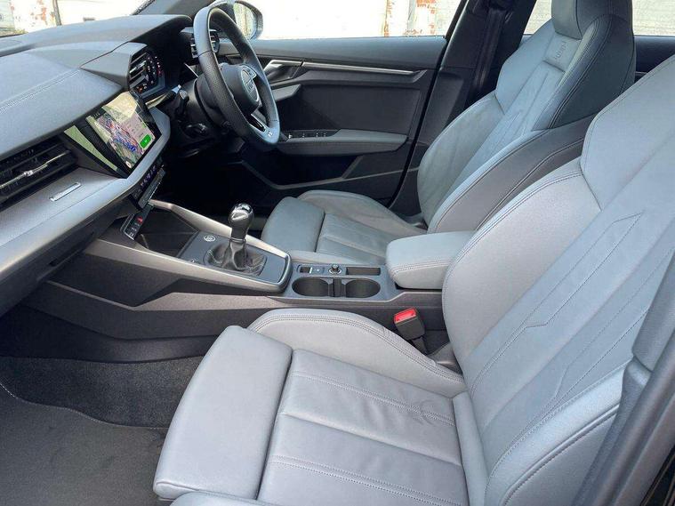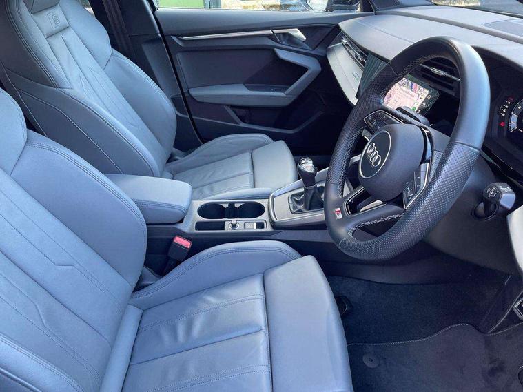 Audi drive select (Auto, Comfort, Dynamic and Individual), Audi smartphone interface, Audi Virtual Cockpit - 10.25" digital and colour instrument cluster, Automatic start/stop system with recuperation, Bluetooth interface, Camera based traffic sign recognition, Collision avoidance assistant, Cruise control, e-Call (emergency call), Electromechanical power speed sensitive steering, Lane departure warning system, MMI Navigation Plus with high resolution 10.1" colour touch screen display, Rear parking sensors, Service indicator, Trip computer, Voice control system with natural language interaction, Sports suspension, 2xUSB-C connection with data and charging functions, 6 passive loudspeakers, DAB Digital radio, 3rd brake light, Acoustic glass windscreen, Aluminium window trim, Auto dimming frameless rear view mirror, Body colour exterior mirrors, Electrically adjustable/heated/folding/auto dimming door mirrors with integrated LED indications + kerb view function for passenger side, Front electric windows, Illuminated aluminium inserts front door sills with S logo, LED daytime running lights, LED headlights with LED rear lights and dynamic rear indicators, Light and rain sensors, Privacy glass - dark tinted rear window, rear door and side windows, Rear electric windows, Rear side air outlets in grained matt black, Rear side wing doors, Rear wiper, S line bumpers, S roof spoiler, 12V socket and storage compartment in front centre console, 3 seat bench in 2nd row, 3 spoke leather multifunction steering wheel, 4 way electrically adjustable lumbar support for driver and front passenger, 60/40 split folding rear seat bench, Black cloth headlining, Dual zone electronic climate control, Front and rear centre armrest in leather, Front and rear headrests, Front/rear floor mats, Height and reach adjustable steering wheel, Interior lighting - glove compartment light and right hand side, Luggage compartment floor covering, Manual boot compartment lid, Manually adjustable front seats, Seat side bolsters, Single front passenger seat, Stainless steel pedals and front footrest in black, Twin leather upholstery with front sports seats S embossed logo, Aluminium interior elements pack - A3 Sportback, LED interior lighting pack - A3 Sportback, S line styling pack - A3 Sportback, 3x3 point rear seat belts, Driver and front passenger airbag with passenger airbag deactivation, Electronic Stabilisation Control (ESC) including ABS, ASR and EDL, First aid kit with warning triangle and 2 safety vests, Front side airbags with head airbags and interaction airbag, Pre-sense front with pedestrian and cyclist detection, Seatbelt monitoring, Tyre pressure loss indicator, Anti theft alarm, Anti-theft wheel bolts, Electronically operated child lock, Immobiliser, Remote control central locking, Dark spectrum aluminium inlays, accent surfaces in the dashboard and centre console in platinum grey silk effect paint finish,