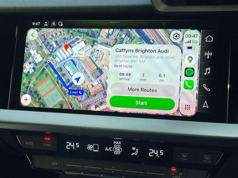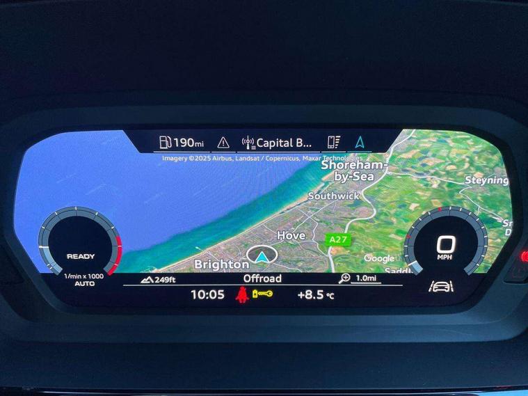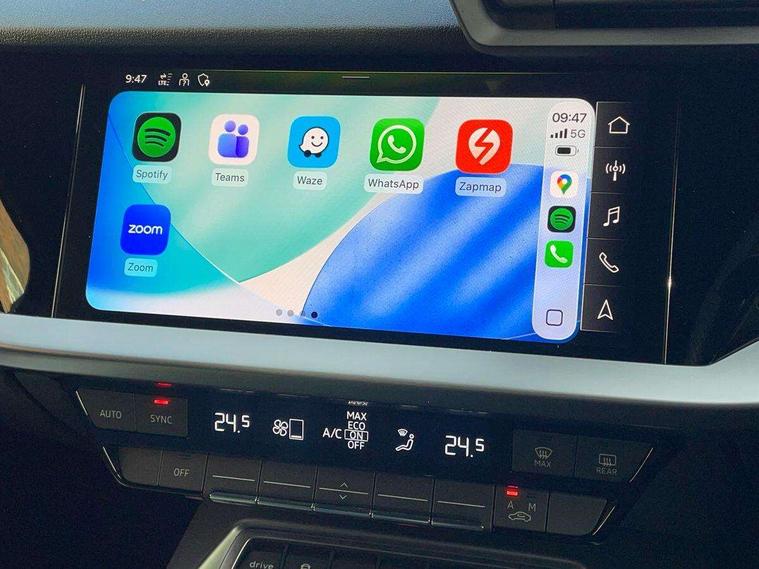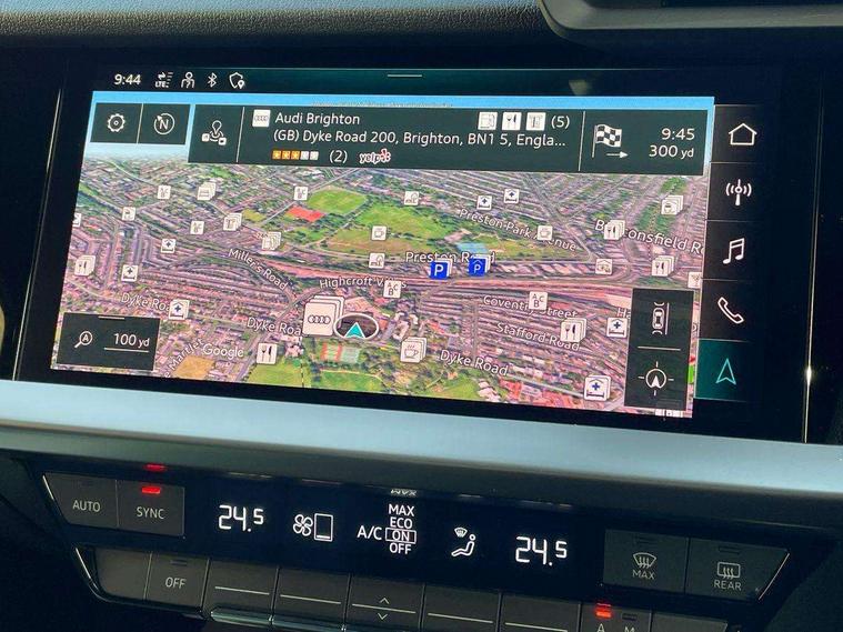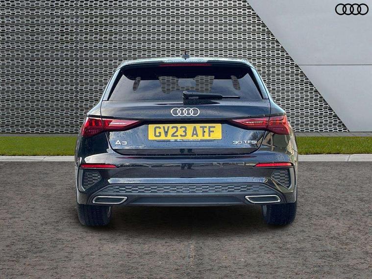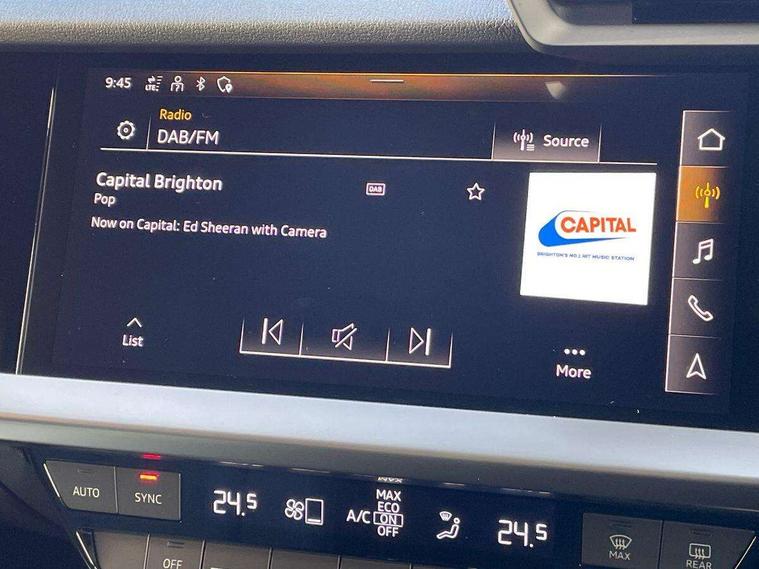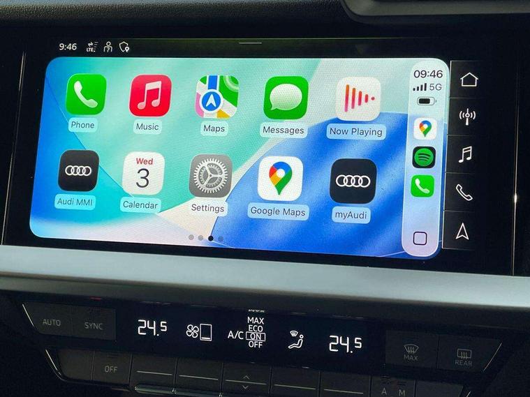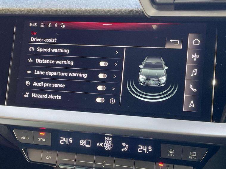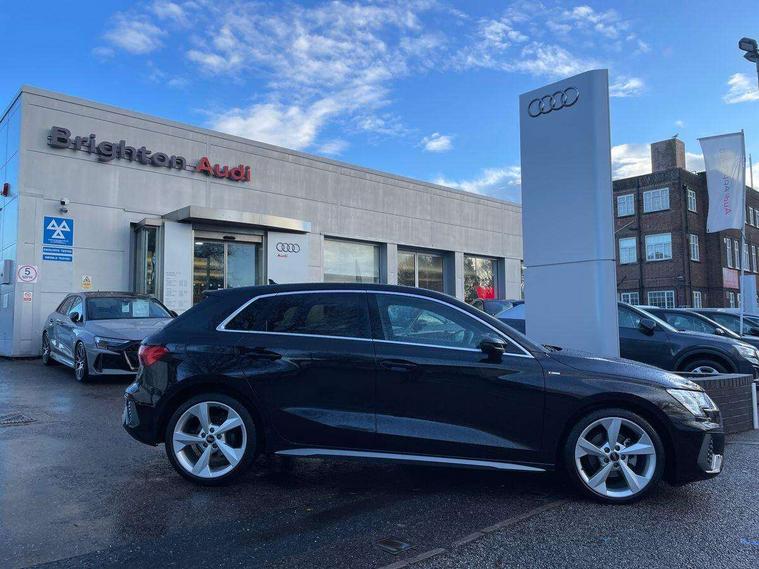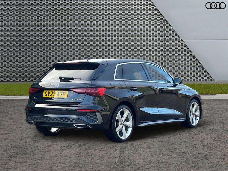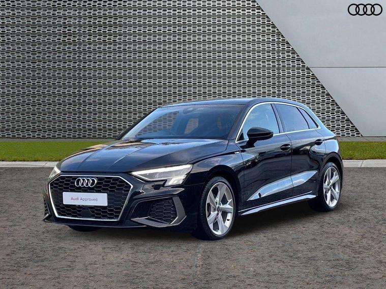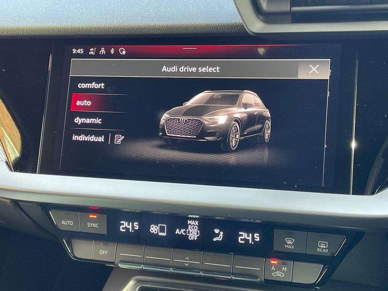 Audi drive select (Auto, Comfort, Dynamic and Individual), Audi smartphone interface, Audi Virtual Cockpit - 10.25" digital and colour instrument cluster, Automatic start/stop system with recuperation, Bluetooth interface, Camera based traffic sign recognition, Collision avoidance assistant, Cruise control, e-Call (emergency call), Electromechanical power speed sensitive steering, Lane departure warning system, MMI Navigation Plus with high resolution 10.1" colour touch screen display, Rear parking sensors, Service indicator, Trip computer, Voice control system with natural language interaction, Sports suspension, 2xUSB-C connection with data and charging functions, 6 passive loudspeakers, DAB Digital radio, 3rd brake light, Acoustic glass windscreen, Aluminium window trim, Auto dimming frameless rear view mirror, Body colour exterior mirrors, Electrically adjustable/heated/folding/auto dimming door mirrors with integrated LED indications + kerb view function for passenger side, Front electric windows, Illuminated aluminium inserts front door sills with S logo, LED daytime running lights, LED headlights with LED rear lights and dynamic rear indicators, Light and rain sensors, Privacy glass - dark tinted rear window, rear door and side windows, Rear electric windows, Rear side air outlets in grained matt black, Rear side wing doors, Rear wiper, S line bumpers, S roof spoiler, 12V socket and storage compartment in front centre console, 3 seat bench in 2nd row, 3 spoke leather multifunction steering wheel, 4 way electrically adjustable lumbar support for driver and front passenger, 60/40 split folding rear seat bench, Black cloth headlining, Dual zone electronic climate control, Front and rear centre armrest in leather, Front and rear headrests, Front/rear floor mats, Height and reach adjustable steering wheel, Interior lighting - glove compartment light and right hand side, Luggage compartment floor covering, Manual boot compartment lid, Manually adjustable front seats, Seat side bolsters, Single front passenger seat, Stainless steel pedals and front footrest in black, Twin leather upholstery with front sports seats S embossed logo, Aluminium interior elements pack - A3 Sportback, LED interior lighting pack - A3 Sportback, S line styling pack - A3 Sportback, 3x3 point rear seat belts, Driver and front passenger airbag with passenger airbag deactivation, Electronic Stabilisation Control (ESC) including ABS, ASR and EDL, First aid kit with warning triangle and 2 safety vests, Front side airbags with head airbags and interaction airbag, Pre-sense front with pedestrian and cyclist detection, Seatbelt monitoring, Tyre pressure loss indicator, Anti theft alarm, Anti-theft wheel bolts, Electronically operated child lock, Immobiliser, Remote control central locking, Dark spectrum aluminium inlays, accent surfaces in the dashboard and centre console in platinum grey silk effect paint finish,