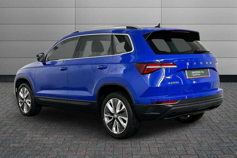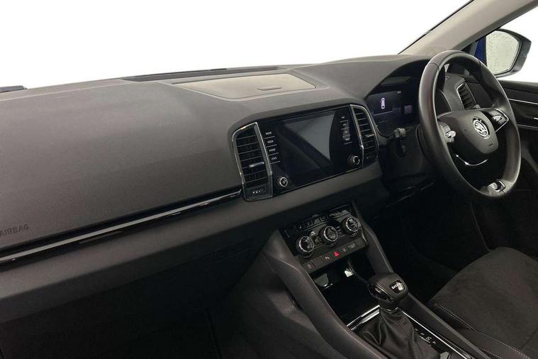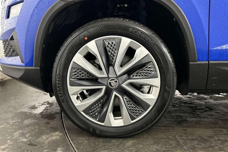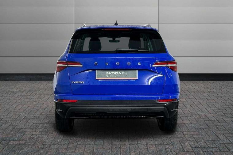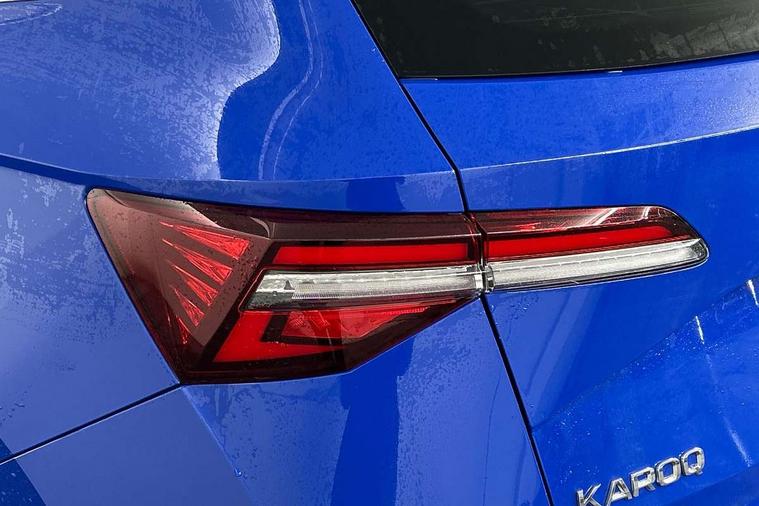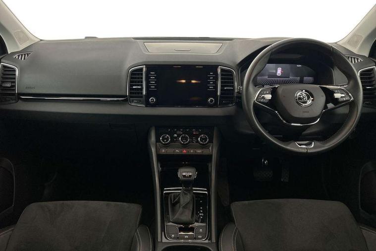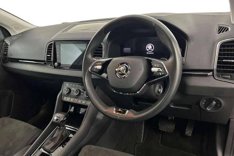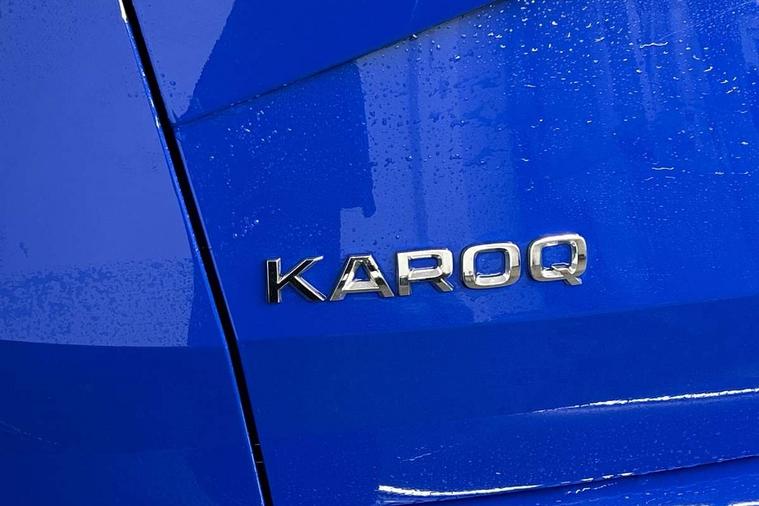 8" Digital display, Care connect, Driver fatigue sensor, Emergency services call system, Outside temperature gauge, Service interval indicator, SmartLink wireless for Apple and wired for Android, Start/stop system with regenerative braking, USB C Port x 2 in front centre console, 8 Speakers, DAB radio with Bluetooth, USB connection, Acoustic glass, Aero front windscreen wipers with intermittent function, Auto dimming rear view mirror with light and rain sensors, Black electric window control buttons, Body colour door mirrors and handles, Dynamic headlight range control with cornering light function, Electric front and rear windows with child proof lock, Heated rear windscreen, LED daytime running lights, LED rear lights with high functionality welcome effect and dynamic indicators, Light assistant (coming/leaving home/tunnel light), Plastic scuff plates, Privacy glass, Rear side wing doors, Rear spoiler, Rear window wiper with washer system and intermittent control, Safety reflectors on front doors, 1.5 litre bottle holders in driver and front passenger door panels, 12V socket in boot, 12v socket in front centre armrest with storage compartment and rear air vents, 2 spoke leather heated multifunction steering wheel with DSG paddles, 2 x Tablet holder, 3 rear height adjustable headrests, 3 seat bench in 2nd row, 4 foldable roof handles with rear coat hooks, Black floor carpet, Chrome inner door handles, Decorative door sills with KAROQ badging, Double sided boot floor, Foldable hooks in the boot, Front head restraints, Height adjustable front three point seats belts with tensioners, Height/reach adjust steering wheel, Ice scraper, Illuminated glovebox, Illuminated luggage compartment, Isofix child seat preparation for front passenger seat, Isofix child seat preparation outer rear, Manual lumbar support for front seats, Pen holder, Pollen filter, Rear boot cover, Rear reading lights, Rubbish bin door, Safety vest holder, Single front passenger seat, Storage box in upper central dashboard closed, Sunvisors with illuminated vanity mirrors, Textile floor mats, Ticket holder, VarioFlex seats with standard rear seat release, Boot pack - Karoq, Chrome roof rails + chrome pack - Karoq, Parking pack - Karoq, Automatic door unlocking in case of crash, Automatic fuel cut off in case of crash, Child locks on rear doors, Driver airbag, Electronic parking brake with auto hold function, Emergency rear braking signal, ESC including ABS, MSR, ASR, EDS, HBA, DSR, RBS, MKB and traction control, Front side airbags, Hill hold control, Knee airbags, Passenger airbag with switch-off function, Pedestrian monitor, Seatbelt reminder signalisation and pretensioner for all seats, Three point seatbelts rear, Two tone horn, Tyre pressure display, Tyre pressure monitor, Alarm with interior monitoring, back up horn and tilt sensor with safe function, Electronic engine immobiliser, Keyless entry and start/stop, Remote central locking with 2 remote folding keys, Chrome framed air vents, 18" Miran alloy wheels in black, Anti-theft wheel bolts protection, Storage on wheel cover, Tool kit,