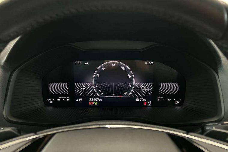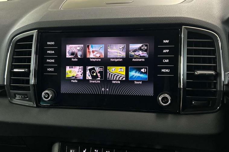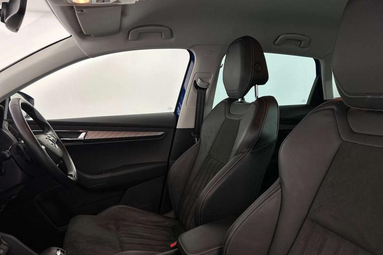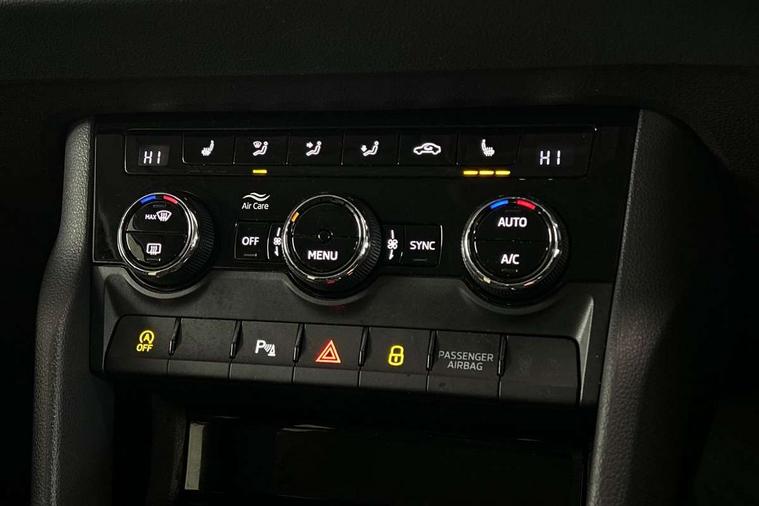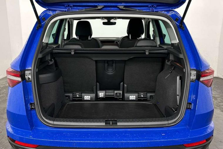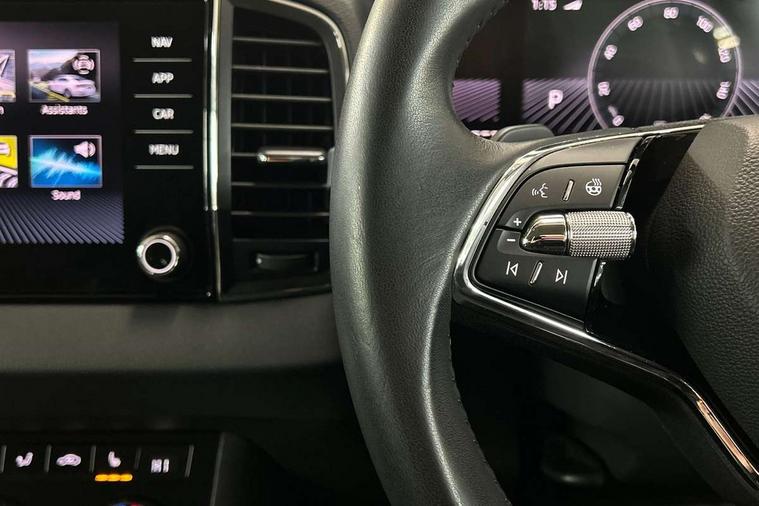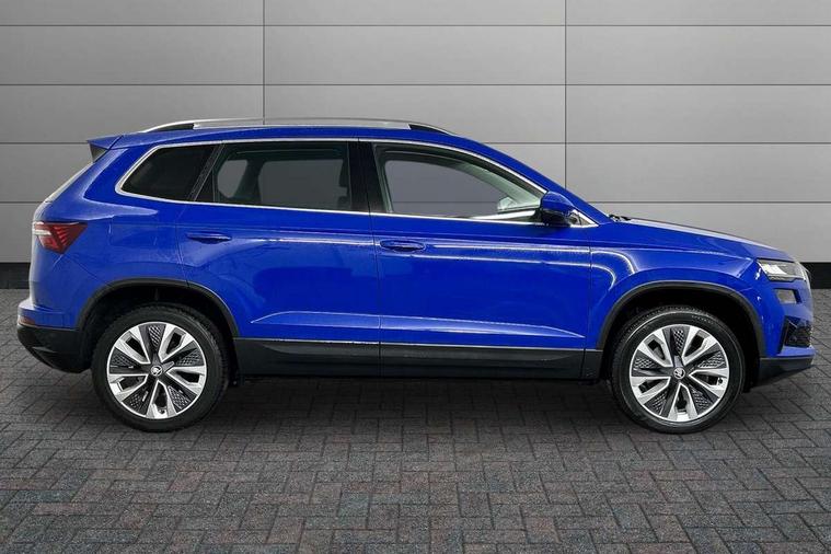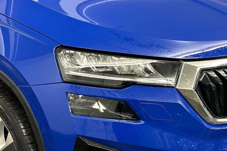 8" Digital display, Care connect, Driver fatigue sensor, Emergency services call system, Outside temperature gauge, Service interval indicator, SmartLink wireless for Apple and wired for Android, Start/stop system with regenerative braking, USB C Port x 2 in front centre console, 8 Speakers, DAB radio with Bluetooth, USB connection, Acoustic glass, Aero front windscreen wipers with intermittent function, Auto dimming rear view mirror with light and rain sensors, Black electric window control buttons, Body colour door mirrors and handles, Dynamic headlight range control with cornering light function, Electric front and rear windows with child proof lock, Heated rear windscreen, LED daytime running lights, LED rear lights with high functionality welcome effect and dynamic indicators, Light assistant (coming/leaving home/tunnel light), Plastic scuff plates, Privacy glass, Rear side wing doors, Rear spoiler, Rear window wiper with washer system and intermittent control, Safety reflectors on front doors, 1.5 litre bottle holders in driver and front passenger door panels, 12V socket in boot, 12v socket in front centre armrest with storage compartment and rear air vents, 2 spoke leather heated multifunction steering wheel with DSG paddles, 2 x Tablet holder, 3 rear height adjustable headrests, 3 seat bench in 2nd row, 4 foldable roof handles with rear coat hooks, Black floor carpet, Chrome inner door handles, Decorative door sills with KAROQ badging, Double sided boot floor, Foldable hooks in the boot, Front head restraints, Height adjustable front three point seats belts with tensioners, Height/reach adjust steering wheel, Ice scraper, Illuminated glovebox, Illuminated luggage compartment, Isofix child seat preparation for front passenger seat, Isofix child seat preparation outer rear, Manual lumbar support for front seats, Pen holder, Pollen filter, Rear boot cover, Rear reading lights, Rubbish bin door, Safety vest holder, Single front passenger seat, Storage box in upper central dashboard closed, Sunvisors with illuminated vanity mirrors, Textile floor mats, Ticket holder, VarioFlex seats with standard rear seat release, Boot pack - Karoq, Chrome roof rails + chrome pack - Karoq, Parking pack - Karoq, Automatic door unlocking in case of crash, Automatic fuel cut off in case of crash, Child locks on rear doors, Driver airbag, Electronic parking brake with auto hold function, Emergency rear braking signal, ESC including ABS, MSR, ASR, EDS, HBA, DSR, RBS, MKB and traction control, Front side airbags, Hill hold control, Knee airbags, Passenger airbag with switch-off function, Pedestrian monitor, Seatbelt reminder signalisation and pretensioner for all seats, Three point seatbelts rear, Two tone horn, Tyre pressure display, Tyre pressure monitor, Alarm with interior monitoring, back up horn and tilt sensor with safe function, Electronic engine immobiliser, Keyless entry and start/stop, Remote central locking with 2 remote folding keys, Chrome framed air vents, 18" Miran alloy wheels in black, Anti-theft wheel bolts protection, Storage on wheel cover, Tool kit,