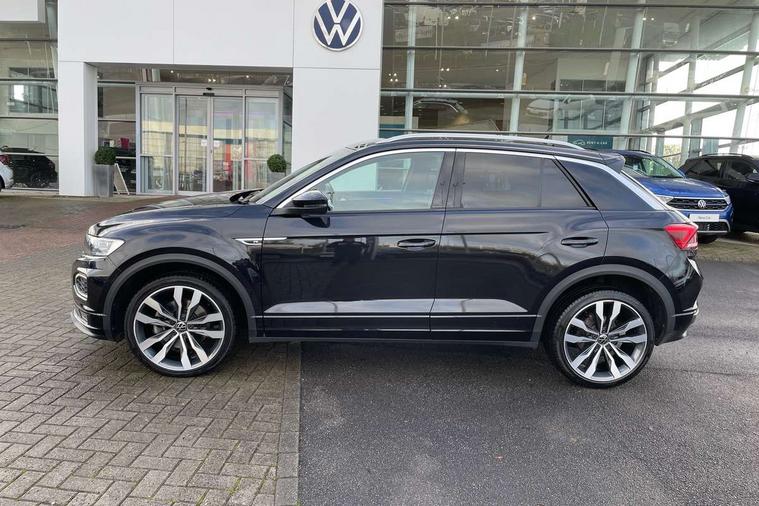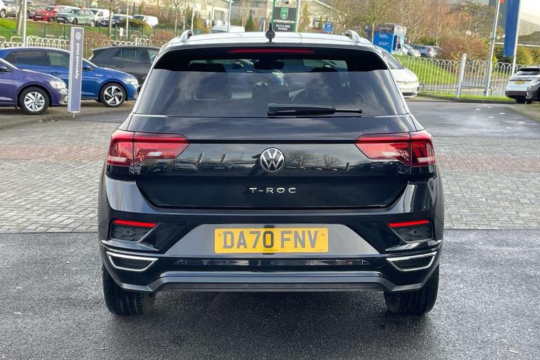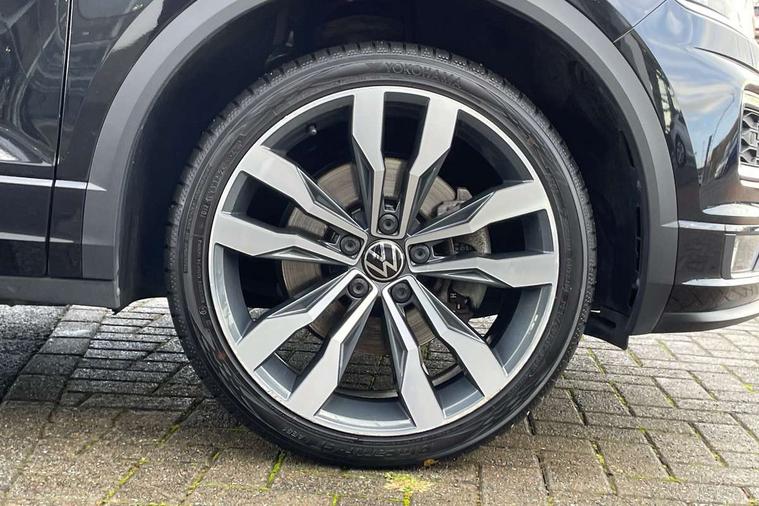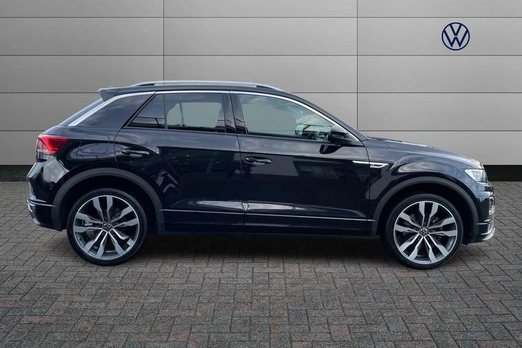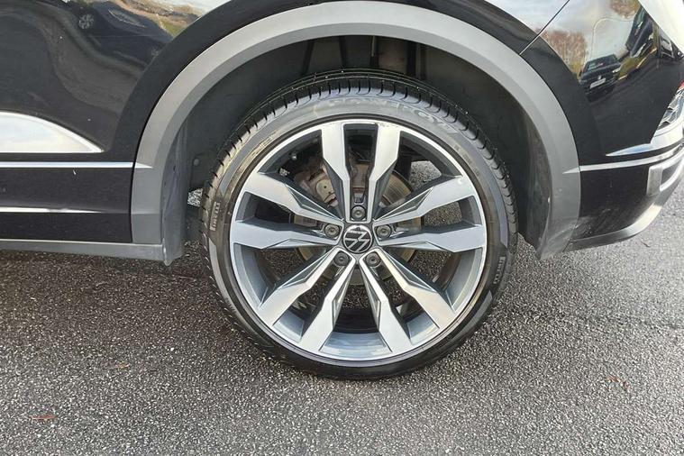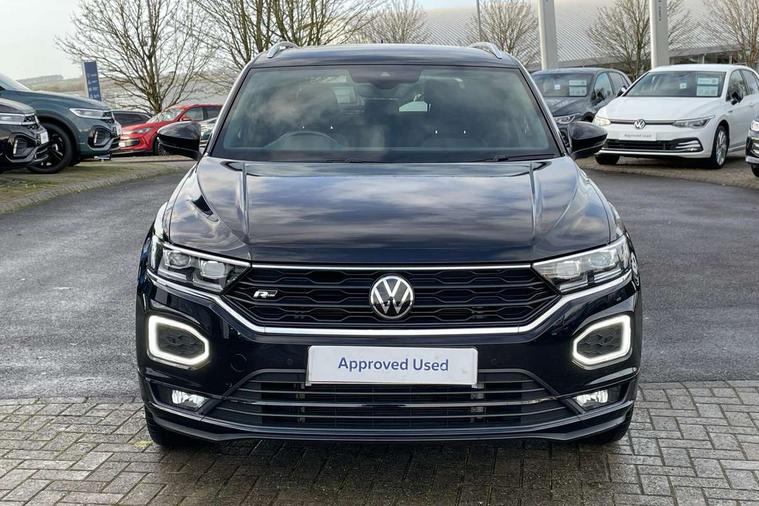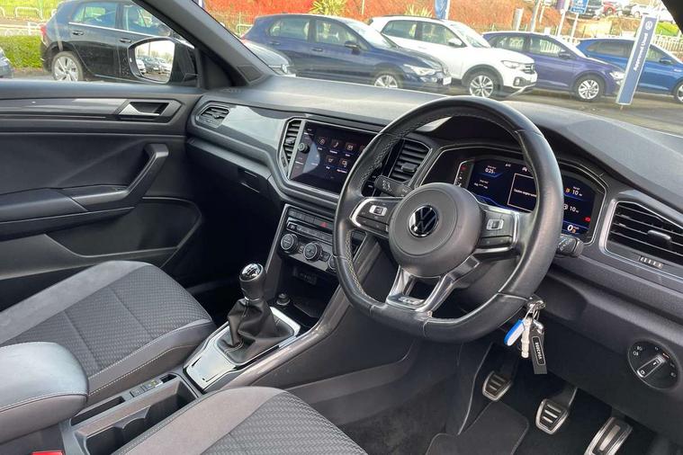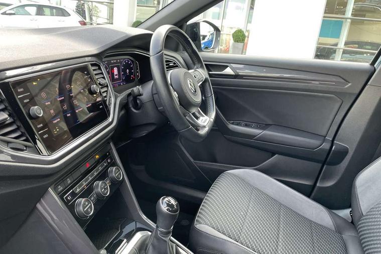 'Lights On' Reminder warning buzzer, Adaptive cruise control with front assist, radar sensor controlled distance monitoring, city emergency braking, Automatic start/stop system, Bluetooth telephone and audio connection for compatible devices, Car information display, Digital Cockpit Pro - Active info display, Discover navigation including 8" touch screen display, streaming and internet, Driver alert system with audible and visual fatigue detection system, Driver tips and journey analysis, Lane assist with warning text instrument cluster, Modified key software - reduce switch off time for key status change to Long no motion, Multifunction computer with visual gear change recommendation for fuel consumption, Service interval indicator, Think blue trainer driver tips and journey analysis, Voice activation, Wireless app connect for apple carPlay, Battery regeneration during braking, Centre arm rest including USB type C interface and USB charging socket, DAB Digital radio, Diversity antenna for FM reception, Front USB type C Interface 2X and USB charging socket, Music playback - MP3, WMA and AAC files, Premium USB cable in choice of either Apple or Android smartphone compatibility, SD card slot, Simultaneous pairing of 2 compatible mobile devices, SMS functionality - read, compose and send SMS messages using touch-screen display, Storage compartment with longitudinal and height adjustable in armrest and two rear air vents, Three route options - Fast, Short, Eco, Title and cover art display, Auto dimming interior rear view mirror, Automatic hazard lights activation under emergency braking, Black grained lower door protectors, Body colour door handles, Body colour rear roof spoiler, Chrome effect left and right trapezoid exhaust tailpipe fascia surround, Chrome trim on upper and lower radiator grille, Dusk sensor, Electrically foldable, adjustable and heated door mirrors with puddle lights and reverse activated kerb-view adjustment on passenger's door mirror, Front and rear electric windows, Front fog lights with static cornering function, Front windscreen wiper with intermittent wipe and 4 position delay, Fully galvanised body, Heated rear window, High level 3rd brake light, LED darkened rear light clusters, LED dipped and main beam headlights with automatic range adjustment including signature LED daytime running lights, LED rear number plate lights, Manual coming/automatic leaving home lighting function, Rain sensor, Rear tinted glass from B-pillar backwards approx 65% tinted, Rear wash/wipe with intermittent wipe setting, Volkswagen roundel, 2 Front and rear reading lights incorporating LED technology, 3 rear head restraints, 4 load lashing points in luggage compartment, Aluminium pedals, Ambient lighting in front footwell and light strips below trim in front doors, Black roof lining and sun visors, Branded points of interest, Carbon flag cloth upholstery, Climate control - 2 zone electronic air conditioning with automatic air recirculation and allergy filter, Drawer under drivers seat, Front + rear carpet mats, Front cupholders x 2, Front seat back storage pockets, Front sports seats with R-Line logo on seat backrest, Glovebox, Height adjustable front seats, Height/reach adjust steering wheel, Illuminated vanity mirrors, Instrument lighting, white adjustable panel illumination, Interior light delay, Isofix easy fit child seat preparation for 2 outer rear seats, Load through provision with single cup holder when folded down, Luggage compartment cover, removable, Luggage compartment lighting, R Line badge, Split folding rear seat backrests with centre armrest, Storage compartment in left and right luggage area, Storage compartment in rear doors, Storage compartments in driver and front passenger doors, Three spoke multi-function leather trimmed steering wheel and gearknob, Unique R Line door sill protectors, R line styling pack - T-Roc, Winter pack - T-Roc, 3 rear three point seatbelts, ABS, Curtain airbags, Driver and front passenger safety-optimised head restraints, Drivers and front passengers airbags with passengers deactivation switch, Drivers seatbelt reminder, Electronic parking brake with auto hold, Electronic stability control (ESC) includes ASR, EDL, EDTC and trailer stabilisation function, Front seat side impact airbags, Predictive pedestrian protection, Rigid safety cell with front and rear crumple zones, Three point height adjust front seatbelts + pretensioners, Tyre pressure loss indicator, Ventilated front and rear disc brakes, Volkswagen roadside assistance, Alarm with remote central locking and interior protection, Electronic engine immobiliser, Remote central locking with 2 remote folding keys, Shadow grey decorative inserts in dash and door panel, 19" Suzuka alloy wheels with low rolling resistance tyres and anti wheel bolts,
